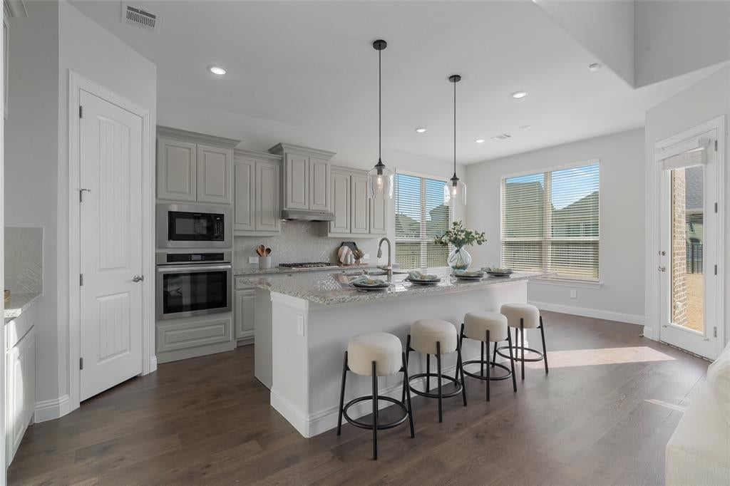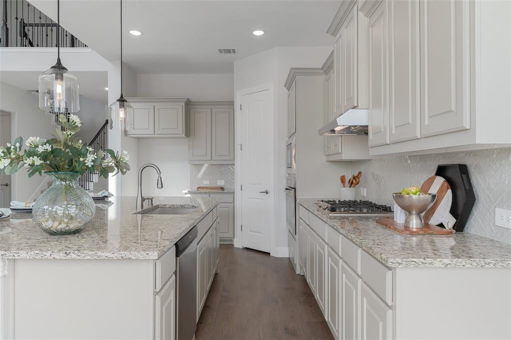 Step inside and let the warm wood floors guide you through an open-concept living area, where natural light floods through oversized windows. The gourmet kitchen is a chef’s dream—an expansive island, gleaming granite countertops, stainless steel appliances, a gas cooktop, and a walk-in pantry create the perfect setting for culinary creativity.