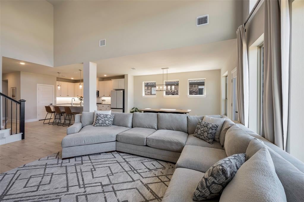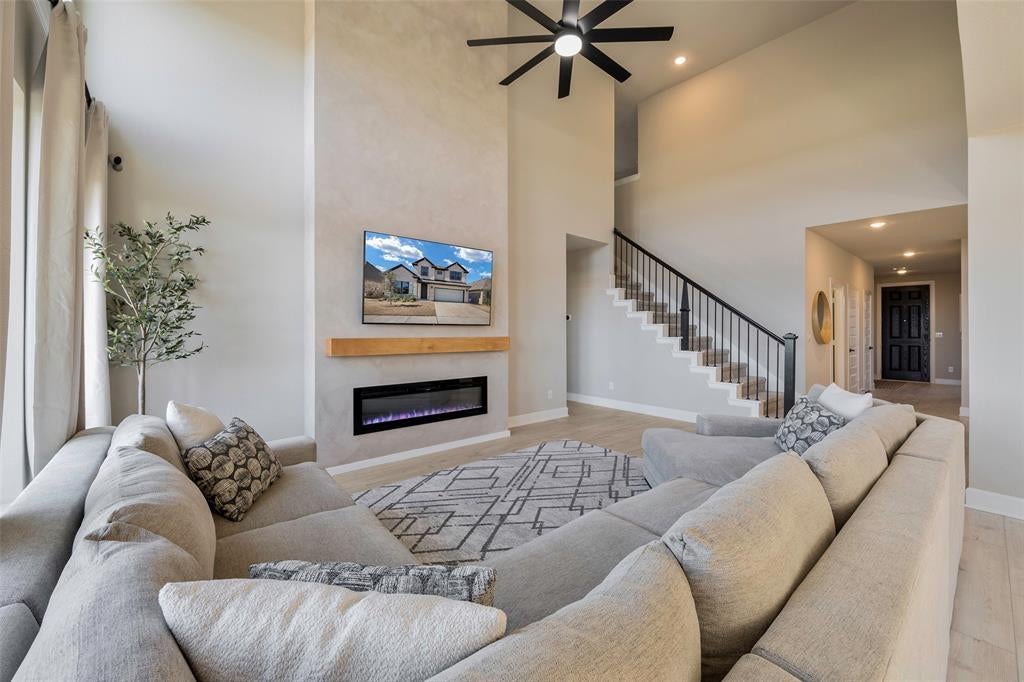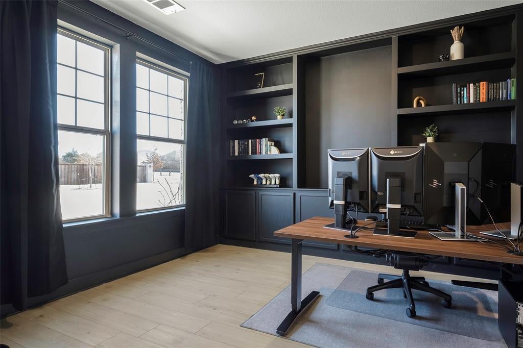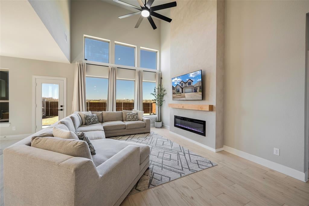 Welcome to this stunning custom David Weekley home, nestled on one of the most exclusive lots in the neighborhood. Boasting every imaginable upgrade, this property features soaring ceilings with expansive windows that fill the space with natural light. An electric fireplace that extends to the ceiling, creating a striking focal point. The home also offers a spacious office with custom built-in shelving and numerous other high-end finishes throughout.
