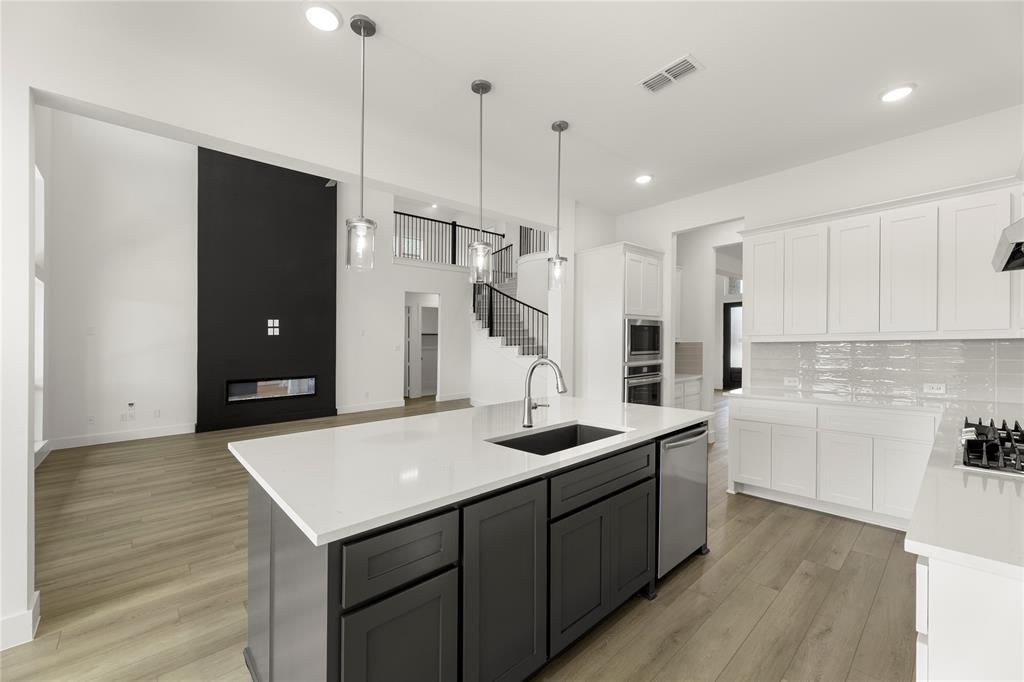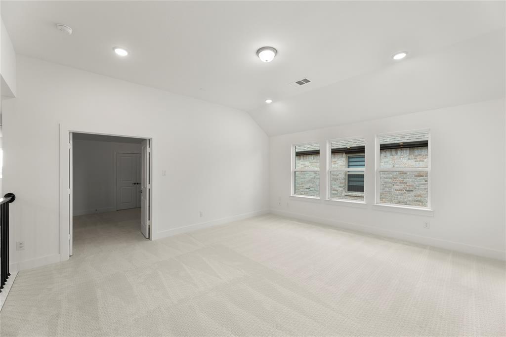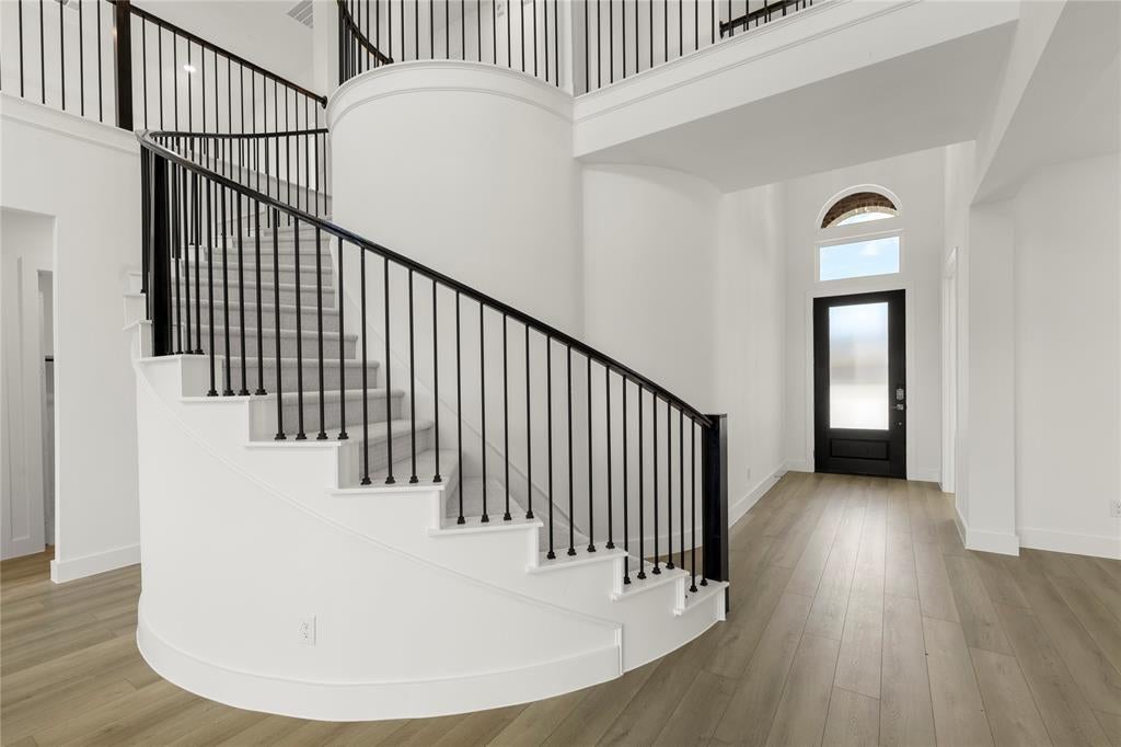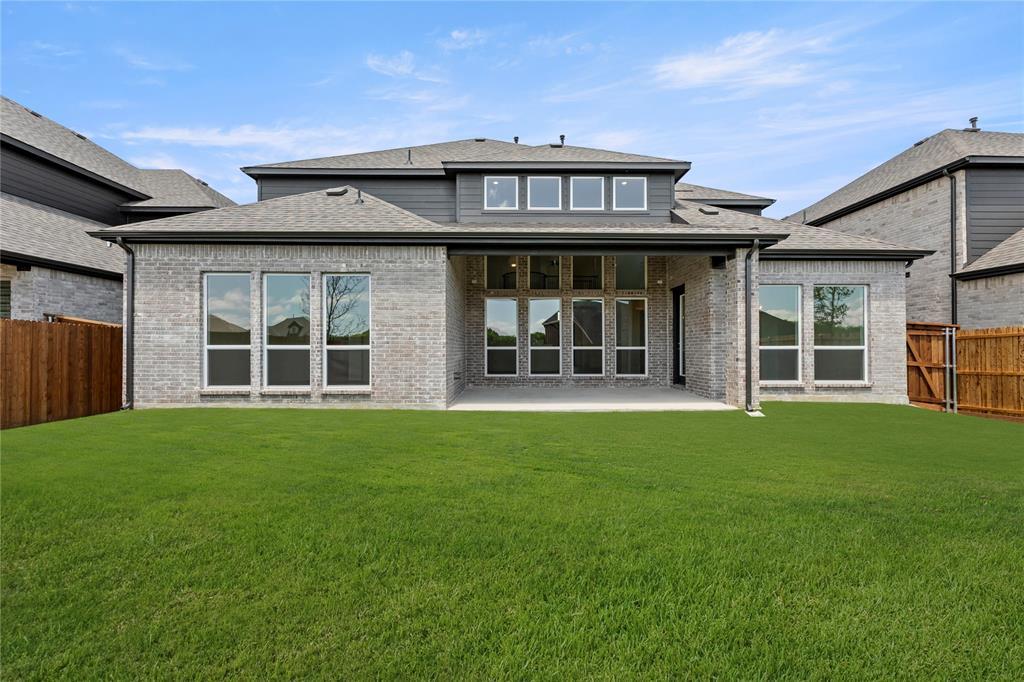 MLS# 20879069 - Built by First Texas Homes - Ready Now! ~ Step into luxury with this beautifully designed home, perfectly nestled in a quiet cul-de-sac. From the moment you arrive, you'll notice the upgraded brick and mortar, an elegant front door, and a grand raised family room ceiling for an open and airy feel. The fireplace extends to the ceiling, adding warmth and sophistication. Inside, enjoy the seamless flow of luxury vinyl plank flooring throughout the main living areas, including the entry, extended entry, study, flex room, family room, kitchen, nook, pantry, hallway, and primary suite. The curved staircase makes a statement with its wood starter step , while a floor plug in the family room adds convenience. The gourmet kitchen is a chef’s dream, featuring shaker-style cabinetry with extra storage up to the ceiling , gleaming quartz countertops , and a trio of stylish pendant lights. An extended dining room adds even more space for hosting memorable gatherings. The primary suite exudes elegance with framed mirrors and spa-like finishes, while the media room sets the mood with custom sconces. Step outside to a beautifully upgraded patio , perfect for outdoor entertaining. Every detail of this home has been carefully curated for style and function—schedule a tour today and experience it for yourself!