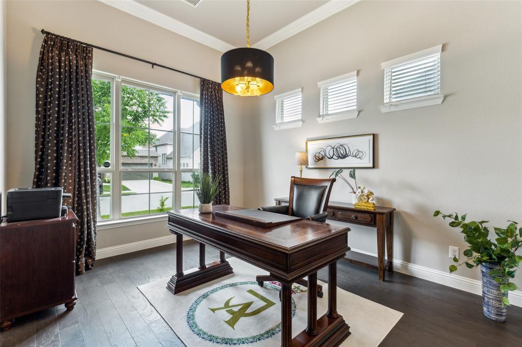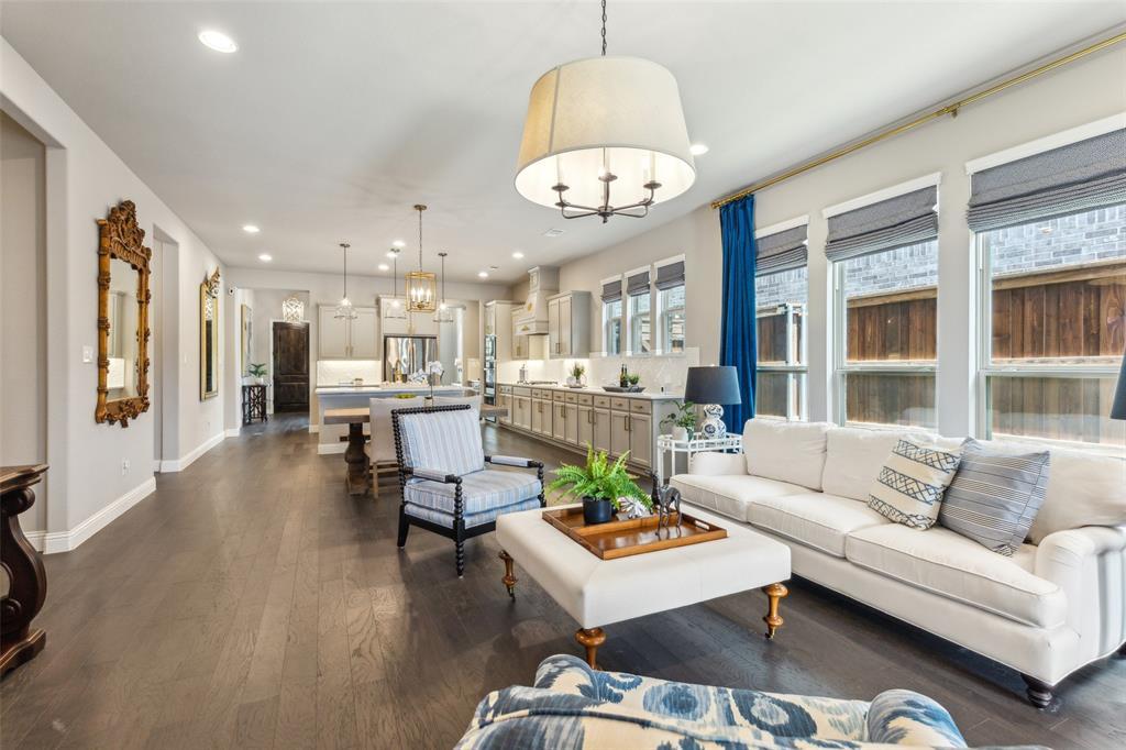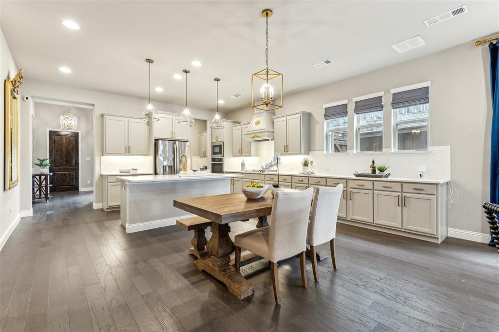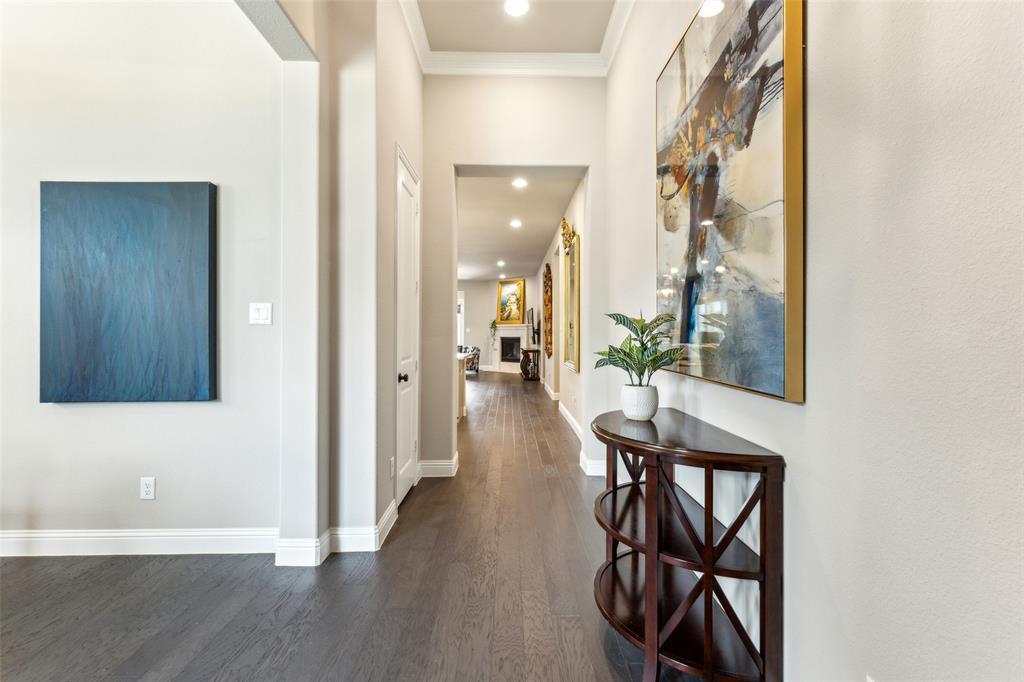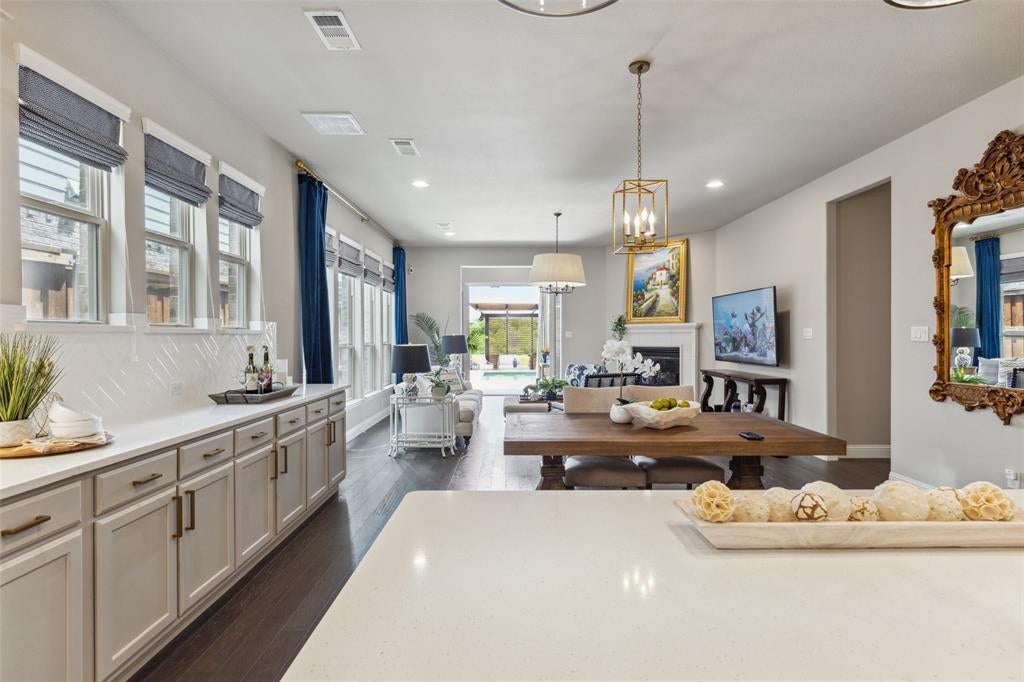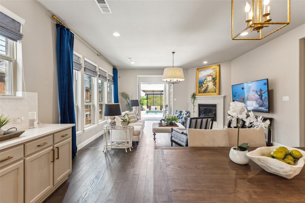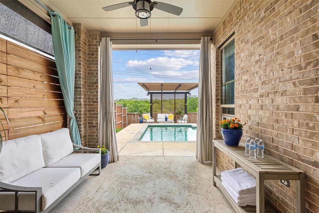This beautifully appointed one-story home blends timeless design with modern functionality. The stone-and-brick exterior sets the tone for what’s inside - an elegant and open interior layout featuring engineered hardwood flooring and generous natural light throughout. Step into a welcoming foyer that flows into a versatile front room, perfect for a home office or formal dining space. The gourmet kitchen is a chef’s dream, equipped with GE Profile stainless appliances including a 5-burner gas cooktop with vent hood, double ovens (convection lower), microwave, dishwasher and refrigerator (negotiable). Light gray cabinetry with brushed gold hardware, a Vigo gold faucet, white quartz countertops, and a herringbone tile backsplash add a designer touch. Pendant lighting highlights the oversized island, while the adjacent coffee bar and butler’s pantry offer extra prep and storage space. The open-concept dining and living areas are ideal for entertaining, featuring a gas-log fireplace and French doors leading to a covered patio with gas hookup for grill and curtains. Step outside to your private backyard oasis with a stunning custom gunite pool, cast stone coping, and a steel and wood cantilever pergola with lighting, fans, and electrical - great for relaxing or hosting. The primary suite offers tray ceilings and a spa-like bath with a glass-enclosed tile shower, soaking tub, dual sinks, and a walk-in closet. Two additional bedrooms, including one currently used as a fitness room, share a hall full bath with a glass & tile shower. Additional highlights include recessed lighting, laundry with drying rack, Rheem tankless water heater, RainBird sprinkler with rain delay, and an 8ft cedar board-on-board privacy fence. Located in a quiet neighborhood, this home perfectly blends comfort, style, and convenience. Community offers a large playground area and is conveniently located to local amenities, including restaurants, shops, Las Colinas Country Club & DFW airport.