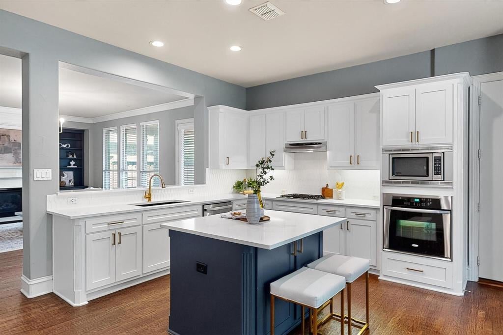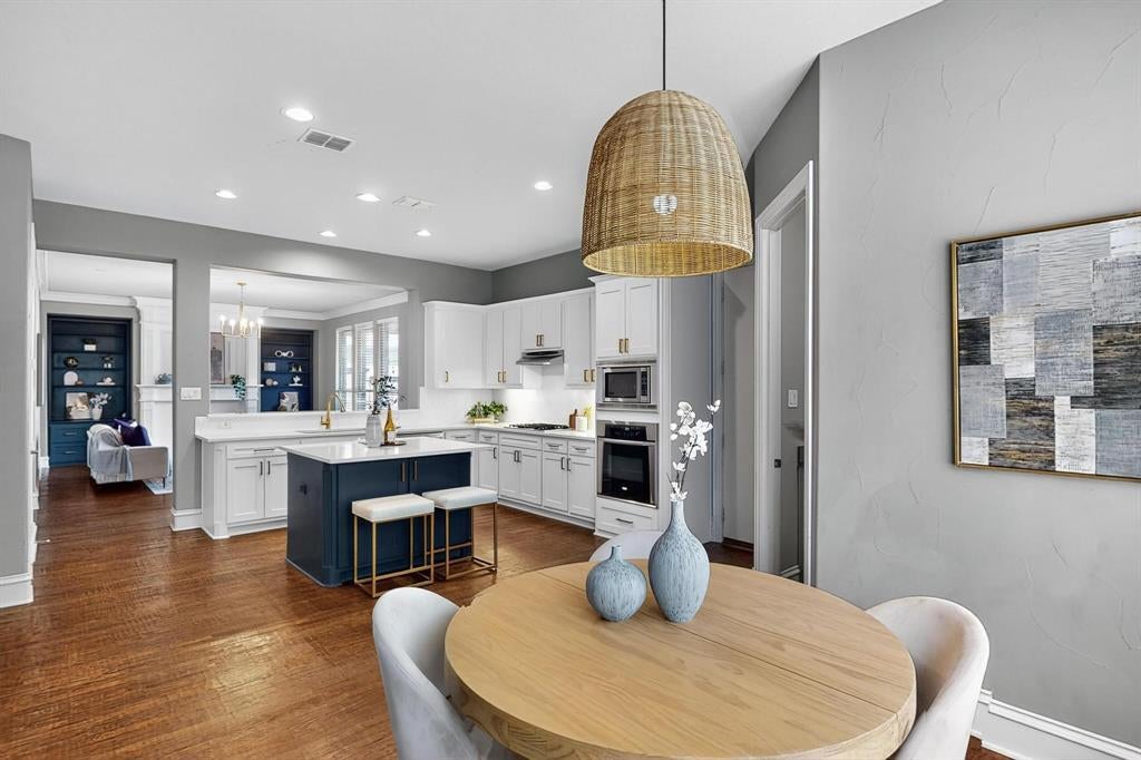 Glide across rich hardwood floors into the heart of the home: a gourmet kitchen that feels straight from a design magazine. This high-end hub of the home features an oversized island, contemporary finishes, and open-concept layout to make this a true entertainer’s dream. The sizable adjoining breakfast nook and inviting living room — complete with bespoke built-ins and a dramatic custom fireplace mantel — invite harmony and grace in the home.