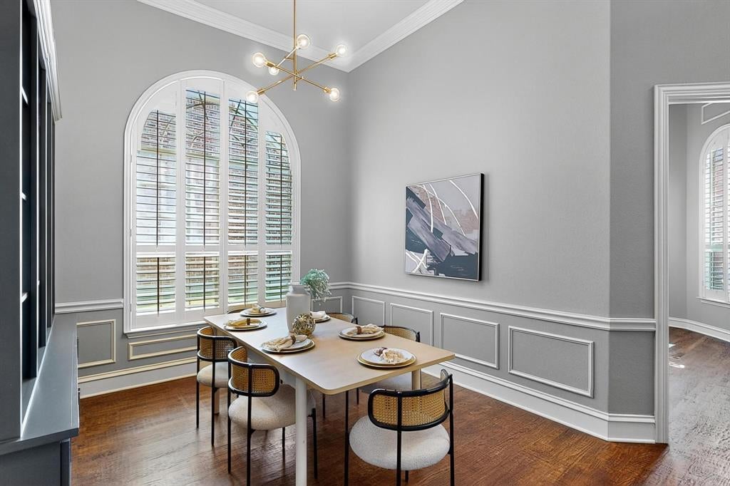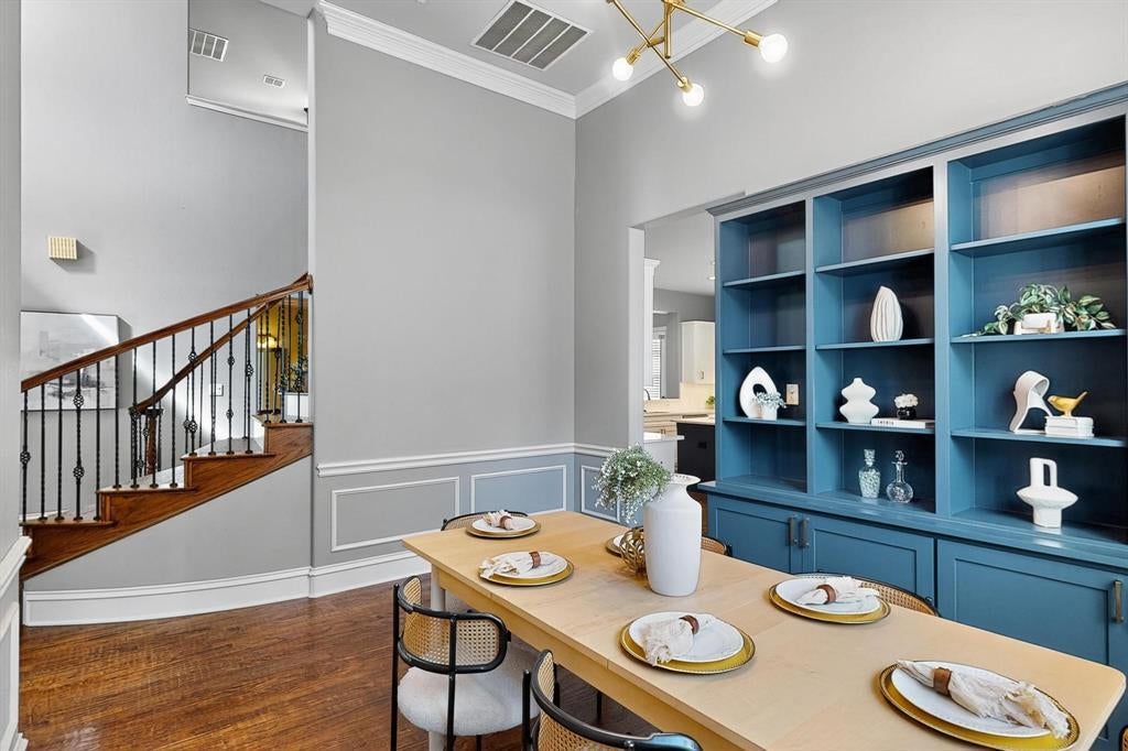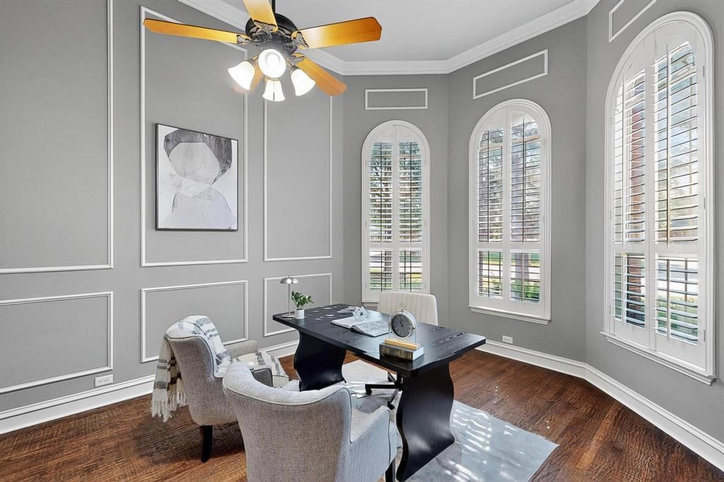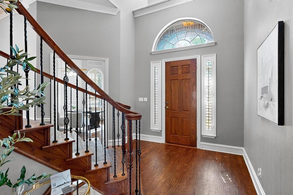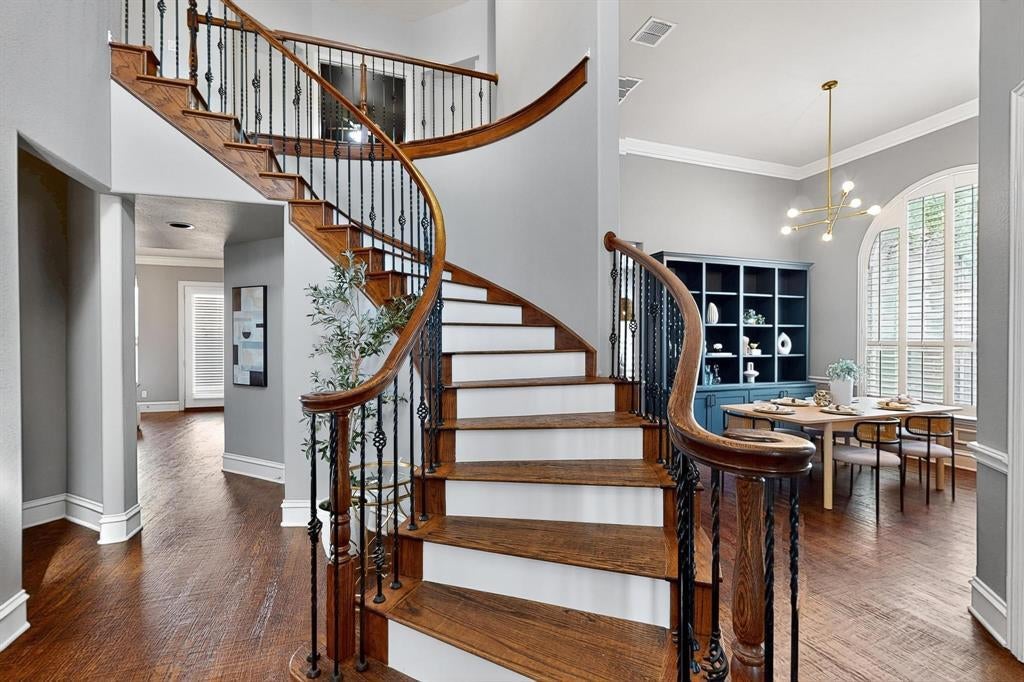 Step through the front door and into a world of timeless elegance and tailored luxury in this custom-crafted Drees home in Waterford Parks. A sweeping grand staircase sets the tone in the soaring two-story foyer, flanked by the home’s refined formal spaces — a stately study behind French doors and a dining room outfitted with a sleek built-in buffet, ready to host candlelit dinners and family holidays.