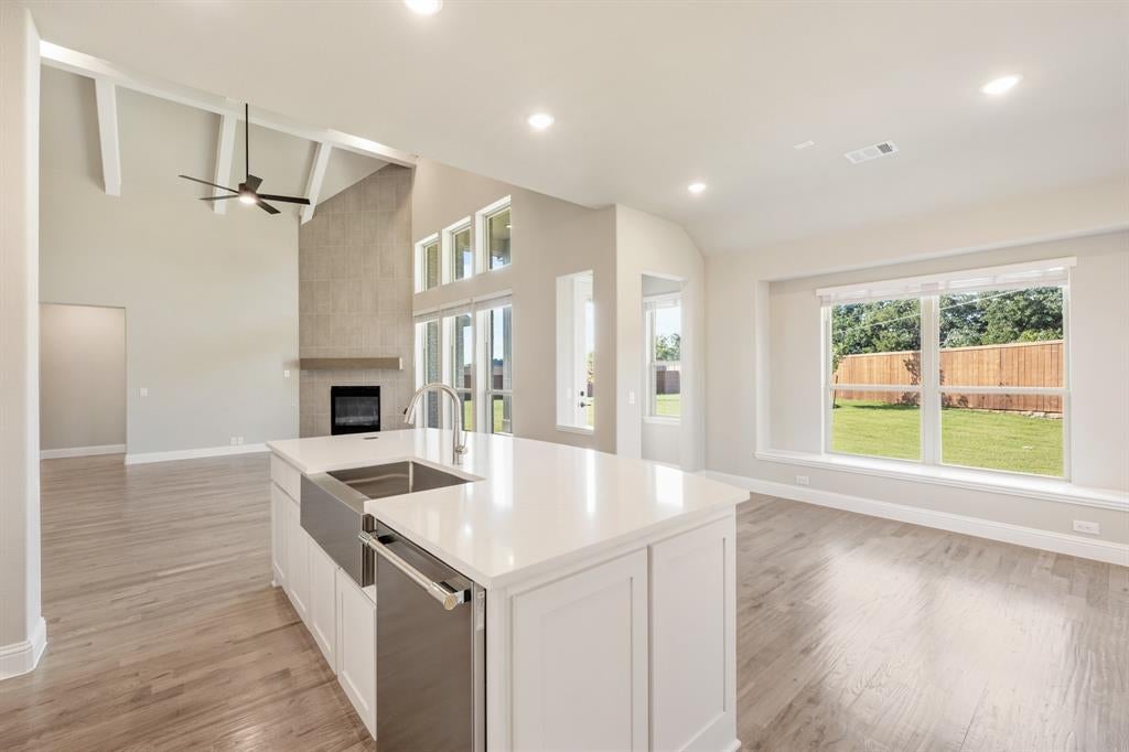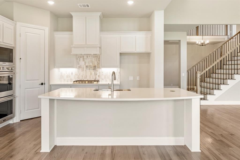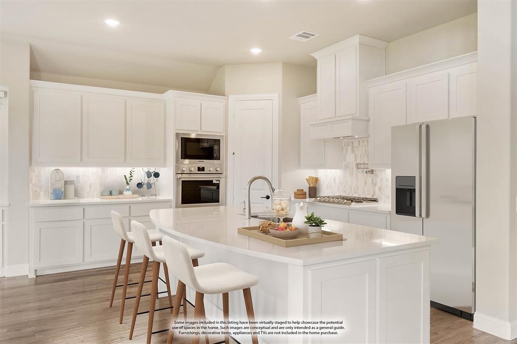 Breakfast Bar, Built-in Cabinets, Eat-in Kitchen, Farm Sink, Kitchen Island, Pantry, Walk-in Pantry, Water Line to Refrigerator, Solid Surface/Non-Natural Type
