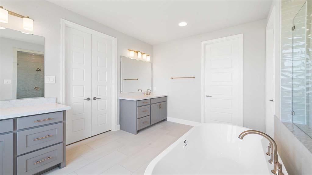 MOVE-IN READY! Two-story entry framed by home office with a French door entry. Formal dining room just off the family room and kitchen. Generous two-story family room with 19-foot ceilings, a fireplace and a wall of windows. Island kitchen features built-in seating space, a two-story ceiling and a large walk-in pantry. Morning area just off the kitchen with three large windows. Secluded primary suite offers a large bedroom with a wall of windows, French doors that open to the primary bathroom, dual vanities, freestanding tub, separate glass enclosed shower and two walk-in closets with private access to the utility room. Guest suite with full bathroom and a walk-in closet on first floor. Second floor hosts a large game room, Media room with a French door entry, additional bedrooms with walk-in closets, a guest suite with full bathroom, a Hollywood bathroom and half bathroom. Covered backyard patio. Mud room just off the two-car garage.