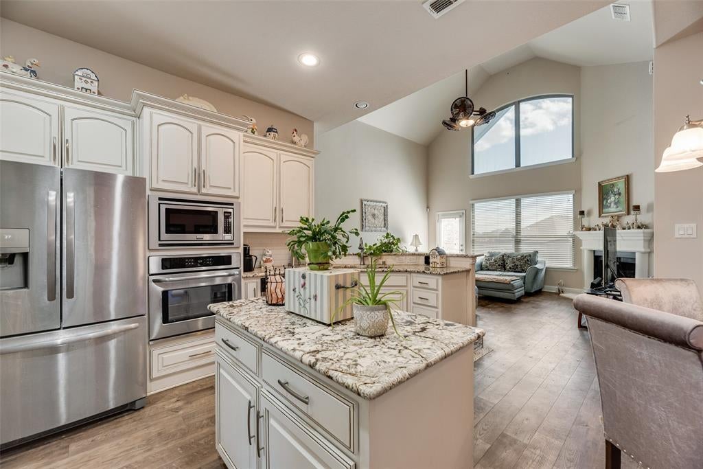 Step inside to an open-concept floor plan filled with natural light, featuring soaring ceilings and a living area anchored by a cozy fireplace. The kitchen is a true centerpiece—complete with stainless steel appliances, built in ovens, a large island, granite countertops, and abundant cabinetry, perfect for everyday meals and entertaining alike.