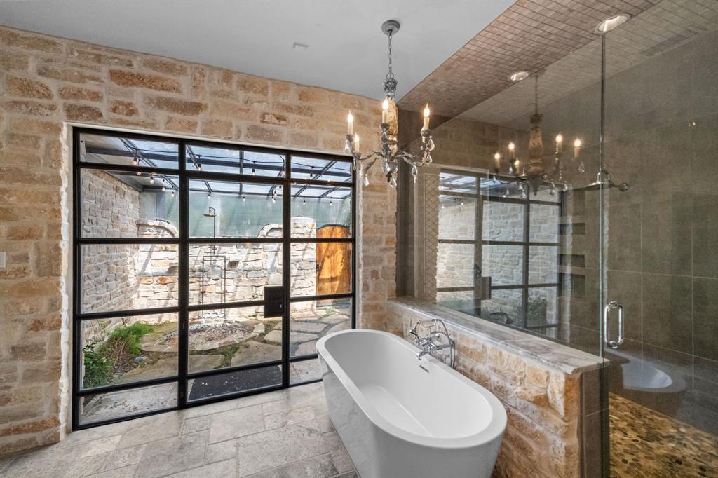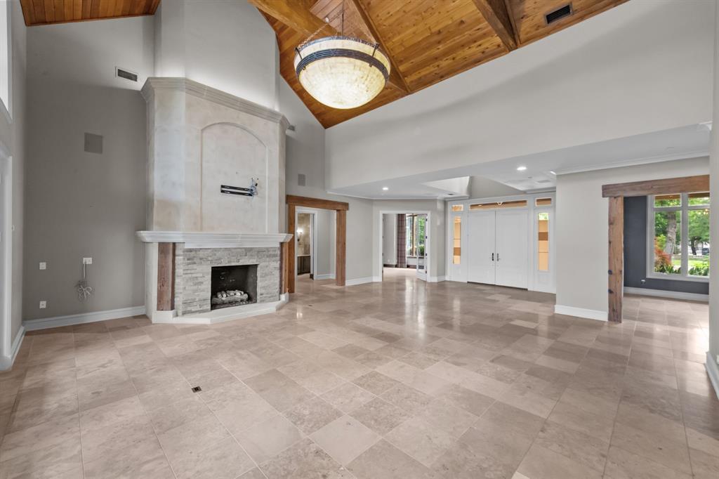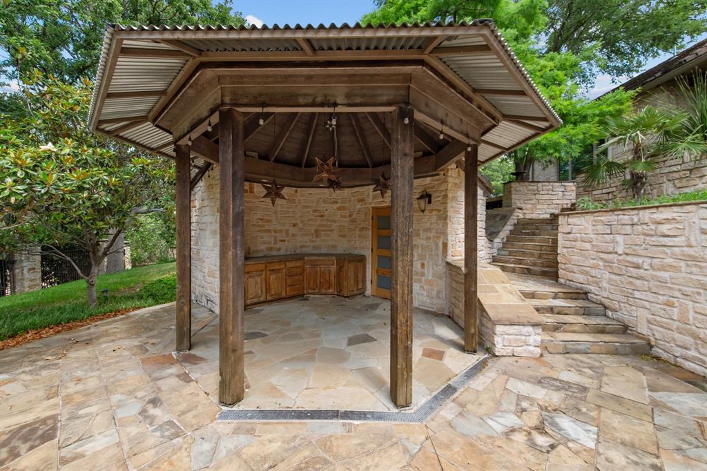 Welcome to an extraordinary hilltop estate nestled on over 2 acres in the prestigious and gated Estates on Rush Creek. Designed to impress while offering complete comfort, this home is perfectly positioned to capture breathtaking panoramic views and deliver a lifestyle of privacy, luxury, and ease. At the heart of the home is a chef’s kitchen outfitted with high-end appliances, generous prep space, and seamless flow into both casual and formal dining areas—ideal for hosting or everyday living. A spacious living area anchors the main level, highlighted by soaring ceilings with exposed wood beams and a dramatic stacked stone fireplace that brings warmth and character. The primary suite is a true retreat, offering an oversized bedroom, boutique-style closets, and a spa-like bath featuring heated floors, a built-in coffee bar, and direct access to a private patio. Just off the bath, a secluded courtyard with an outdoor rain shower enhances the resort-style experience. Two separate offices provide an ideal work-from-home setup with privacy and peace. Downstairs, a finished walk-out basement includes a full kitchen, bedroom, and full bath. With two additional bedrooms and two full and two half baths throughout the home, there’s space and comfort for everyone. Step outside and you'll discover an entertainer’s paradise: lush landscaping surrounds a sparkling pool and spa, alongside a cabana complete with a half bath. Whether relaxing in the sun, hosting guests, or enjoying a quiet evening, the backyard offers a sense of retreat that feels more like a private resort than a residence. Additional features an elevator, tornado shelter, and a stone wall encircling the property elevate both convenience and security, making this estate as functional as it is beautiful. This is luxury living at its finest, blending elegance, comfort, and a prime location into one unforgettable property.