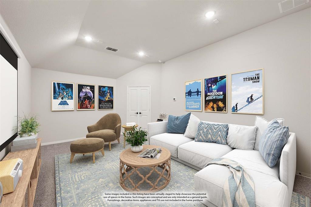 BRAND NEW & NEVER LIVED IN! READY to Move-In NOW! Introducing Bloomfield's Primrose FE VI floor plan, a stunning two-story home with a brick and stone facade and charming cedar garage doors that enhance its elegant curb appeal. This thoughtfully designed layout offers 5 bedrooms and 4.5 baths, with bedrooms thoughtfully positioned on both levels for added flexibility. Step through the custom 8' Front Door into a grand Rotunda Entry, where full oak stairs and stained beams in the Family Room immediately elevate the architectural presence. The Formal Dining area and private Study are perfect for entertaining or working from home, while the spacious Family Room impresses with soaring vaulted ceilings and a dramatic stacked Stone-to-Ceiling Fireplace crowned by a cedar mantel. The Deluxe Kitchen caters to every culinary need, offering Quartz and Granite counters, stainless steel built-in appliances, pot and pan drawers, a custom wood vent hood, and ample cabinetry, all complemented by durable Wood-look Tile flooring that continues throughout the open common areas. Upstairs, a Game Room and Media Room offer flexible living space, while the mud room adds daily convenience with thoughtful storage solutions. A 3-car garage provides generous parking and storage, and outside, a gas stub on the patio is perfect for grilling on weekends. Located on an interior lot in the vibrant Stone River Glen community, residents also enjoy access to unique amenities like a volleyball court and golf club—don’t miss your chance to call this exceptional home yours!