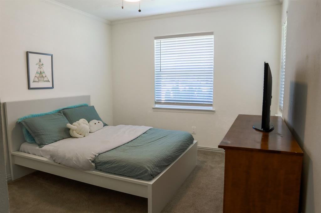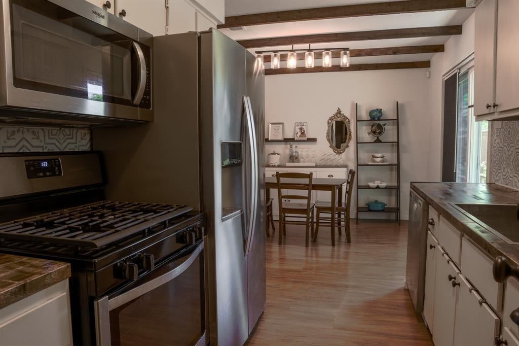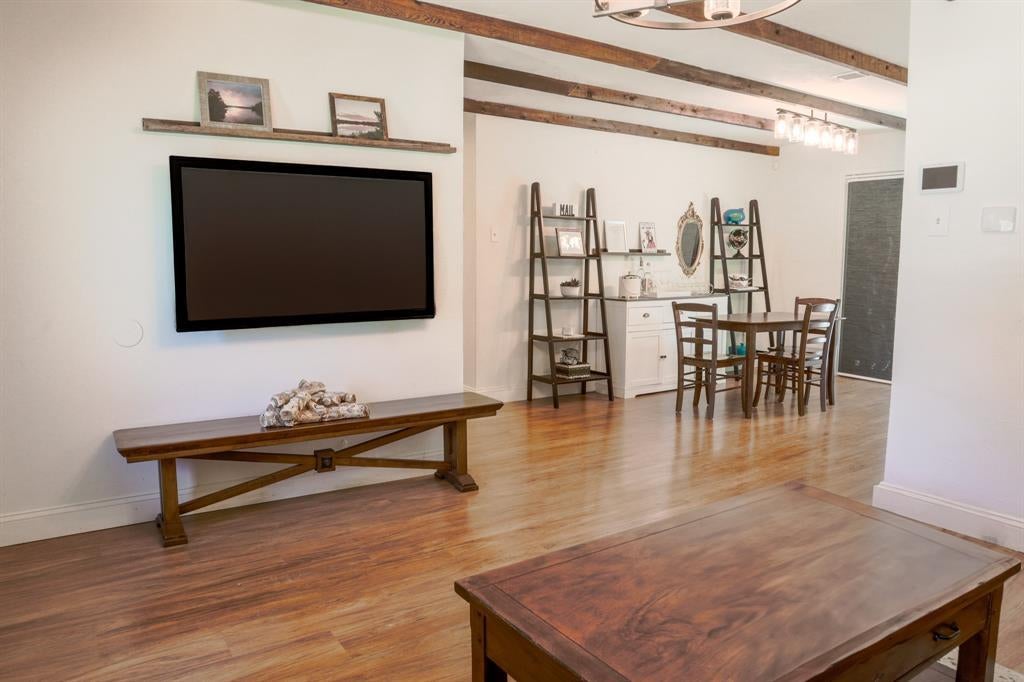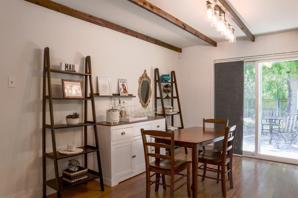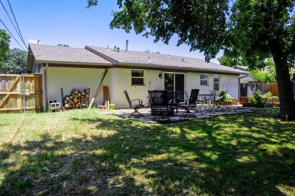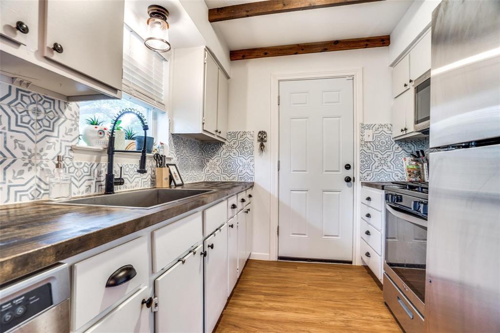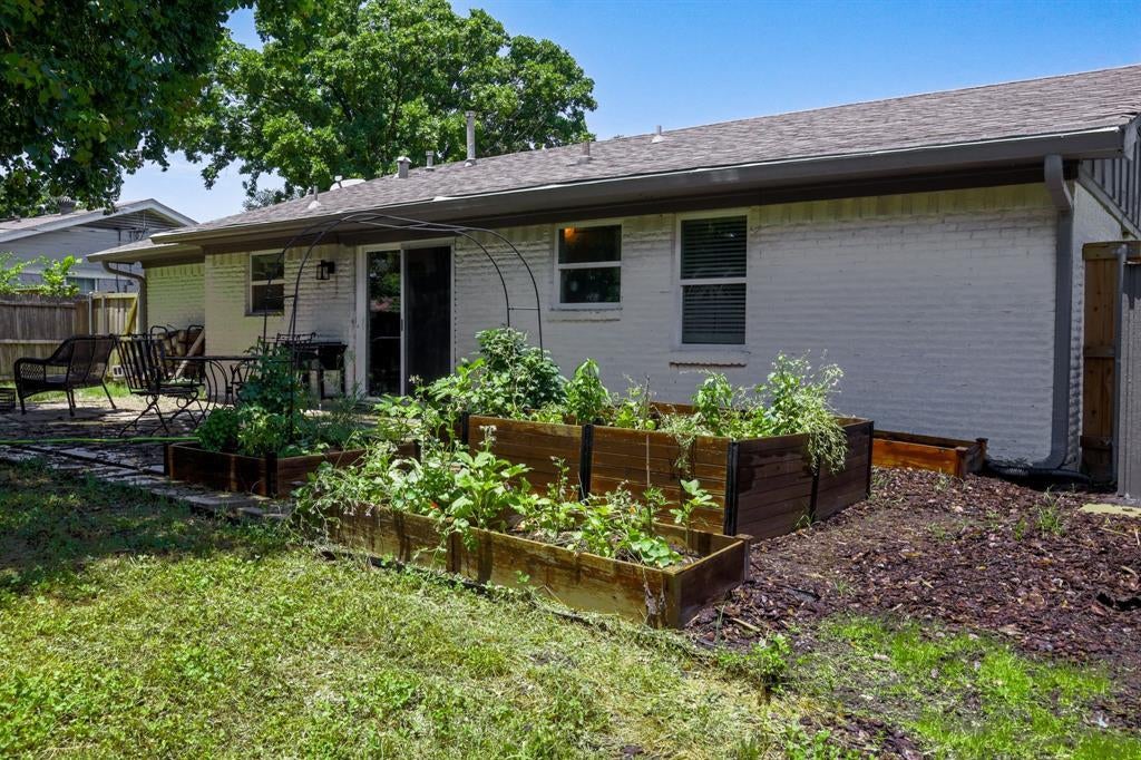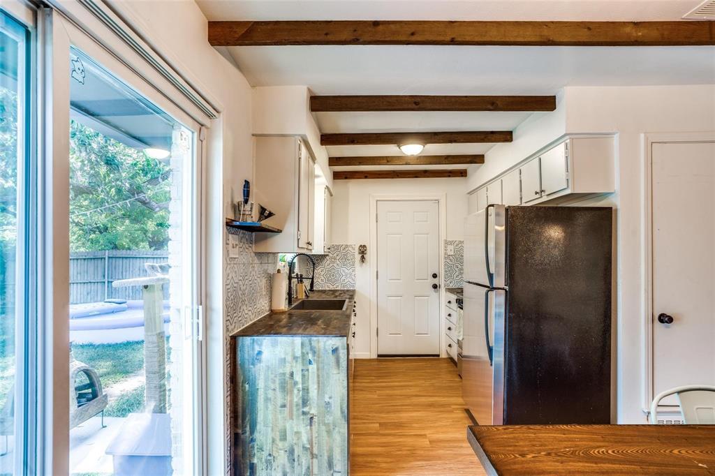 This charming and cozy home features an open floor-plan with cedar beams, butcher-block countertops, stainless steell applicances, decorative tile in kitchen and bathrooms. The large sliding glass door provides plenty of natural light and leads to the oversized backyard and patio. The garage can be used as either a garage but also has great storage options with plenty of shelving. Home is close proximity to shopping, dining and easy access to I-30 & 635. Recent updates include new HVAC, plumbing, windows, foundation repair (with transferrable warranty). Don't miss this well maintained, move-in ready home.