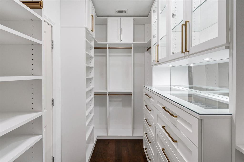 The living room boasts soaring ceilings, expansive windows that flood the space with natural light, and a charming fireplace as the focal point. The downstairs primary suite is a true retreat, complete with a spa-like bath featuring a garden tub, frameless glass shower, dual vanities, and a professionally designed walk-in closet with $30K in custom upgrades — a dream for organization and luxury.