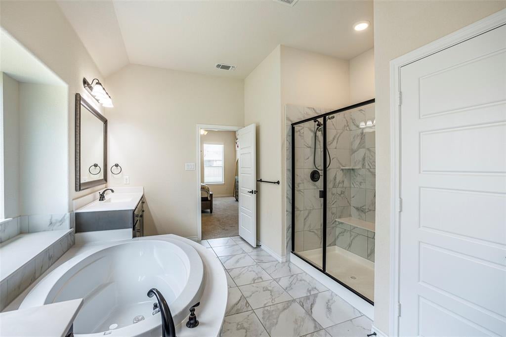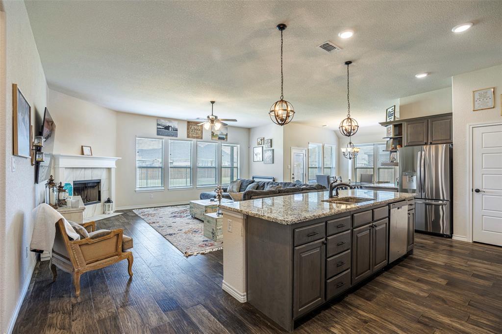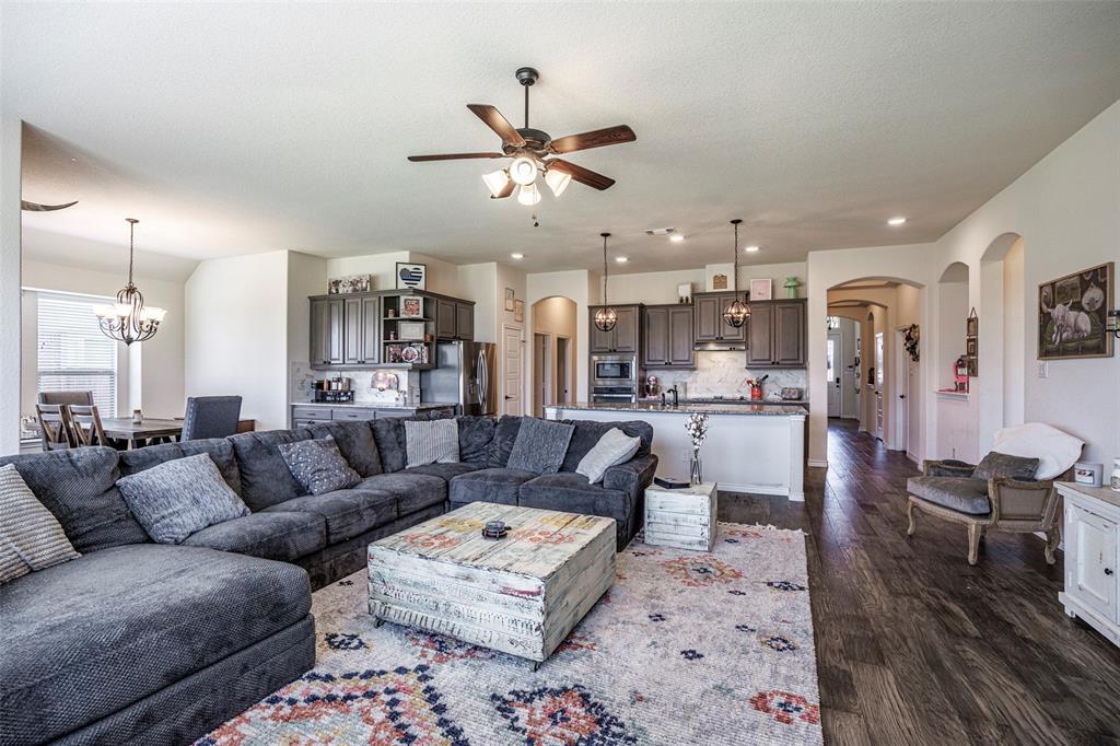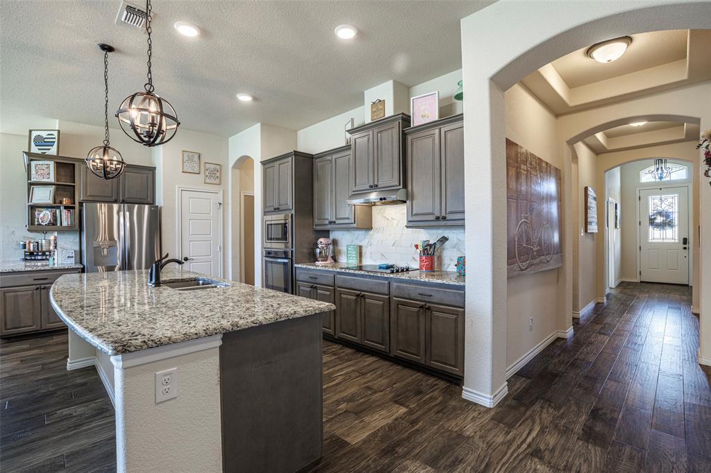 This spacious 4-bedroom, 2.5-bath home also includes a versatile office space that features a stylish large chic barndoor. Currently used as a 5th bedroom, this room can adapt to your needs, offering privacy and flexibility. The open floor plan is perfect for family living and entertaining, with a generously sized kitchen that boasts a large island, granite countertops, and plenty of cabinetry for all your storage needs. The primary suite is a bright and inviting space with abundant natural light and a luxurious ensuite bath that features a large garden tub, dual vanities, a generously sized stand-up shower, and a spacious walk-in closet. Outside, enjoy your morning coffee or a relaxing evening on the covered patio, overlooking a lush green yard that extends along a serene greenbelt.