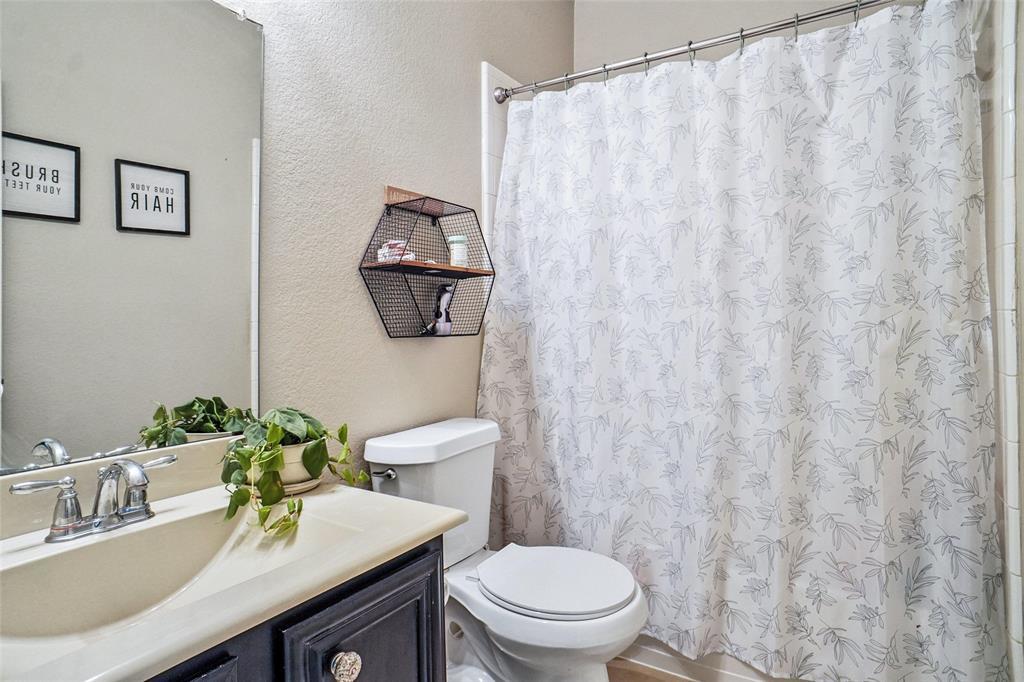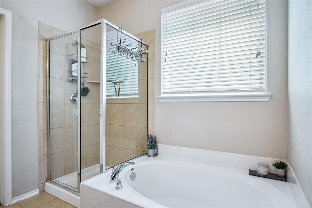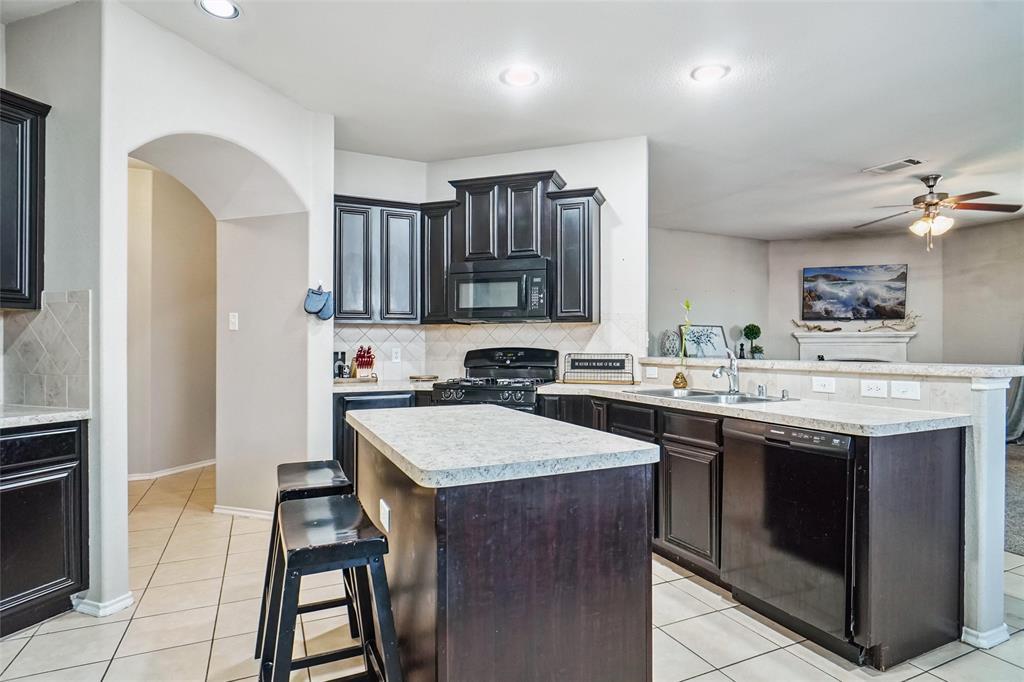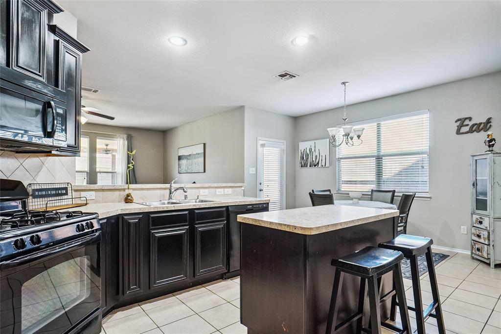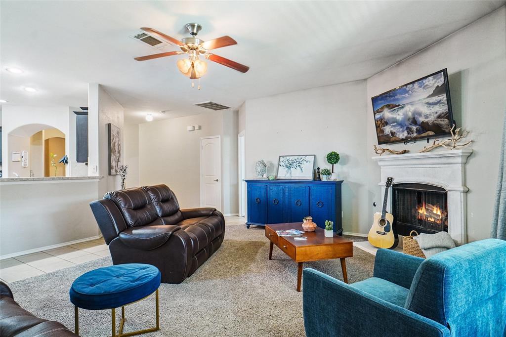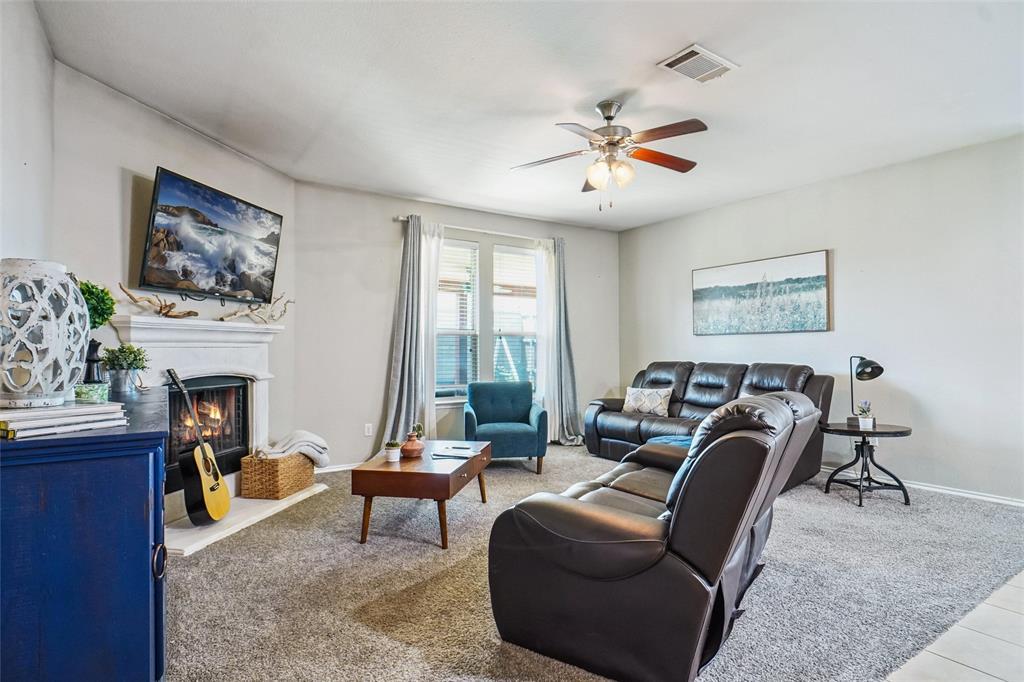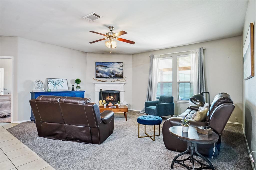 This beautifully maintained 4-bedroom, 3-bathroom home is designed with growing families in mind. From the inviting brick exterior with mature trees to the covered front porch, this home exudes warmth and curb appeal. Inside, you're greeted by an open-concept layout that effortlessly blends comfort and functionality. The chef’s kitchen is the heart of the home, featuring dark cabinetry, hard countertops, a center island and a walk-in pantry ideal for weeknight meals or weekend entertaining. The dining area is flooded with natural light, perfect for family meals. The cozy living room boasts a corner fireplace and neutral tones, creating a relaxing atmosphere for movie nights or game days. The spacious upstairs loft provides flexible space for a second living area, playroom, or home office — whatever fits your lifestyle. Retreat to the private owner’s suite with an ensuite bath that includes a separate shower, soaking tub, and double vanity. Additional bedrooms are generously sized, providing comfortable spaces for kids, guests, or hobbies. Step outside and fall in love with the backyard! The extended covered patio with wood ceiling and fan is ideal for outdoor lounging, summer BBQs, and year-round entertaining. The fully fenced yard offers plenty of room for pets, play and privacy.