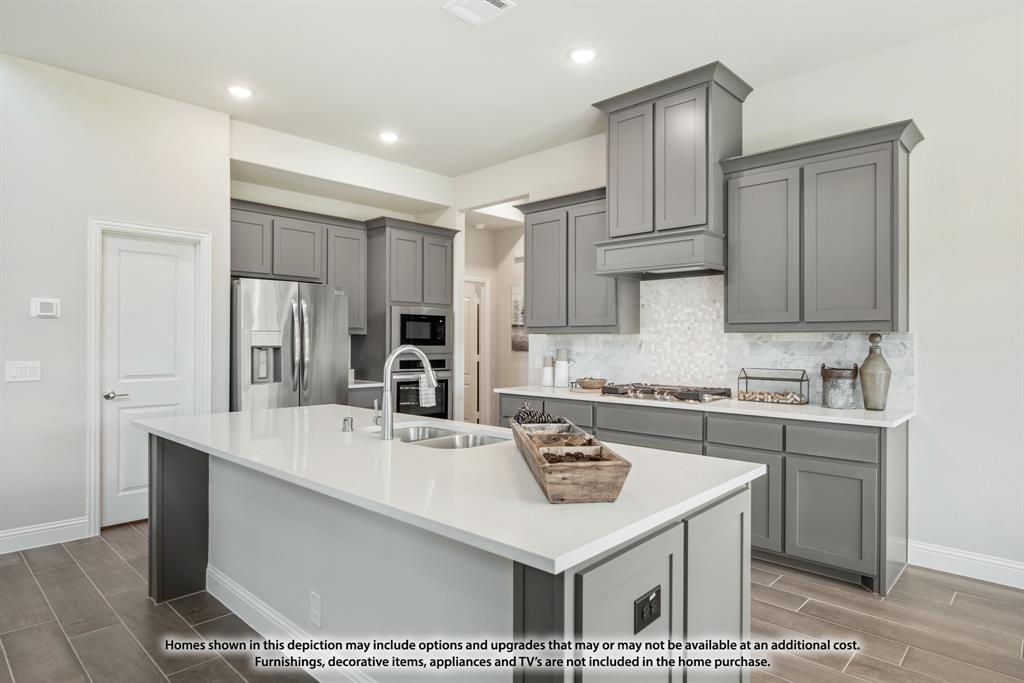NEW! NEVER LIVED IN. The Bellflower IV by Bloomfield Homes is a spacious two-story showstopper, offering 5 bedrooms, 4 full baths, a powder bath, and over 4,200 square feet of stylish living. Thoughtfully designed for function and flow, this home features a deluxe kitchen with full-height cabinetry accented with glass inserts on top, an elegant 8' front door, and a versatile floor plan that easily accommodates multigenerational living or frequent entertaining. Step through the arched stone entry into a light-filled layout, where a wood-look tile floor connects the front study and formal dining to a dramatic family room with a soaring ceiling open to the second floor. The kitchen is a chef’s dream with quartz countertops, custom cabinets, pot and pan drawers, and built-in stainless steel appliances. An oversized pantry and adjacent breakfast area complete this central gathering space. The primary suite is located on the main level for privacy, featuring a luxurious ensuite bath with separate vanities and a spacious walk-in closet connected to the laundry room. An additional bedroom and full bath downstairs offer the perfect setup for guests. Upstairs, enjoy a large game room along with a fully enclosed media room with doors, providing a true theater-style retreat. 3 more bedrooms are located upstairs, including a private in-law suite with dual walk-in closets and its own full bath, while the remaining 2 bedrooms share a Jack-and-Jill bath. Outside, the home shines with a brick-and-stone façade, cedar garage doors, and thoughtful touches like a gas stub on the back patio—ideal for grilling and outdoor entertaining. All of this is set within the amenity-rich Sonoma Verde community, offering a clubhouse, pool, tennis courts, and playgrounds. Schedule your tour today and experience the Bellflower IV difference!