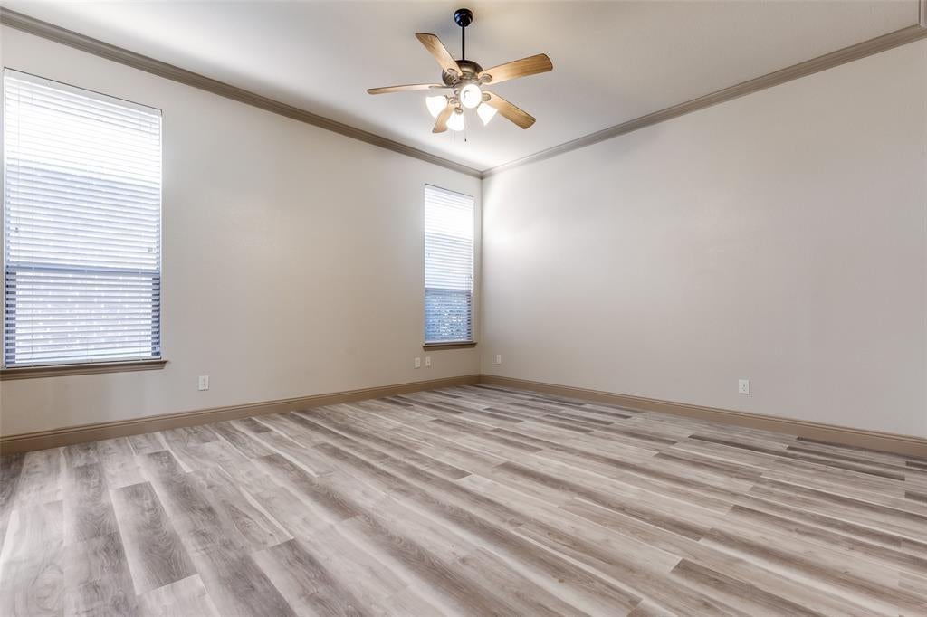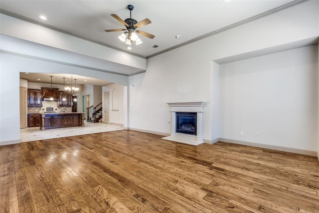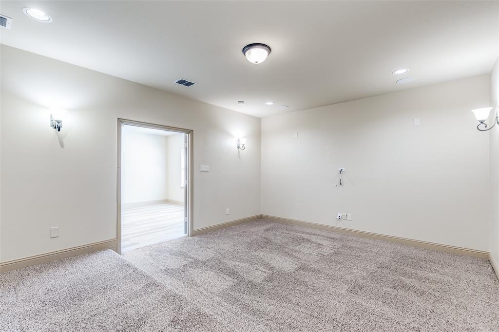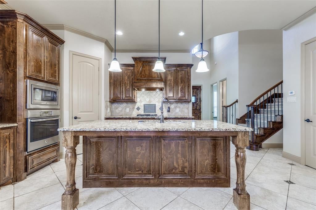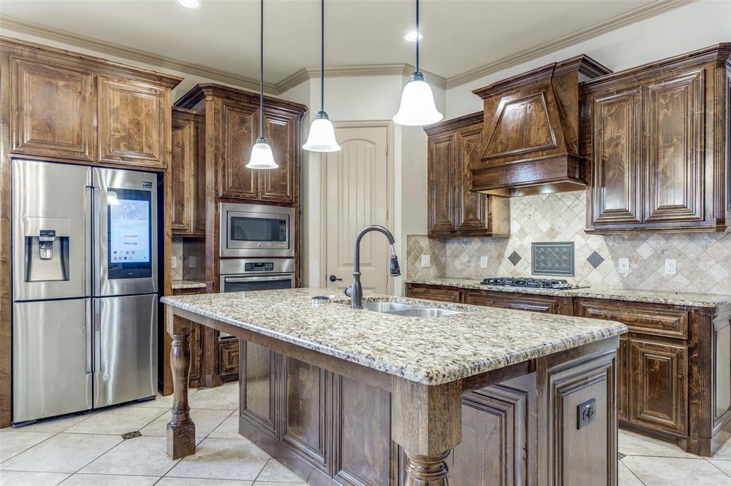 Step inside to soaring ceilings and an open layout designed for everyday living and easy entertaining. A formal dining room with a coffered ceiling sets the stage for gatherings, while the front secondary bedroom offers the perfect setup for a home office or guest space. The chef’s kitchen is the heart of the home, featuring granite counters, a gas cooktop, stainless steel appliances, decorative backsplash, walk-in pantry, large island, and a built-in desk area. Ceramic tile, LVP, and hardwood flooring flow throughout the home. The living room, just off the kitchen, offers a cozy gas fireplace and plenty of space to relax. The spacious primary suite includes French door entry to a private bath with dual vanities, dual sinks, jetted tub, separate shower, and walk-in closet. Upstairs you’ll find three secondary bedrooms, two full bathrooms, a large game room, and a media room ready for movie nights. Out back, enjoy a covered patio and gated driveway with electric gate for added privacy. This home faces north and is conveniently located minutes from Eagle Stadium and just a short drive to Allen Premium Outlets, The Village at Allen, and Fairview Town Center.
