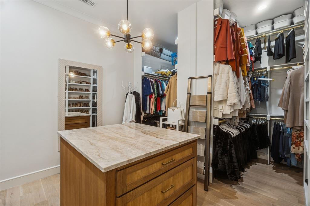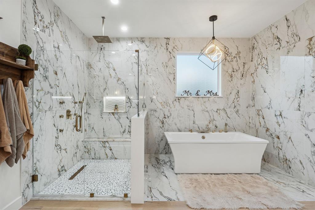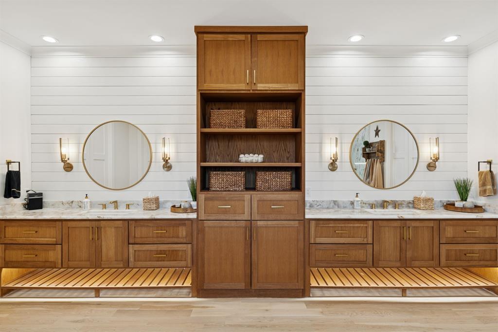Built-in Cabinets, Custom Closet System, Dual Sinks, Ensuite Bath, Linen Closet, Medicine Cabinet, Natural Stone/Granite Type, Separate Shower, Separate Vanities, Floor Drain, Hollywood Bath, Shower Body Sprays
