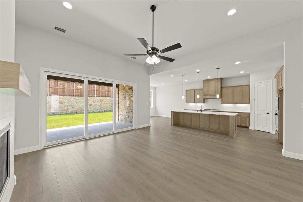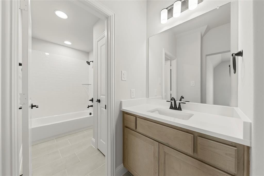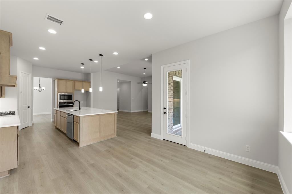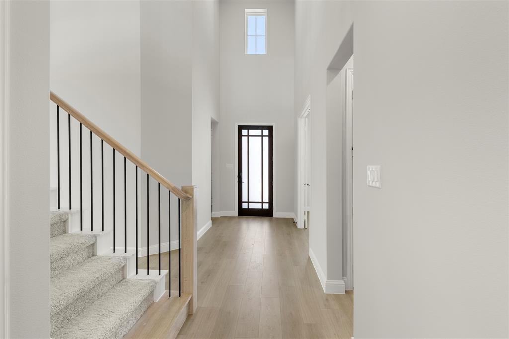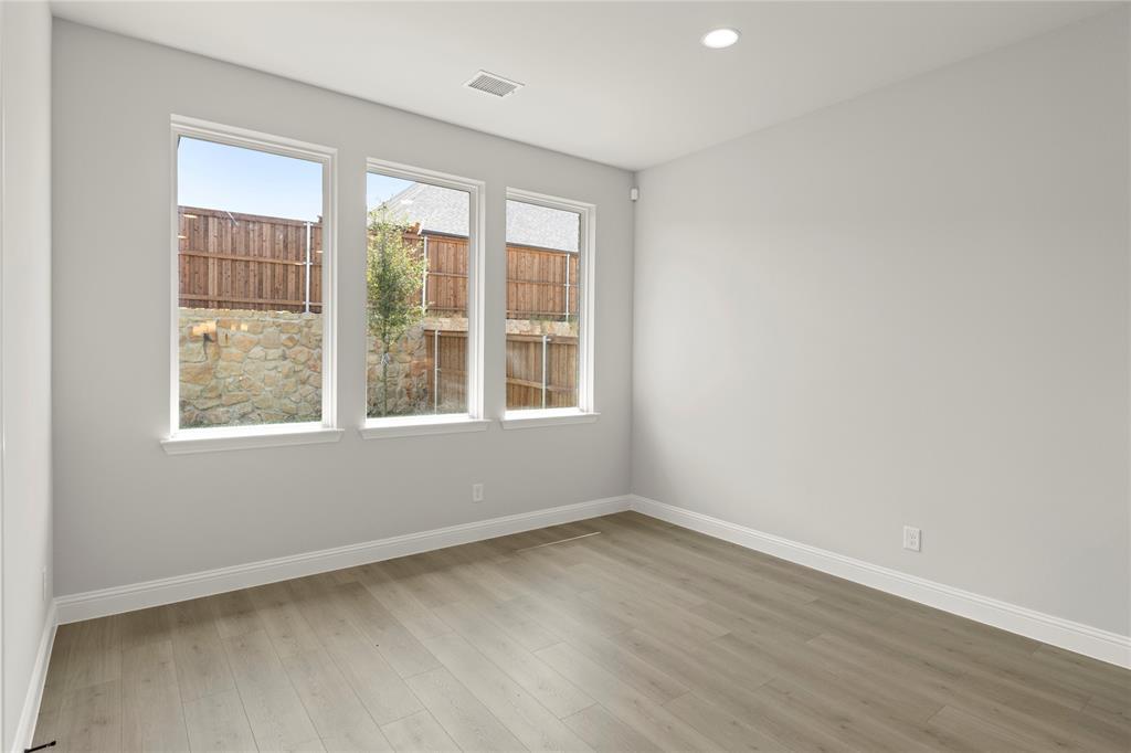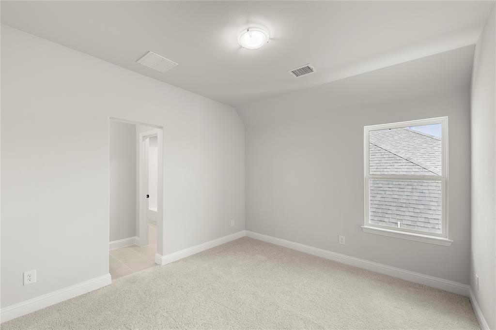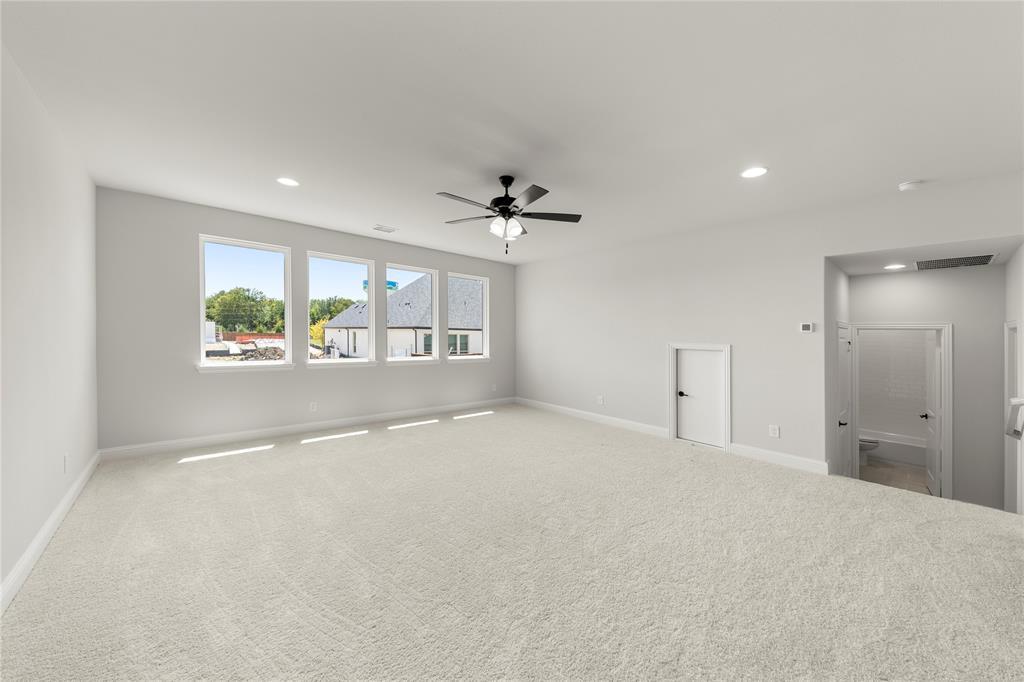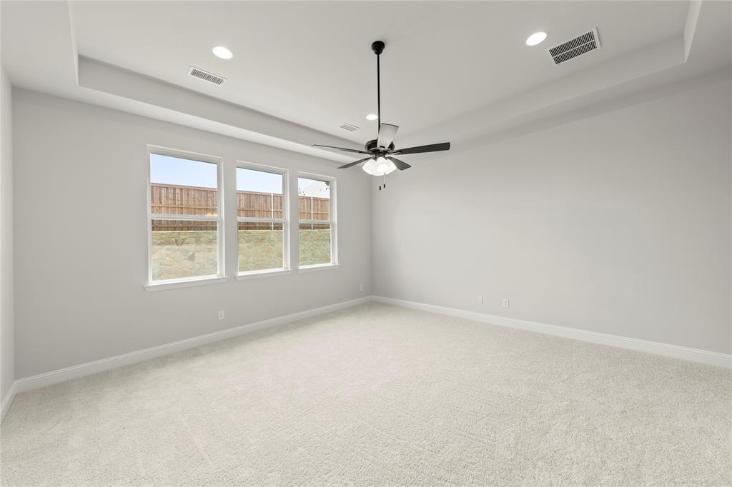 MLS# 21027708 - Built by RockWell Homes - Ready Now! ~ Alexander new home plan 5 bedrooms, 4.5 bathrooms, dining room, home office, large game room, all complemented by a 3-car garage. Elegant exterior showcases a combination of ACME brick, metal roof accents, shutters, 8-foot front & interior doors, and covered patios, creating a striking first impression. Upon entering, the foyer with soaring ceilings leads to a versatile home office and a formal dining area, which then flows into the expansive open-concept living and kitchen space. The kitchen is a chef’s dream, boasting a large island, solid surface countertops, GE stainless steel appliances, including a built-in gas cooktop, oven, microwave, and dishwasher. Additional features include a ceramic tile backsplash, 42-inch cabinets, a custom cabinet vent hood, undermount sink, Delta faucet, walk-in pantry, upgraded flooring, recessed can lighting, and upgraded cabinets. The family room, bathed in natural light from multiple dual-pane energy-efficient windows and 12ft sliding glass back door offers views of the covered patio and backyard. The primary suite, located privately at the back of the home, includes dual vanity sinks with solid surface countertops, Delta faucets, ceramic tile flooring, a ceramic tile shower with a semi-frameless glass enclosure, a freestanding soaker tub, a linen closet, a lighting package, towel bars and huge walk-in closet. Upstairs, three additional bedrooms are served by two full bathrooms and surround an oversized game room and media room perfect for entertaining or additional living space. This home also features a fully fenced private backyard, oversized home site with room for a pool, a landscaping package, a full sprinkler system, full gutters, energy-efficient HVAC, dual-pane energy-efficient windows, upgraded flooring, a mud bench, ample storage, a ceramic tile utility room with cabinets. Quick access to I30, downtown Dallas, community pool