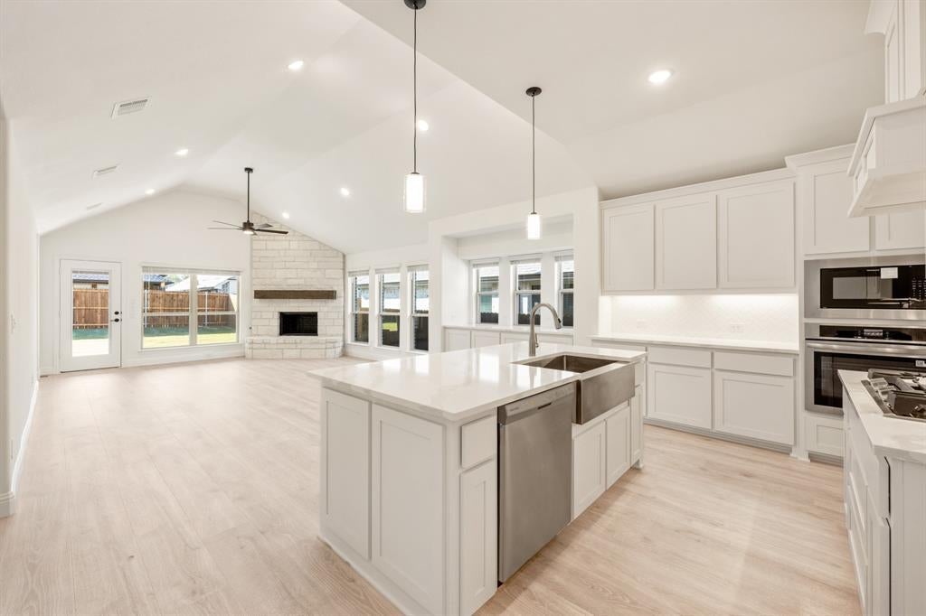 NEW! NEVER LIVED IN. Move-In Ready! Bloomfield’s Hawthorne II delivers a striking 1.5-story design set on a desirable oversized interior lot with a 2.5-car garage for added storage. Its brick-and-stone façade pairs with exterior uplighting to create a warm, evening glow that commands attention. Step through the 8' custom front door into a dramatic octagonal foyer, where laminate wood floors flow through the extended entry, halls, Family Room, Kitchen, Nook, and Study. The heart of the home features a vaulted ceiling that soars over the open-concept Family Room, anchored by a stacked stone fireplace reaching floor-to-ceiling with a modern box mantel. The Deluxe Kitchen blends style and performance with Level 5 quartz countertops, a wood vent hood, custom cabinetry, pot-and-pan drawers, and a walk-in pantry, while a built-in buffet in the Breakfast Nook adds serving and storage space. The Primary Suite is tucked away with a sitting area and a spa-like bath offering dual vanities, a soaking tub, and a glass-enclosed shower. Upstairs, a private retreat awaits with Bedroom 4, a full bath, and a large Game Room—perfect for guests or entertainment. Outside, the covered patio with gas drop is ready for grilling, and thoughtful upgrades like a tankless water heater and full gutters add everyday convenience. This is where refined design meets functional living—crafted to impress from the curb to the smallest interior detail. Visit Bloomfield at Meadow Vista today!