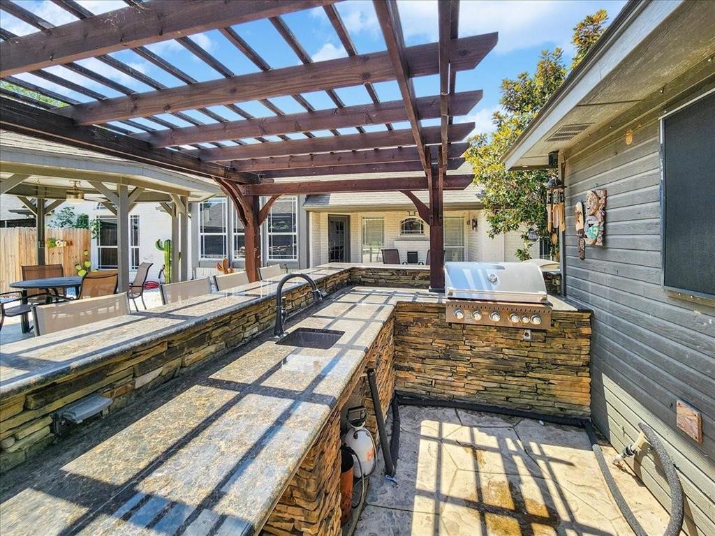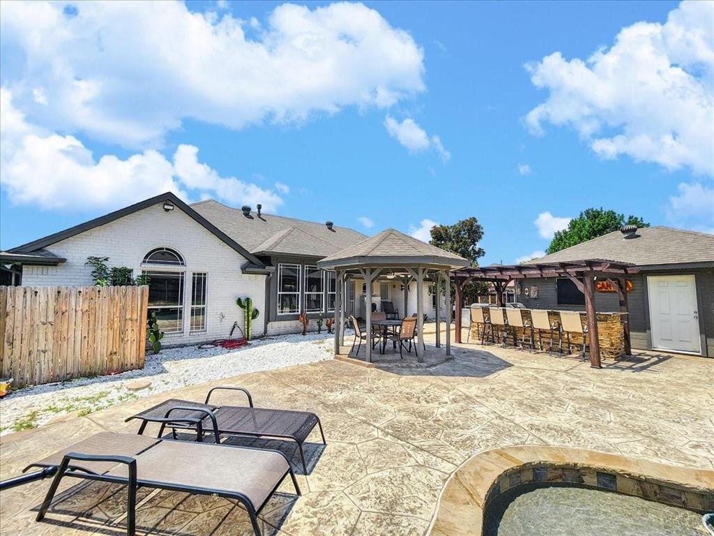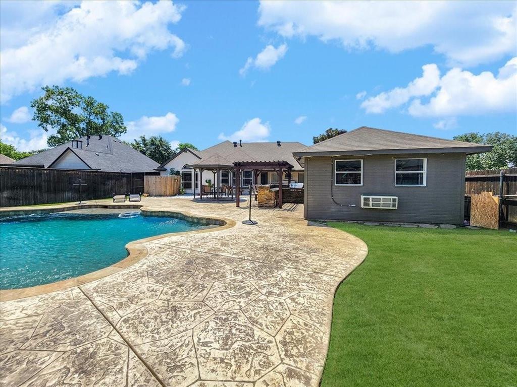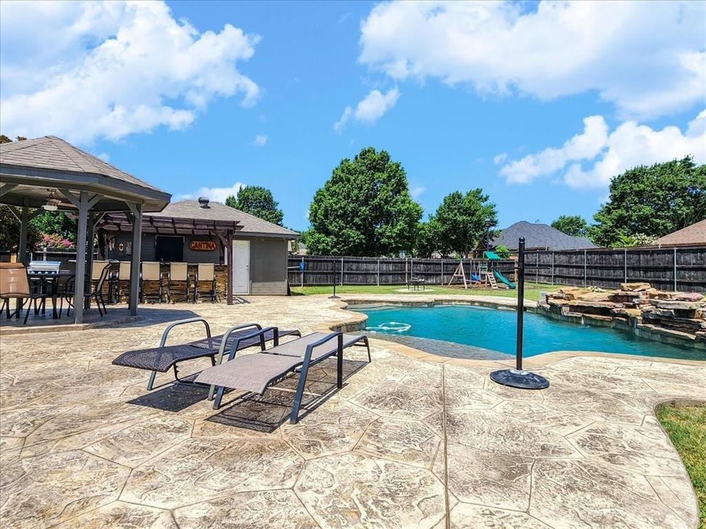 Beautiful home in Oak Valley Estates offering a guest house and pool! This open floor plan has 3 bedrooms, 2 bathrooms and an office with built-in desk in the main house. Enjoy the spacious living room with gas fireplace, concrete stained floors and a custom painted built-in entertainment center. Kitchen offers beautiful granite countertops, custom painted butlers pantry, stainless steel appliances and a nice size pantry. Home also has split bedrooms with large primary bed and bathroom. Primary bath has dual sinks, separate shower and tub, walk-in closet and built-in linen storage. Outdoors is an oasis with covered patio, beautiful pool with water feature and layout ledge, gazebo, pergola, outdoor kitchen with bar and grill and a guest house with open bedroom and private bathroom (19x15) Lots to love about this home with great location close to Centennial High School, restaurants and more! This home is a lease and ready for Nov.1st move-in.