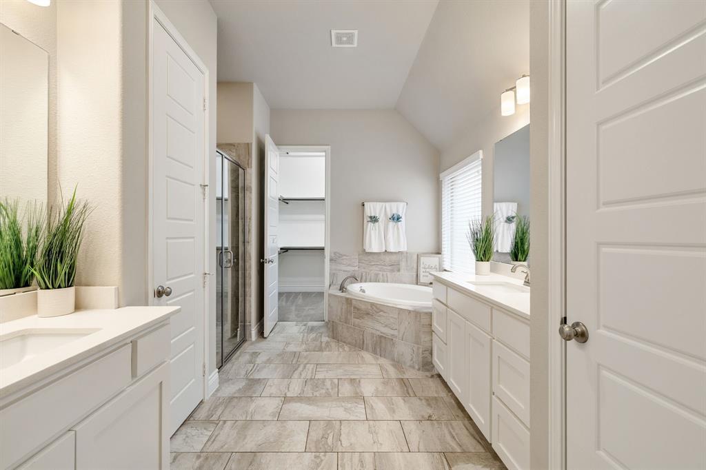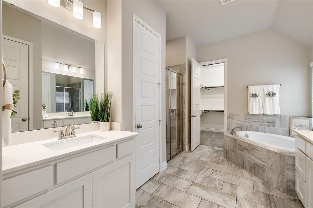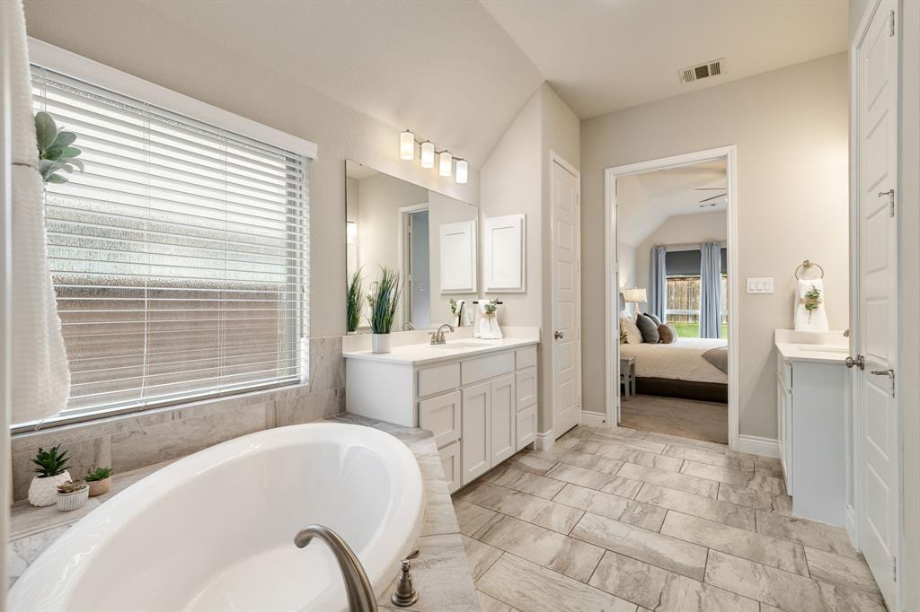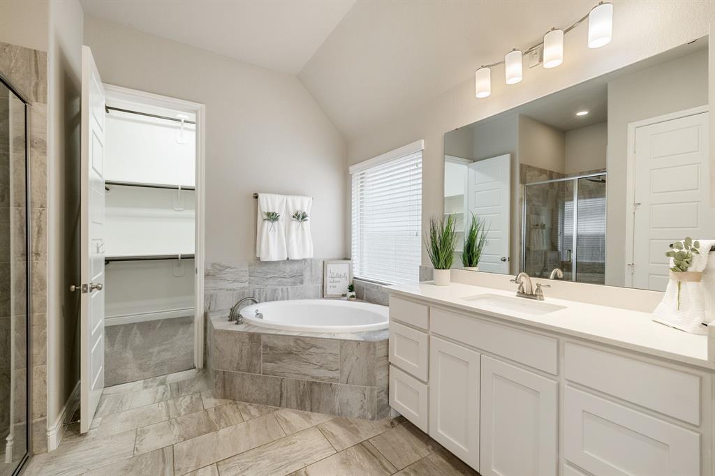Bedroom / BathroomBuilt-in Cabinets, Dual Sinks, Ensuite Bath, Garden Tub, Hollywood Bath, Linen Closet, Solid Surface/Non-Natural Type, Separate Shower, Separate Vanities, Walk-in Closet(s)