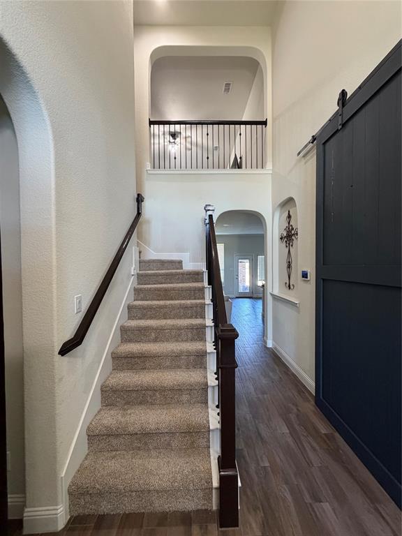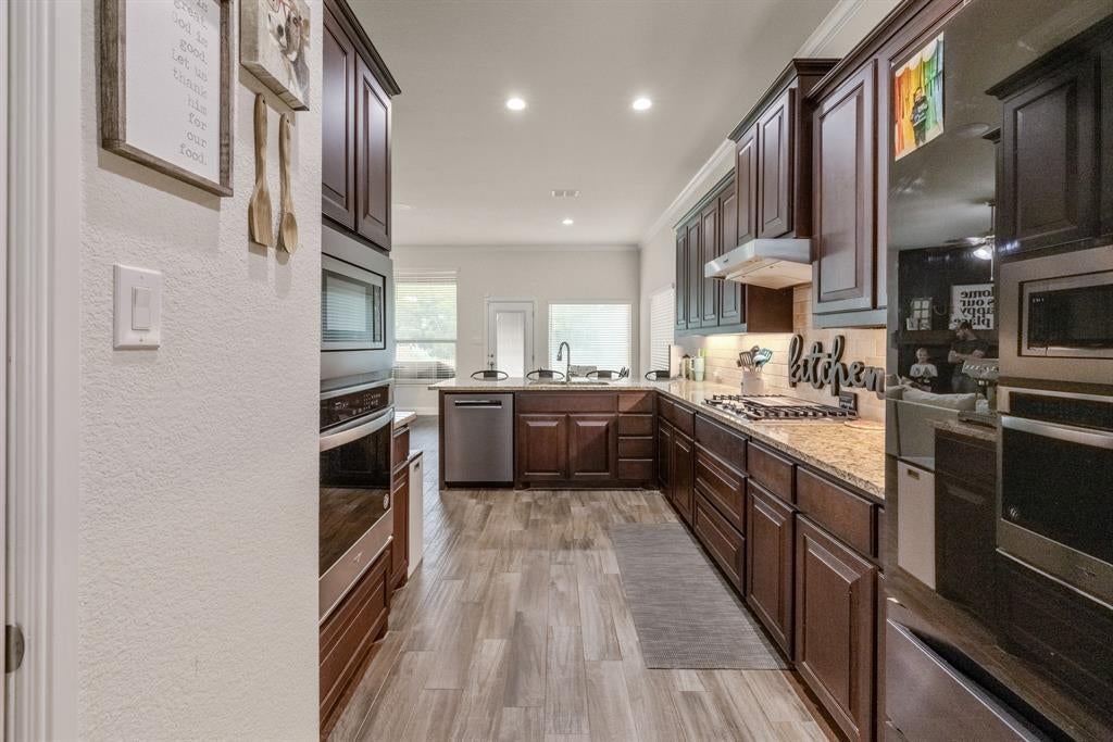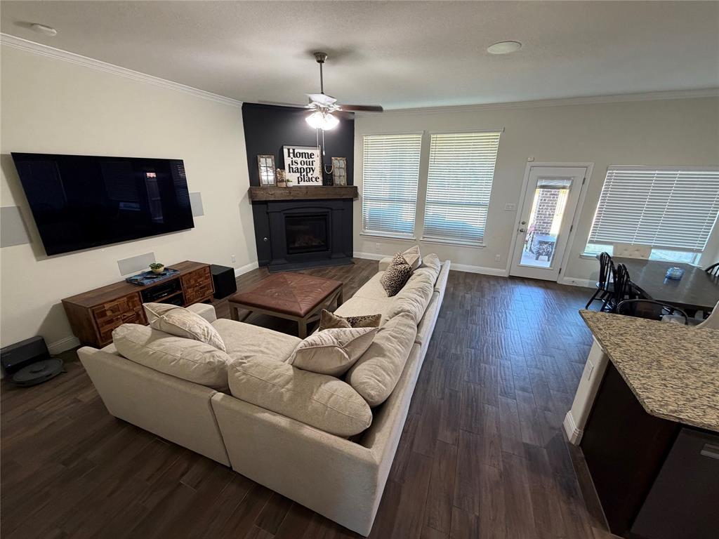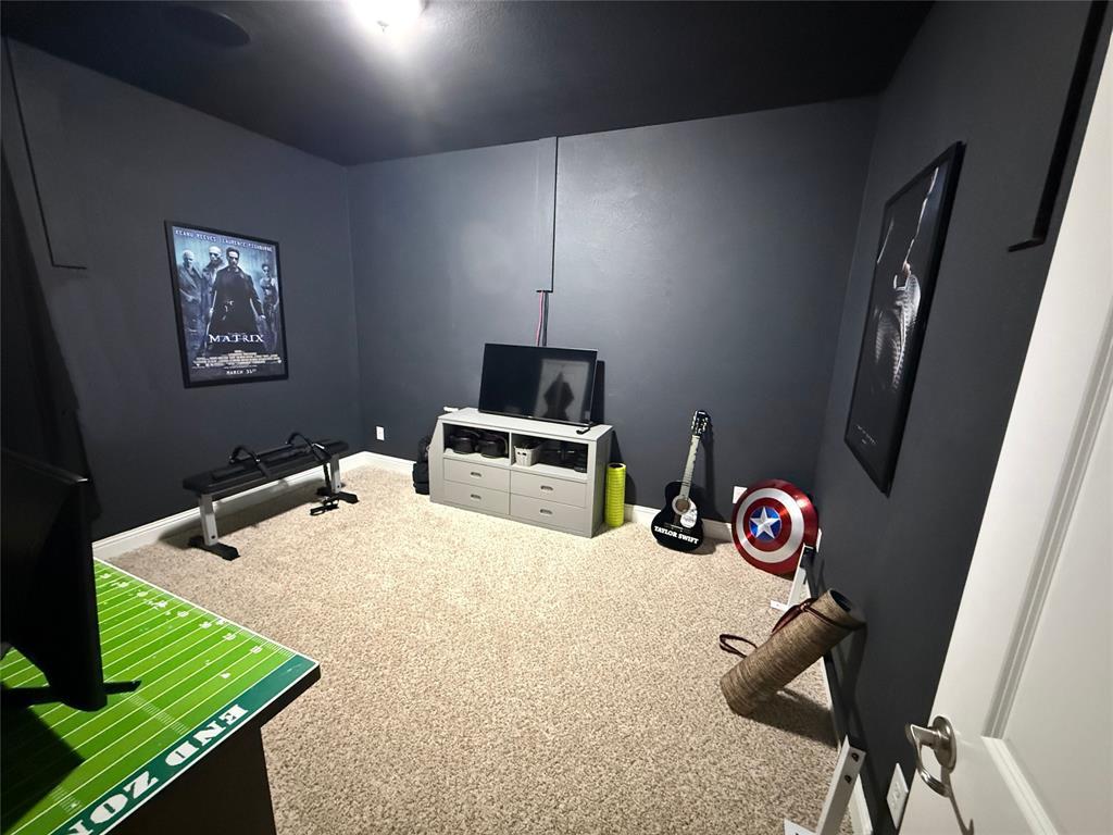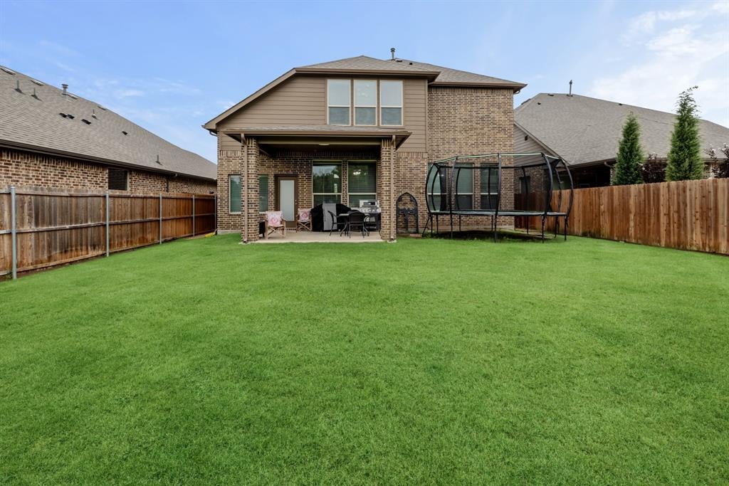 Welcome to this Immaculate 2-story home in the sought-after Morningstar Community, a perfect blend of modern comfort, thoughtful upgrades, and serene greenbelt views. This 4 bedroom, 2.5 bath, 2,644 sq ft, residence features an open-concept layout designed for both entertaining and everyday living. The spacious living room boasts a built in, premier in-wall theater system with an 8K receiver, and a 77 in. TV creating a true home cinema experience. The beautifully appointed kitchen offers upgraded appliances, including a new Signature Series dishwasher, and flows seamlessly into the dining and living spaces. The private primary suite features a custom barn door leading to a luxurious en-suite bath, while the versatile office or flex room is accented by stunning handmade 10-foot barn doors. Upstairs, new flooring adds to the home's move-in ready appeal. The garage is EV ready with dual charging stations, and the professionally designed landscaping includes custom French drains, crushed granite walkways, a river rock flower bed, and automated drip irrigation for effortless maintenance. Relax or entertain under the covered back patio, while enjoying the privacy and peaceful views of the greenbelt area behind you. Located within the highly rated Aledo ISD and offering access to Morningstar's exceptional amenities, including pools, parks, and scenic, trails-this home truly has it all.