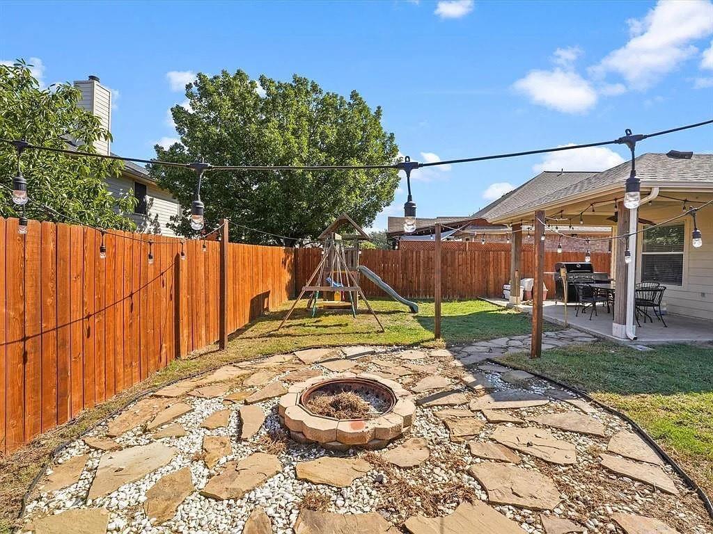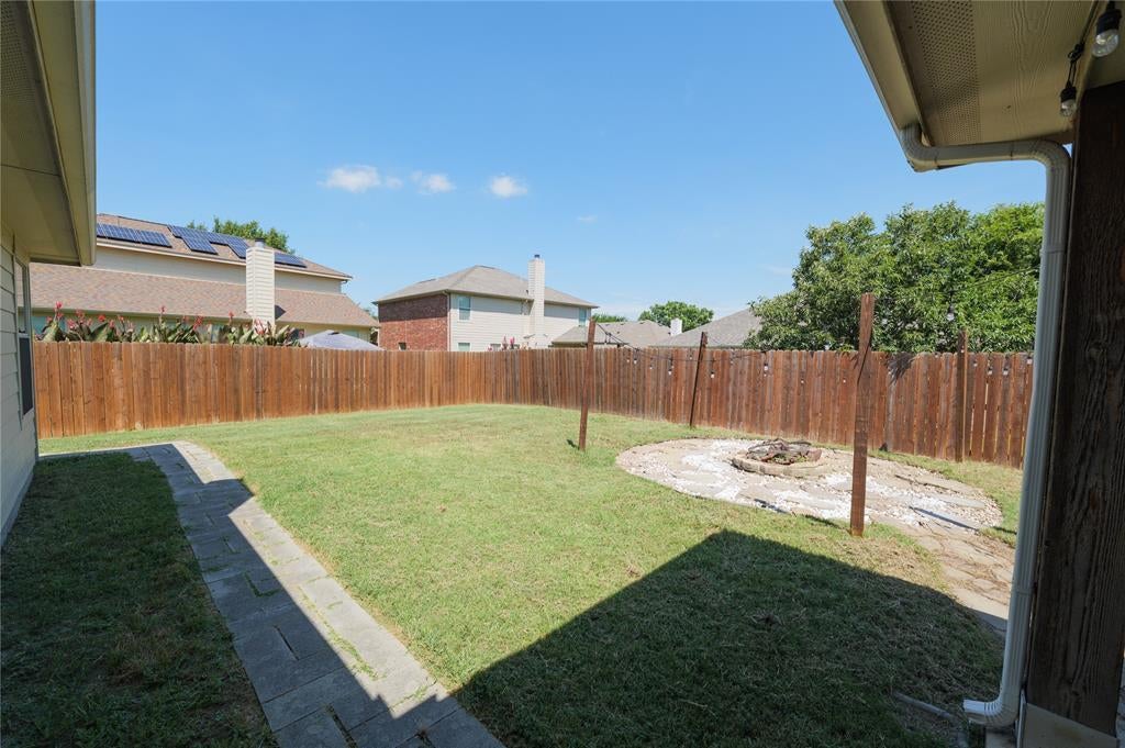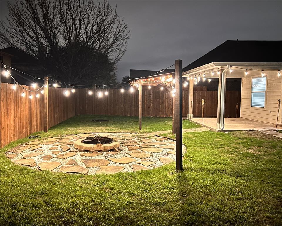 Private backyard with a covered patio and fire pit perfect for year-round outdoor living