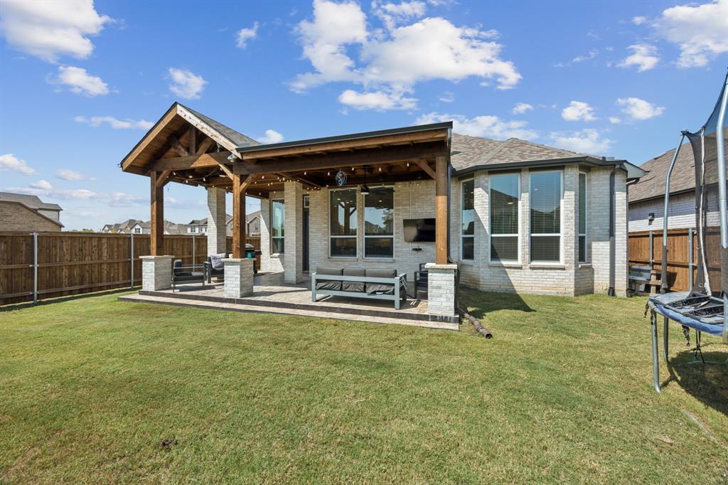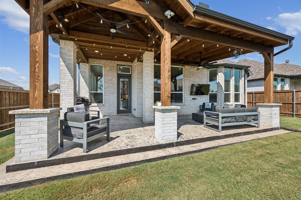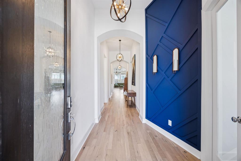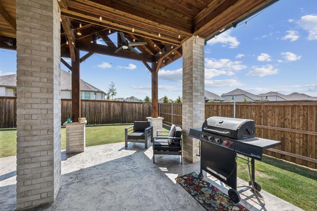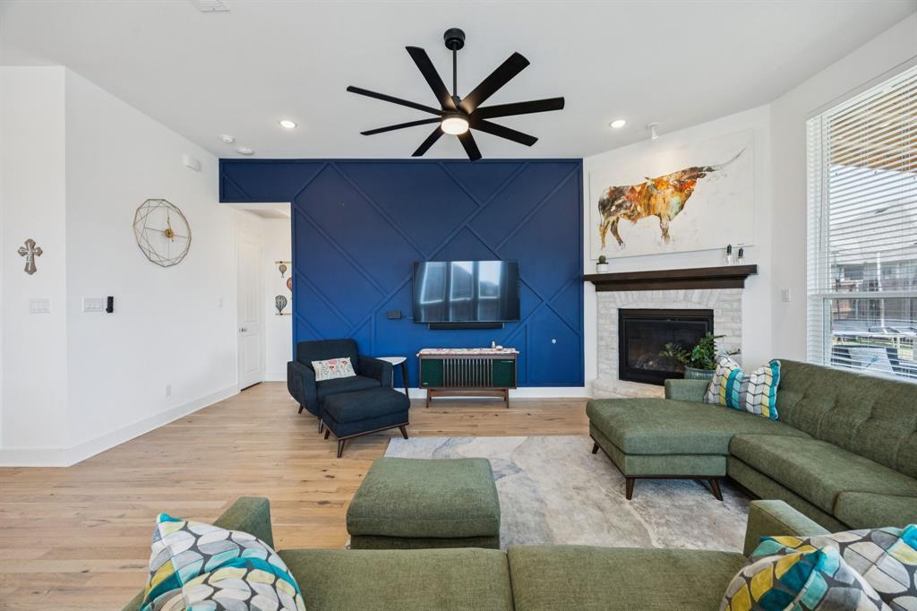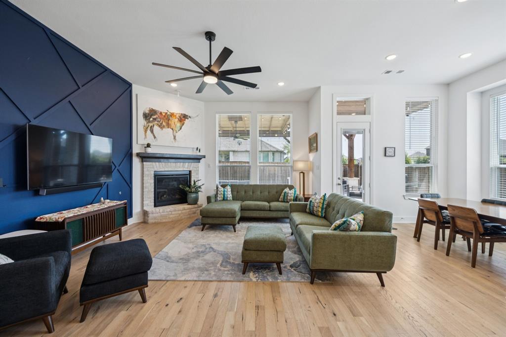 Welcome to this stunning single story Highland Home perfectly positioned on a corner lot in the sought-after Glen Crossing community of Celina! From the moment you arrive, you will notice the upgraded front door, decorator lighting, and inviting curb appeal that set the tone for this thoughtfully designed residence. Inside, the entry showcases a custom wood accent wall, while French doors open to a private office. The spacious family room is the heart of the home, featuring a gas fireplace, striking wood accent wall, and a dramatic wall of windows that flood the space with natural light. The open-concept floorplan flows seamlessly into the gourmet kitchen, showcasing quartz countertops, a gas cooktop, stainless steel appliances, abundant cabinetry, and a large dining area - ideal for both entertaining and everyday living. The private primary suite is a true retreat with a spa-inspired bath featuring an oversized shower, dual sinks, and a walk-in closet. Three comfortable guest rooms share a full bath, and a stylish powder bath boasts an updated vanity and designer tile floors. Step outside to enjoy the extended covered patio, perfect for year round relaxation or gatherings. Residents of Glen Crossing enjoy an amenity-rich lifestyle with a large community pool, scenic walking trails, and tranquil ponds. This home combines elegant finishes, modern design, and resort-style amenities - all in a prime Celina location!