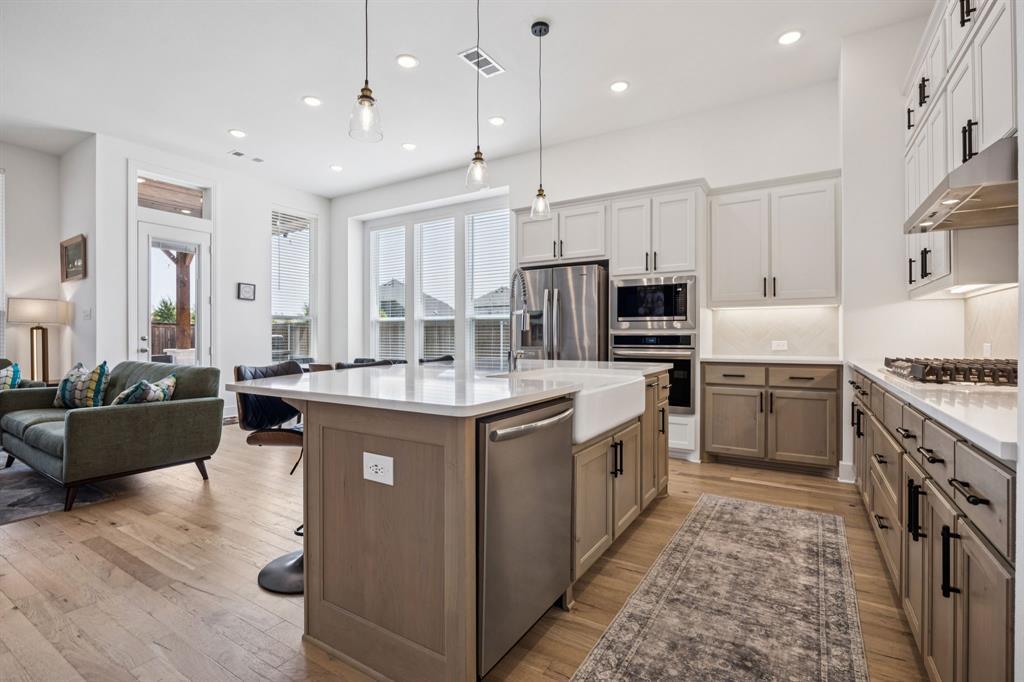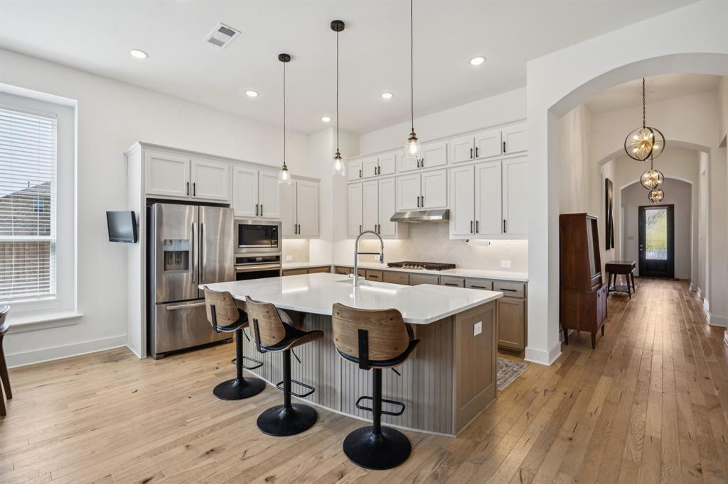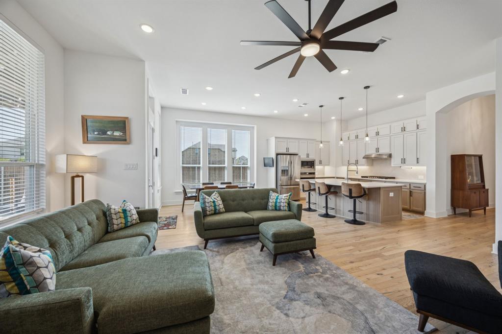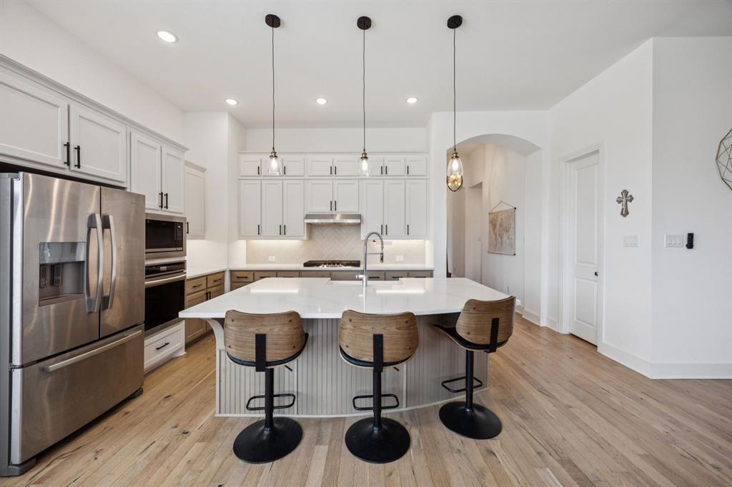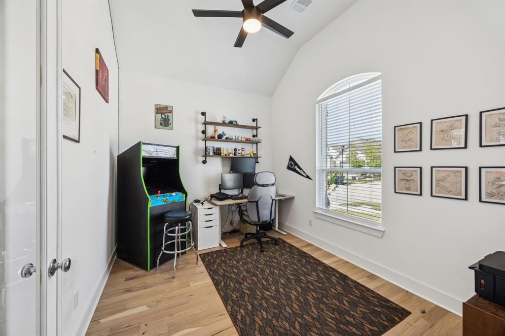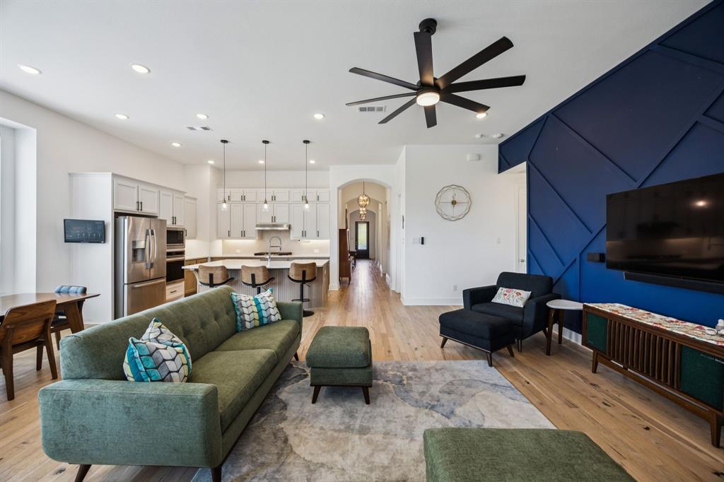 Welcome to this stunning single story Highland Home perfectly positioned on a corner lot in the sought-after Glen Crossing community of Celina! From the moment you arrive, you will notice the upgraded front door, decorator lighting, and inviting curb appeal that set the tone for this thoughtfully designed residence. Inside, the entry showcases a custom wood accent wall, while French doors open to a private office. The spacious family room is the heart of the home, featuring a gas fireplace, striking wood accent wall, and a dramatic wall of windows that flood the space with natural light. The open-concept floorplan flows seamlessly into the gourmet kitchen, showcasing quartz countertops, a gas cooktop, stainless steel appliances, abundant cabinetry, and a large dining area - ideal for both entertaining and everyday living. The private primary suite is a true retreat with a spa-inspired bath featuring an oversized shower, dual sinks, and a walk-in closet. Three comfortable guest rooms share a full bath, and a stylish powder bath boasts an updated vanity and designer tile floors. Step outside to enjoy the extended covered patio, perfect for year round relaxation or gatherings. Residents of Glen Crossing enjoy an amenity-rich lifestyle with a large community pool, scenic walking trails, and tranquil ponds. This home combines elegant finishes, modern design, and resort-style amenities - all in a prime Celina location!
