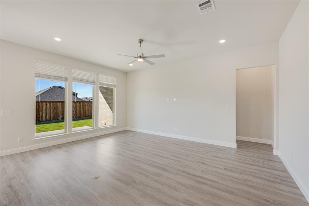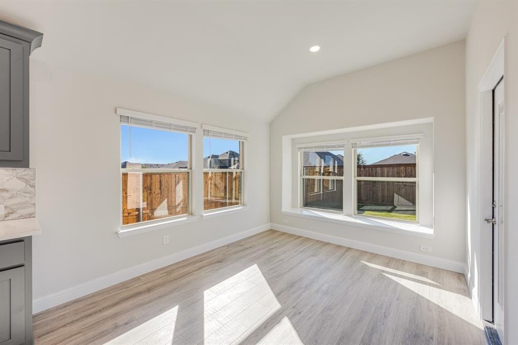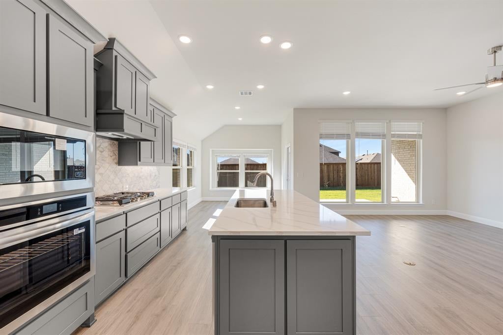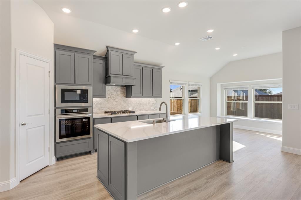 NEVER LIVED IN NEW HOME! QUICK CLOSE READY! Bloomfield Homes has the perfect single-story option for anyone looking in the Denton-Aubrey area—this Jasmine plan offers 4 bedrooms and 3 full bathrooms in a thoughtful layout designed for everyday living. From the moment you step through the 8' front door, you’re greeted by an extended foyer that flows past three secondary bedrooms positioned toward the front and side of the home, each with easy access to full bathrooms that make them ideal for family or guests. Continuing into the heart of the home, the space opens into a bright and welcoming Family Room lined with large windows that fill the home with natural light, while high ceilings create an airy, open feel. The Family Room connects seamlessly to the Kitchen and Breakfast Nook, forming a central gathering space that’s perfect for both relaxed daily routines and entertaining. The Deluxe Kitchen is a standout with quartz countertops, stainless steel appliances, pot and pan drawers, a gas cooktop with a vent hood, and custom cabinetry, all anchored by a large center island that makes meal prep and casual dining easy. Tucked at the back of the home for privacy, the spacious Primary Suite offers a quiet retreat with a spa-like bath featuring dual vanities, a soaking tub, a separate glass-enclosed shower, and a large walk-in closet. Throughout the main living areas, wood-look laminate flooring adds durability and warmth, while soft carpet brings comfort to each bedroom. The home also includes window coverings, full gutters, and a tankless water heater for everyday convenience and efficiency. Out back, a covered patio extends your living space outdoors, offering the perfect spot to unwind, and the interior lot setting in ArrowBrooke combines thoughtful design with upgraded finishes in a prime location.