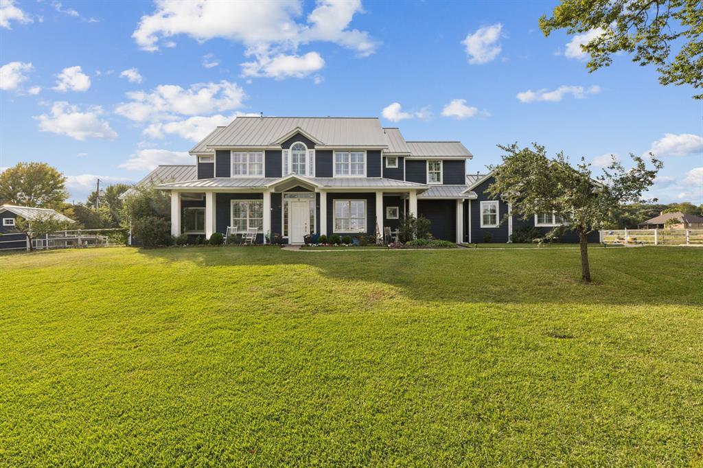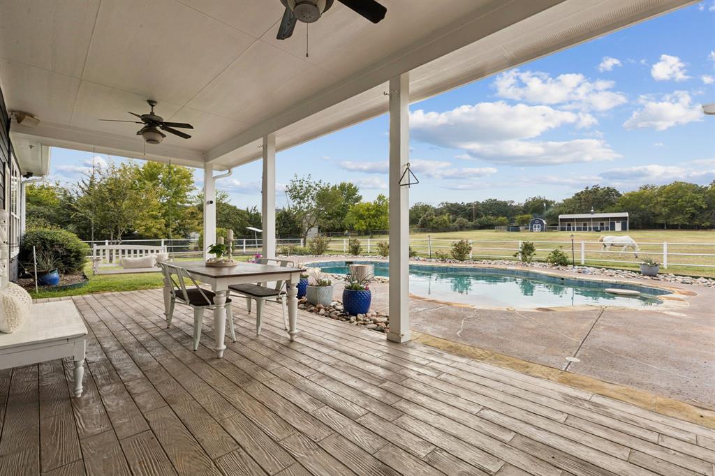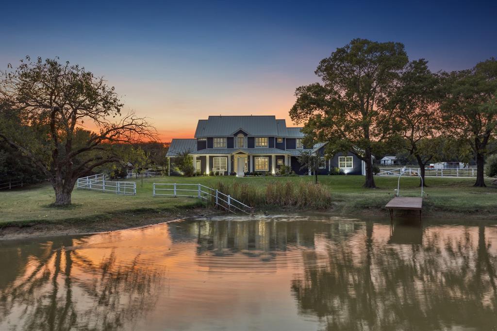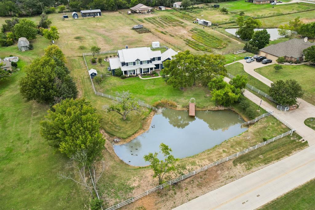Set on 2.86 acres, this remarkable property offers a lifestyle that blends comfort and country charm. A private driveway with a gated entrance welcomes you home, where a stocked fishing pond with a dock becomes the centerpiece of the landscape. The grounds include multiple outbuildings such as a shed, a climate controlled dog kennel with AC and heat, an oversized chicken coop, and a three stall horse barn with tack room and attached RV carport. Raised garden boxes and mature fruit trees provide the opportunity to grow your own fresh fruits and vegetables, then cool off in the renovated saltwater pool just steps away from the covered back patio. Inside, shiplap walls carry a warm and inviting character throughout the first floor. The kitchen is designed for both function and gathering, with a large island, a breakfast nook, and brand new appliances including a stove and dishwasher installed within the past year. Additional upgrades such as heated bidet toilets and a new HVAC unit have also been added for convenience. The living room centers around a cozy fireplace, while the downstairs study with barn doors provides flexibility as a home office or fourth bedroom. The primary suite is located on the main level with a spacious walk in closet and a relaxing bathroom featuring dual vanities, a clawfoot soaking tub, and a separate shower. Upstairs, a versatile living area offers space for a game room, media room, or retreat. A three car garage with epoxy floors adds everyday convenience. With so many thoughtful features and an agricultural exemption in place, this home provides an opportunity to experience life outside city limits while still enjoying the comforts of a well appointed residence.