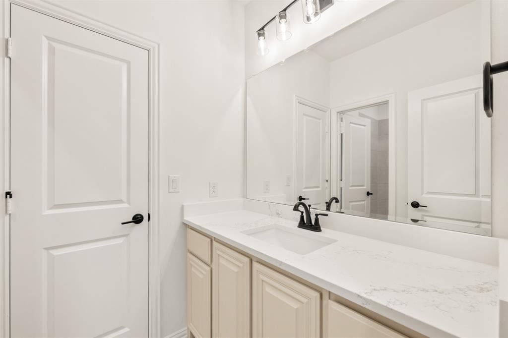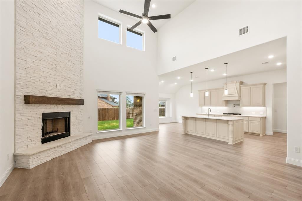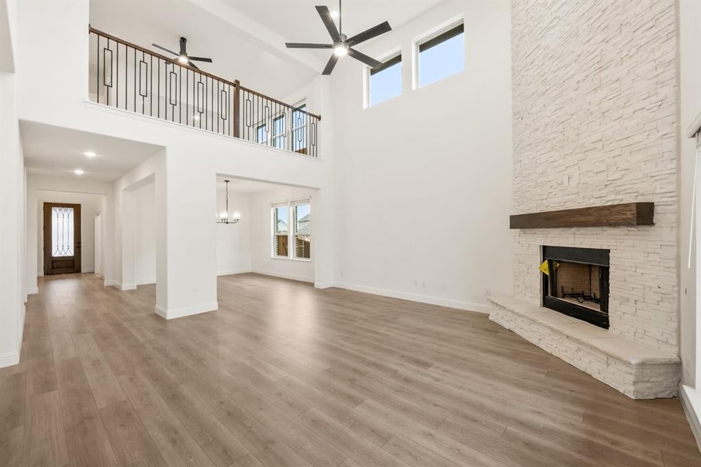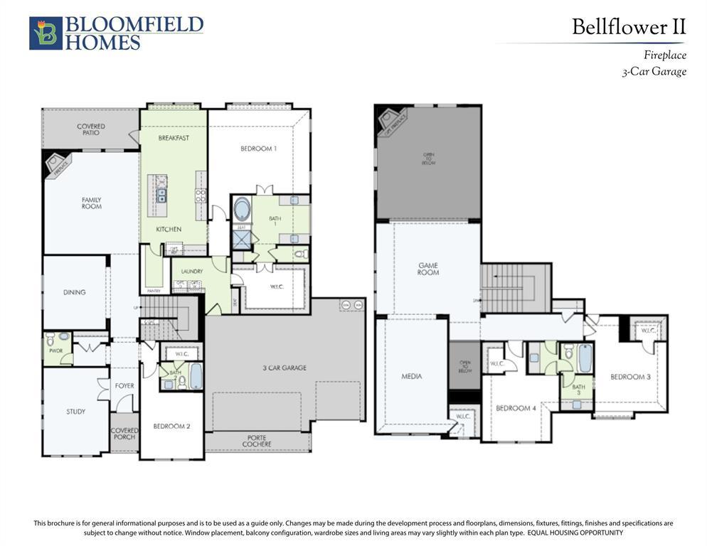 NEW! NEVER LIVED IN. Ready for Closing Day! Welcome to Bloomfield Homes’ Bellflower II, a grand two-story home where thoughtful design meets timeless detail. The exterior showcases a rich blend of brick and stone, creating a stately presence with an 8’ Warwick front door, brick front porch, and landscaped yard framed by stone edging and a stained wood fence. Inside, the airy foyer opens to a private study enclosed with glass French doors, while upgraded laminate wood floors extend through the entry, dining, study, family room, and kitchen, giving the main level a cohesive flow. The open family area centers around a stacked ledge stone fireplace with a modern box mantel, illuminated by disc and recessed lighting throughout. The Deluxe Kitchen stands out with quartz countertops, upgraded glazed cabinetry, a farmhouse sink with pot filler, stainless steel appliances, pendant and under-cab lighting, and an island wrapped with cabinet skin—all overlooking the breakfast nook and extended covered patio with a gas drop for grilling. Downstairs also includes a secondary bedroom and full bath for guests, while the primary suite offers a serene retreat with a luxury ensuite featuring quartz counters, upgraded floor tile, and separate vanities. Upstairs, the modern railing leads to a spacious game room and a media room pre-wired for surround sound, along with 2 additional bedrooms and a full bath. The 3-car garage with a porte cochere adds both style and convenience, enhanced by dedicated outlets, uplights along the front elevation, and a rear floodlight. With full gutters, blinds, and energy-efficient systems, every corner of this home reflects Bloomfield’s signature craftsmanship. Experience the perfect blend of beauty and function—visit or call Bloomfield Homes today to explore the Bellflower II!