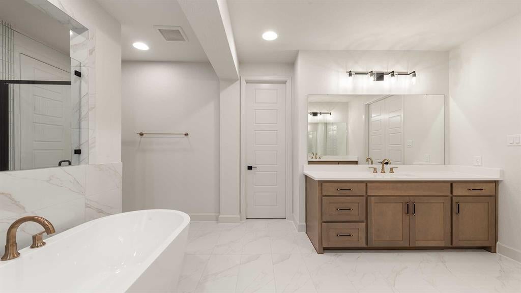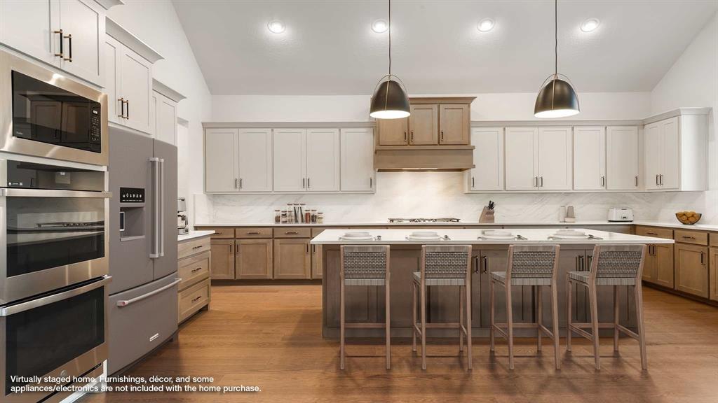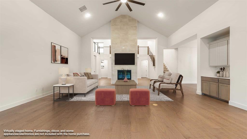 MOVE IN READY! A grand two-story entry with soaring 19-foot ceilings and a wood mantel fireplace welcomes you into the family room, where extended ceilings and a sliding glass door open to the covered backyard patio. Just off the entry, a private guest suite features a full bath and walk-in closet. Hardwood floors throughout living areas. The dining room connects seamlessly to the kitchen through a butler’s pantry. The kitchen boasts a large center island with built-in seating, abundant counter space, double wall oven, 5-burner gas cooktop, and a spacious walk-in pantry. A private home office with French doors adds functionality and style. The primary suite is filled with natural light from a wall of windows, while its spa-inspired bath offers dual vanities, a freestanding tub, glass-enclosed shower, two walk-in closets, and convenient dual access to the utility room. Upstairs, one wing hosts a large game room and connecting media room, while the other side offers secondary bedrooms, each with a bathroom and closet. A four-car split garage completes this exceptional home.