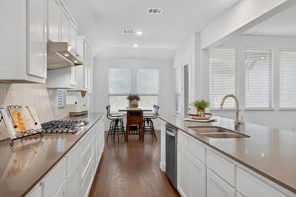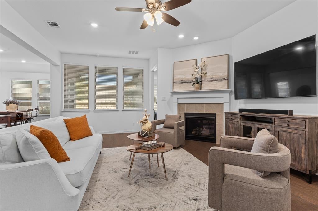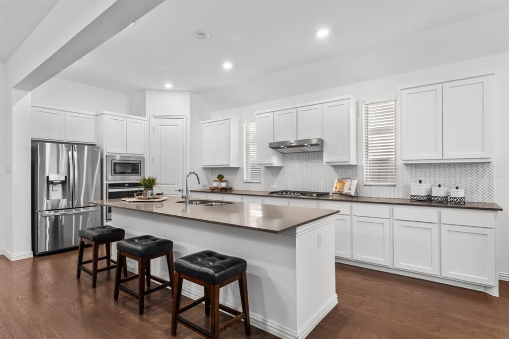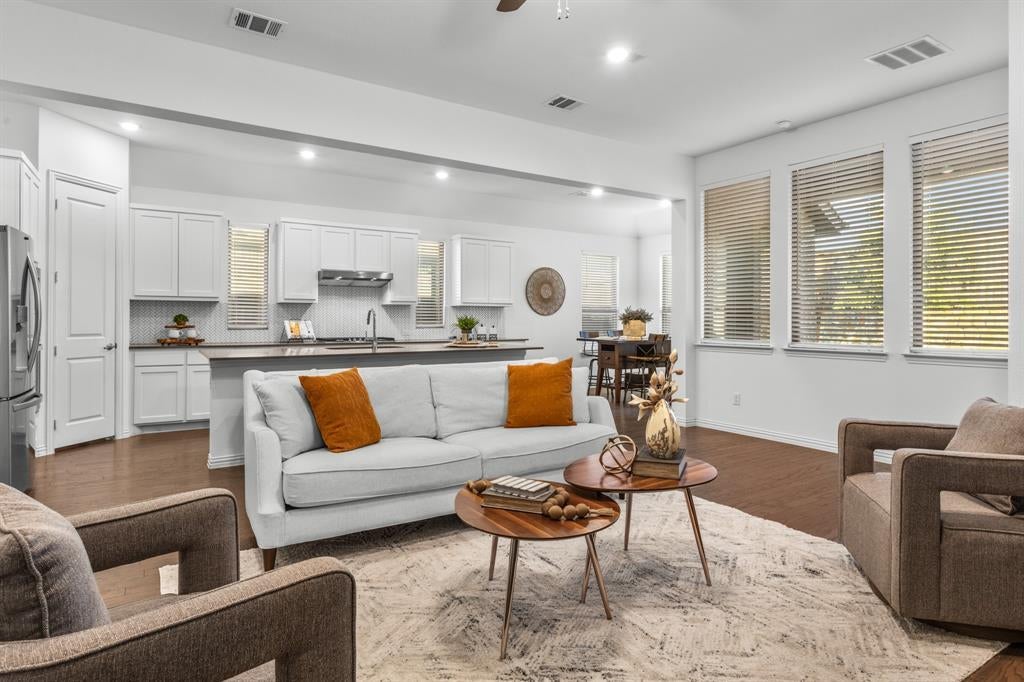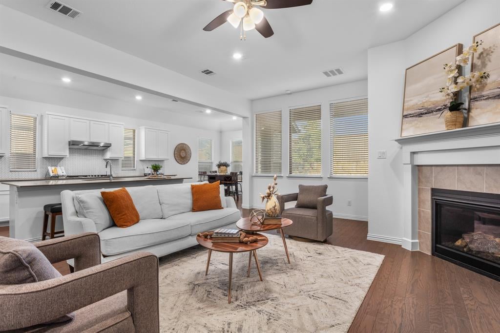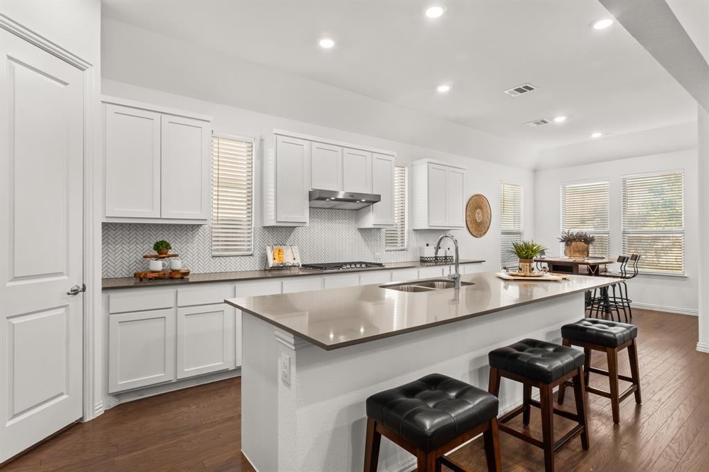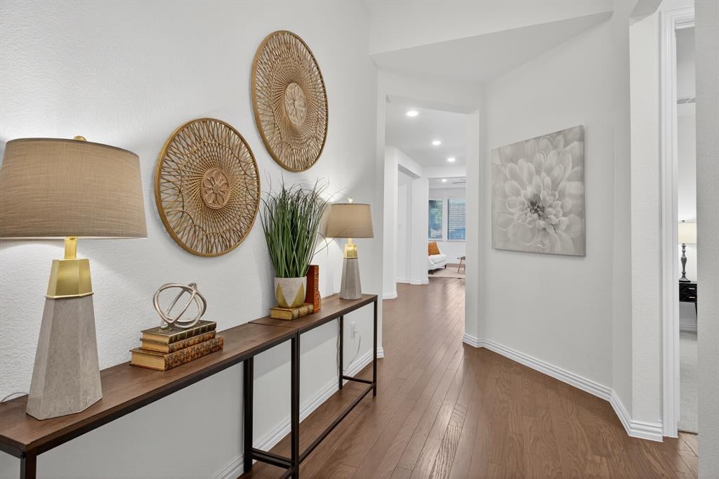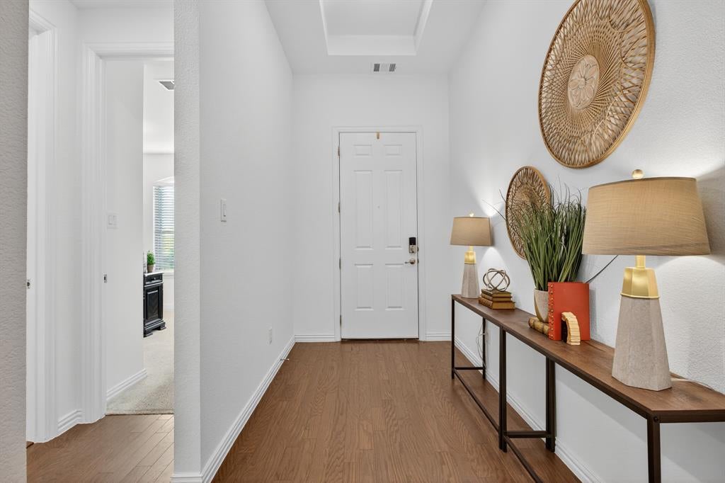 Discover your dream home in Canyon Falls, where timeless elegance & thoughtful updates meet everyday comfort in one of North Texas’s most prestigious master-planned communities. This beautifully curated Ashton Woods home, located within the acclaimed Argyle ISD, offers a seamless blend of upscale design, smart functionality, & warm, inviting spaces that elevate daily living. The stunning brick & stone exterior sets the stage for a refined interior filled with natural light & gorgeous wood floors. Designed for a lifestyle of versatility, the open-concept layout flows effortlessly from room to room, perfect for impressive entertaining with rooms flexible for multiple offices, dining or living spaces. Beautifully designed, the chef’s kitchen features an abundance of white cabinetry, walk in pantry, Whirlpool stainless appliances, quartz countertops, herringbone tile backsplash, an over-sized island with bar seating & a sun-lit breakfast room. The kitchen opens to a large, inviting main living with a gas fireplace, the centerpiece of the room, & a perfect backdrop for a cozy Sunday football or lively evening gatherings. A formal dining room with tray ceiling offers flexibility for entertaining, working from home, or creating a stylish playroom. The extended primary serene retreat has a spa-inspired bath with designer tile, soaking tub, double-sink vanity, & oversized walk-in closet. Secondary beds are generously sized with elevated finishes throughout. Enjoy peaceful evenings under the stars in your private backyard, complete with a covered patio, full sprinkler system, & a wood privacy fence, perfect for pets & play. Canyon Falls offers resort-style amenities including two pools, clubhouse, fitness center, dog park, fishing ponds & over 14 miles of trails. Enjoy community events like food truck nights, outdoor movies & seasonal markets. Minutes from I-35W, Hwy 114, DFW Airport, and top dining & retail—this home is the perfect blend of luxury, lifestyle, and location!