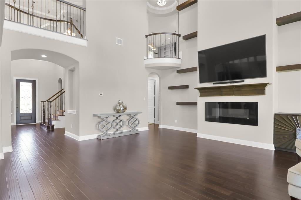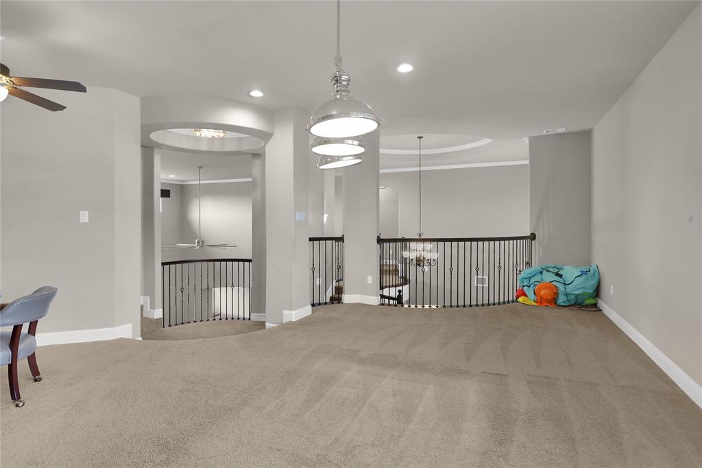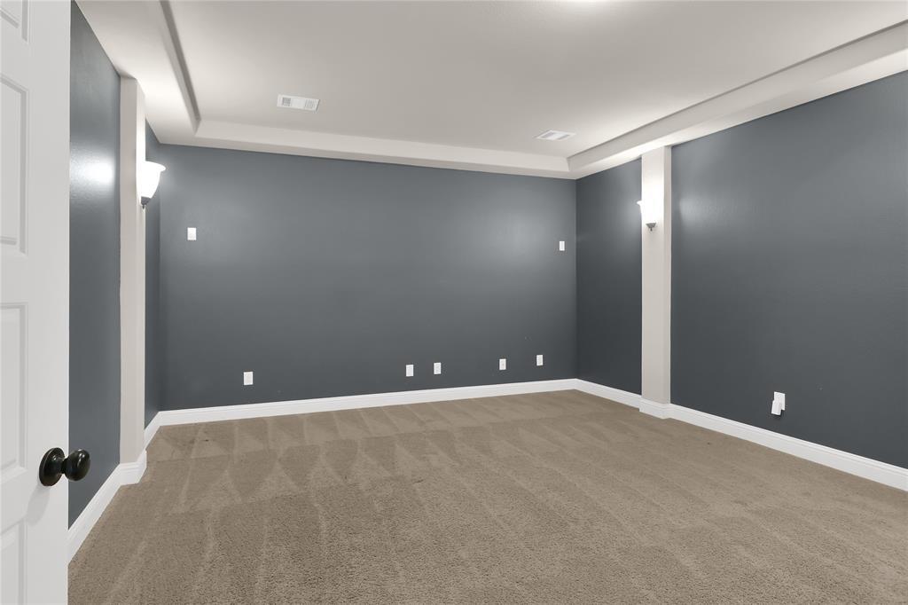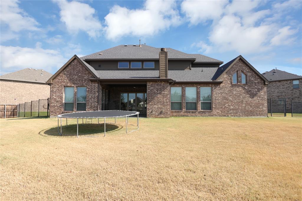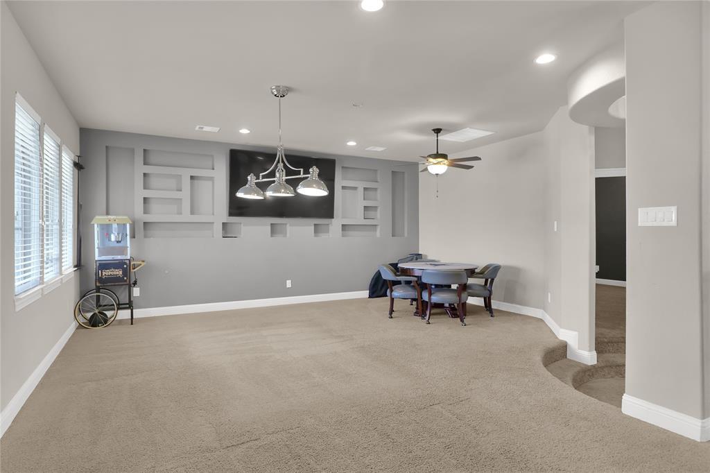 Exquisite John Houston custom home, known as the Carter Floor Plan, located in a gated community. It features 4 bedrooms, 3.5 bathrooms, a home office, and a mud room. The kitchen, living room, and dining area are designed in an open floor plan, boasting impressive 24-foot ceilings in the living room. The kitchen is a culinary enthusiast's paradise, equipped with a level island and breakfast bar, a pot filler, and a gas cooktop. The living room is enhanced by an electric fireplace and bi-fold doors that open to the outdoor patio, creating an ideal space for entertaining. The master suite is generously sized and overlooks the backyard. The master bathroom includes a luxurious soaking tub, dual vanities, a walk-in closet, and a spacious shower. The second bedroom located on the ground floor has its own private entry and a full bathroom conveniently situated nearby, making it perfect for a mother-in-law suite or a teenage child. The covered patio is fitted with a ceiling fan for cooling and a brick gas fireplace for warmth. On the upper level, you will find a game room, a media room with a half bath, and two additional bedrooms that share a full bathroom.