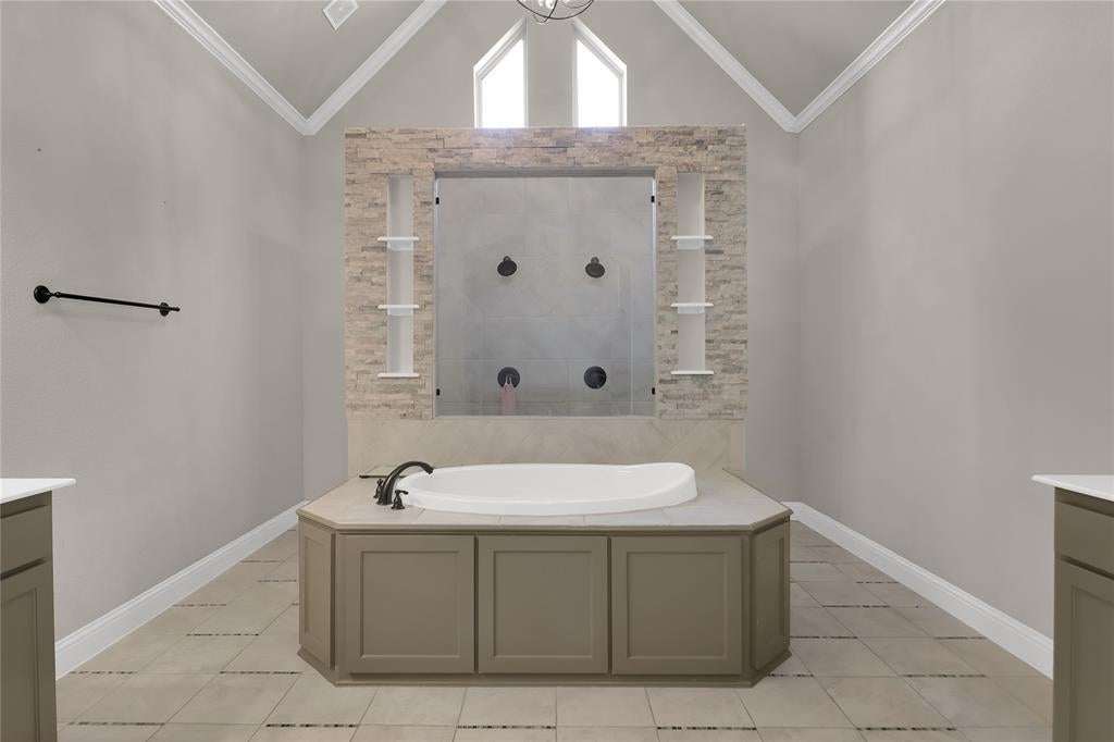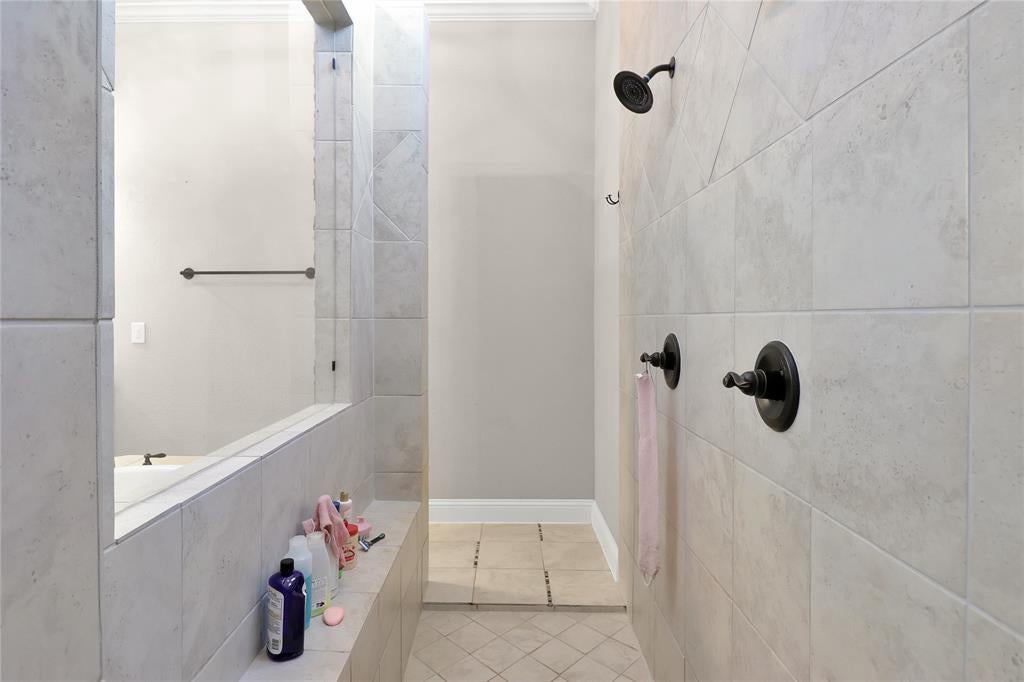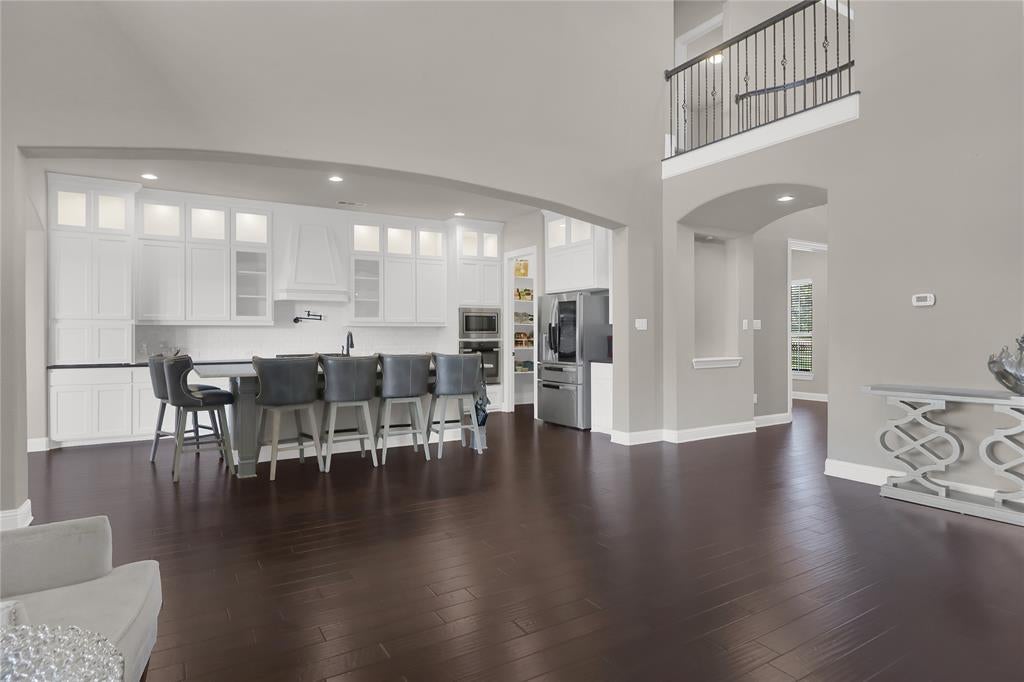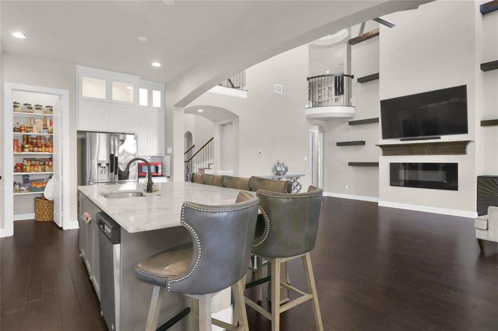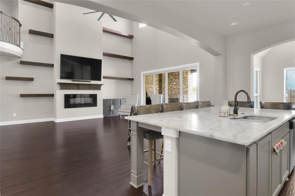 Exquisite John Houston custom home, known as the Carter Floor Plan, located in a gated community. It features 4 bedrooms, 3.5 bathrooms, a home office, and a mud room. The kitchen, living room, and dining area are designed in an open floor plan, boasting impressive 24-foot ceilings in the living room. The kitchen is a culinary enthusiast's paradise, equipped with a level island and breakfast bar, a pot filler, and a gas cooktop. The living room is enhanced by an electric fireplace and bi-fold doors that open to the outdoor patio, creating an ideal space for entertaining. The master suite is generously sized and overlooks the backyard. The master bathroom includes a luxurious soaking tub, dual vanities, a walk-in closet, and a spacious shower. The second bedroom located on the ground floor has its own private entry and a full bathroom conveniently situated nearby, making it perfect for a mother-in-law suite or a teenage child. The covered patio is fitted with a ceiling fan for cooling and a brick gas fireplace for warmth. On the upper level, you will find a game room, a media room with a half bath, and two additional bedrooms that share a full bathroom.
