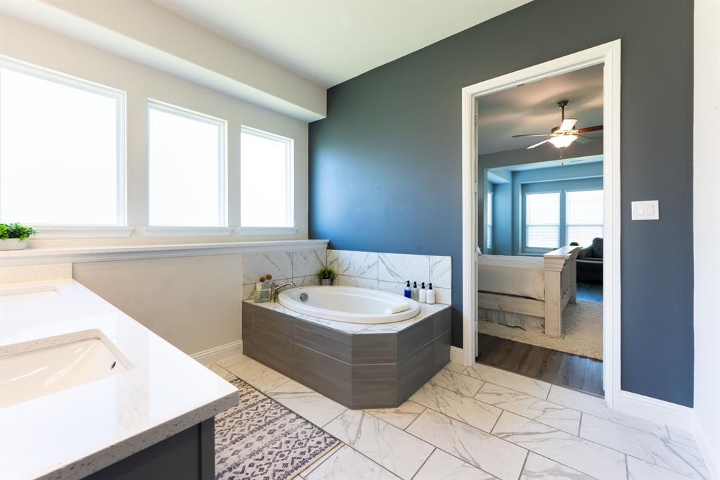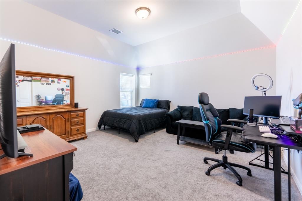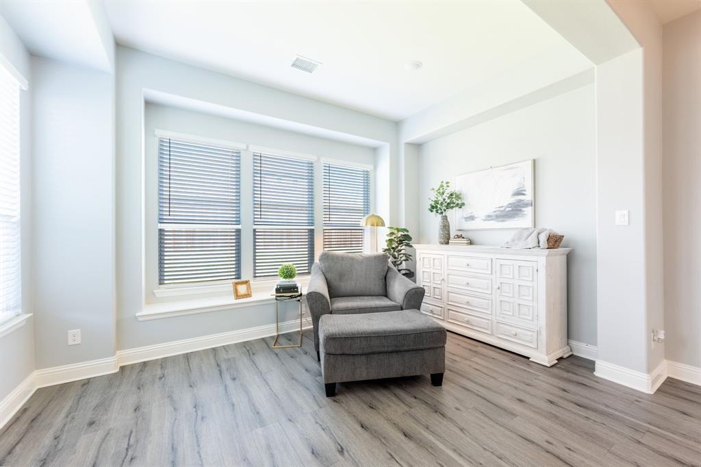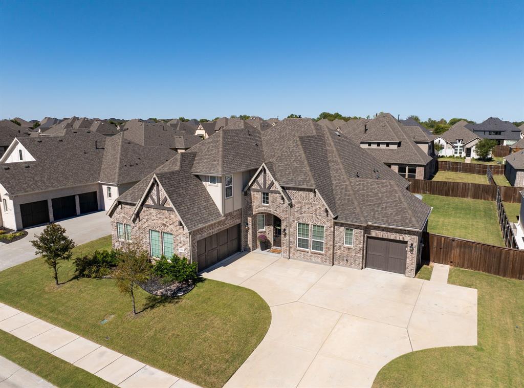Modern design, abundant natural light, and a flexible layout make this Rockwall home stand out. The open living and dining spaces flow together seamlessly and are anchored by a corner brick fireplace, creating a warm and inviting atmosphere for everyday living and entertaining. The kitchen is both functional and stylish, featuring quartz countertops, gray cabinetry, stainless steel appliances, a five burner gas cooktop, and an oversized island ideal for gathering. The primary suite offers a private retreat with a spacious seating area and a spa inspired bath that includes dual sinks, quartz finishes, a garden tub, walk in shower, and a generous closet. A first floor guest suite with a private bath provides an excellent option for visitors or multigenerational living. An additional guest bedroom, full bath, and an impressive office complete the first floor. Upstairs, enjoy a media room, game room, and an oversized bedroom with a full bath, offering flexible space for work, play, or guests. Outdoor living is just as inviting with a covered and extended patio overlooking a private backyard with full irrigation and dual gates. A three car J swing garage completes this thoughtfully designed home that adapts beautifully to how homeowners live today.