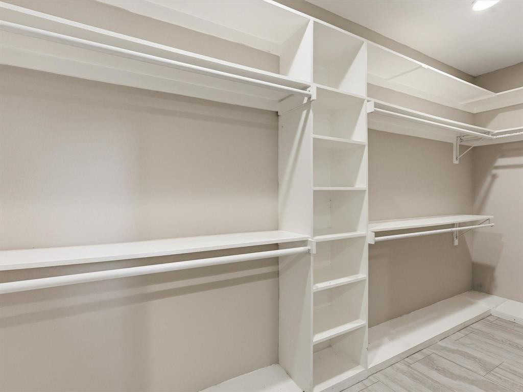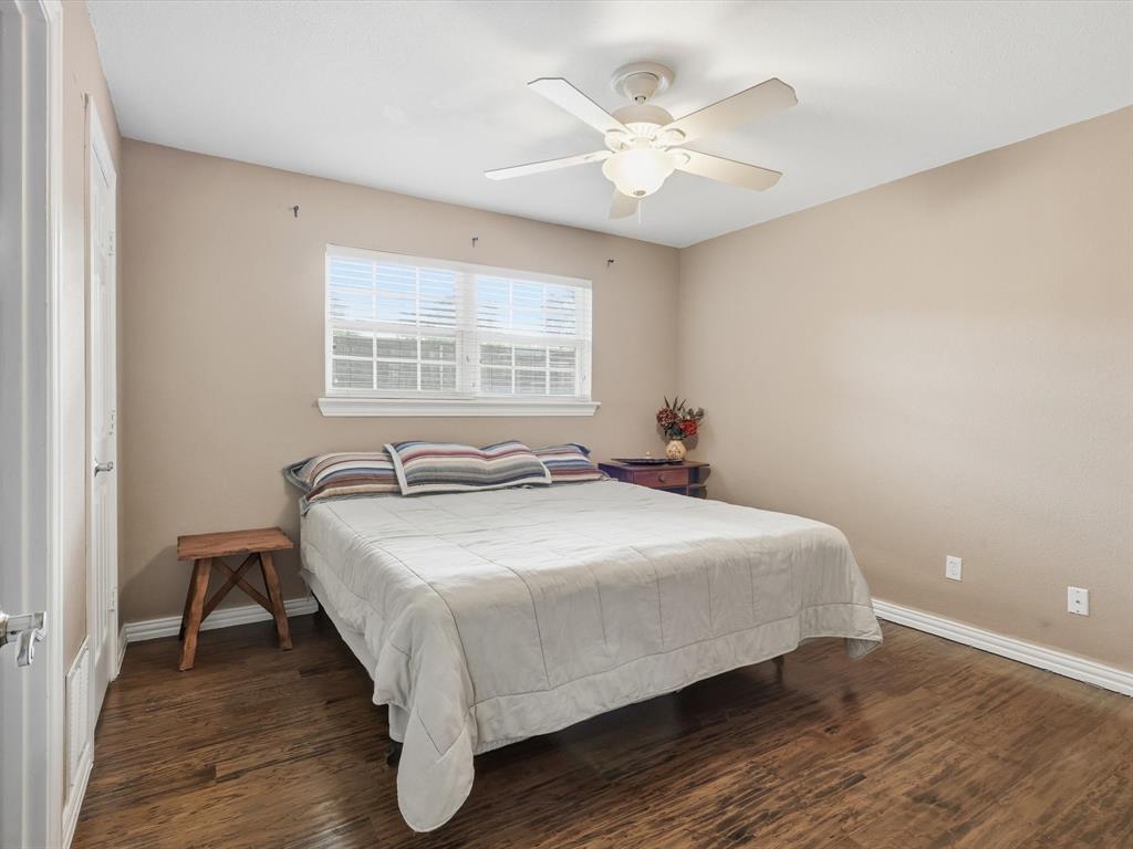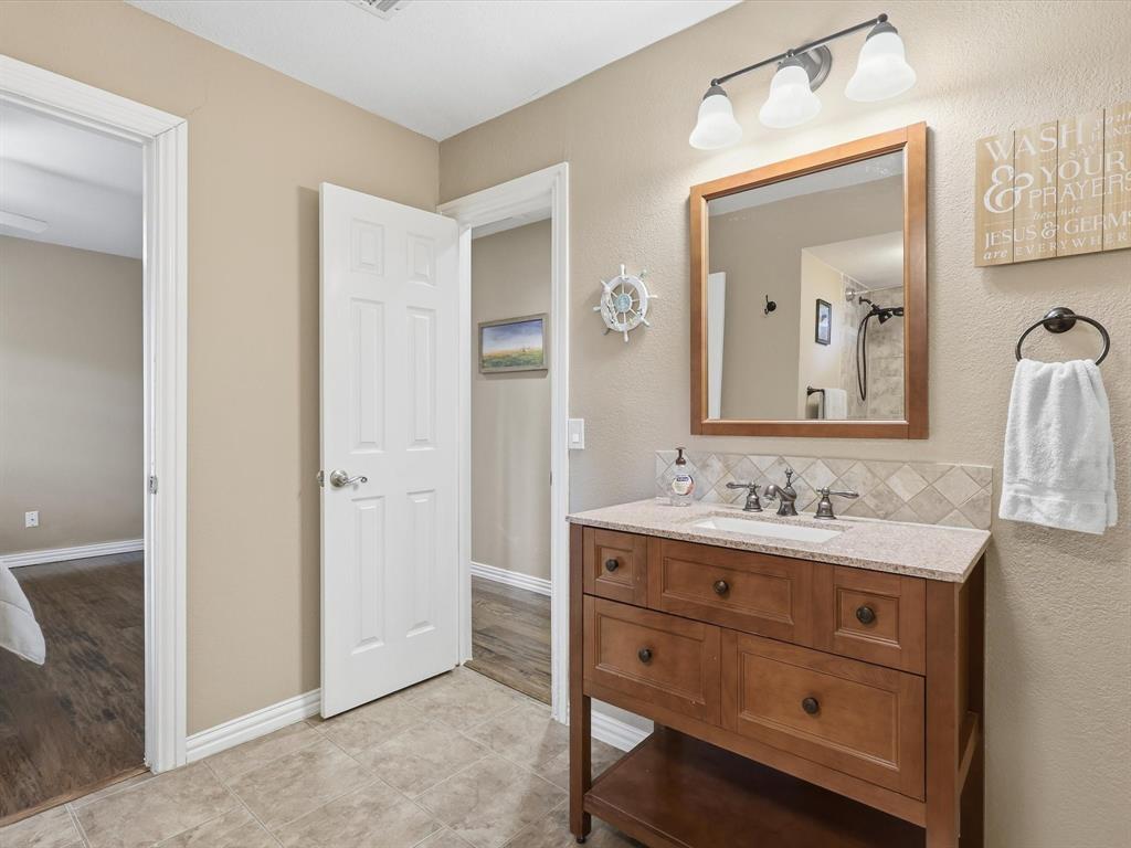 The primary suite overlooks the backyard and pool, featuring a large walk-in shower, dual sinks, granite counters, and an oversized walk-in closet. Additional bedrooms are generously sized and share a Jack-and-Jill bath with updated finishes.