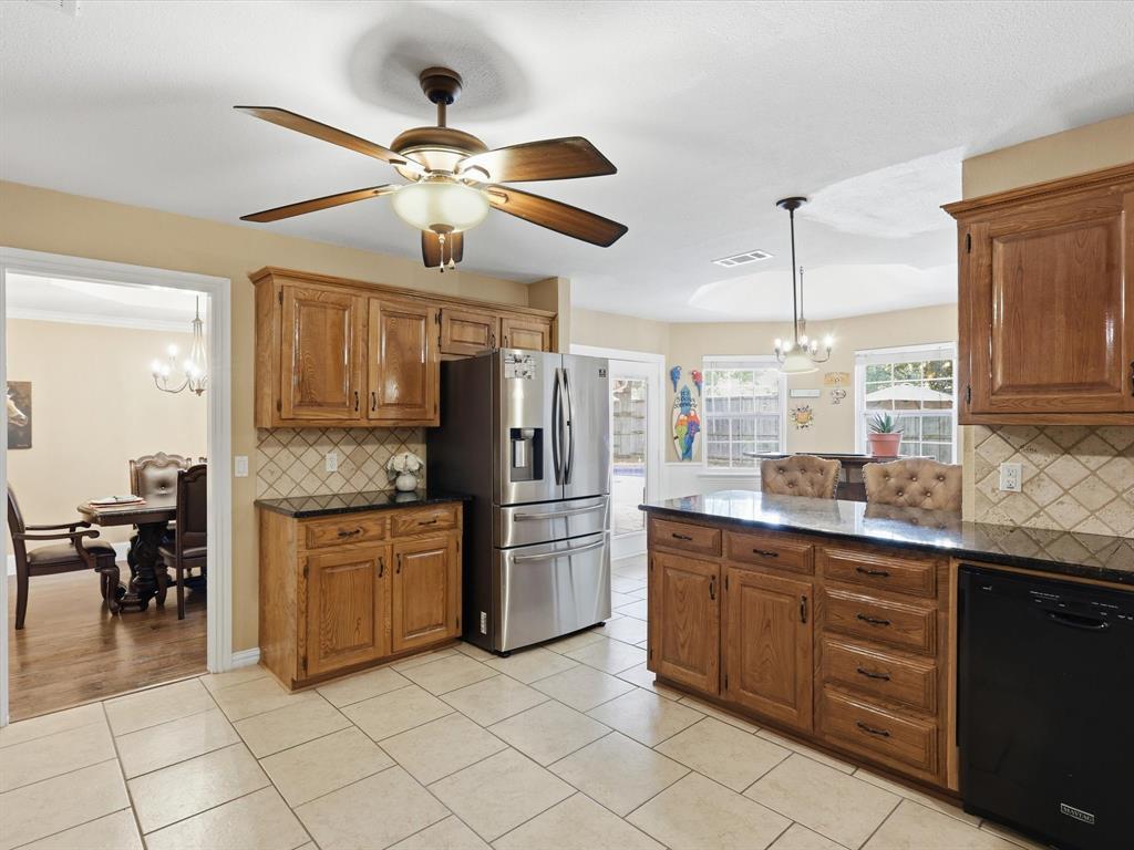 The living room’s stone gas fireplace and vaulted ceiling create a strong focal point, complemented by wainscoting and natural light. The dining area connects to a spacious kitchen finished with granite counters, built-in cabinetry, and double ovens, giving you room and function for everyday cooking and hosting.