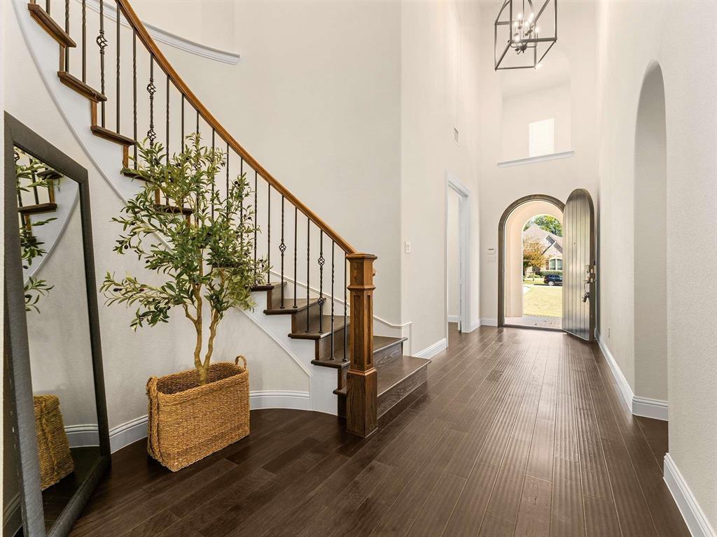 Nestled in the highly sought-after Montgomery Farm neighborhood, this luxurious Darling-built home features a welcoming brick front porch overlooking a serene greenbelt, perfect for quiet mornings or relaxing evenings. Inside, you'll find beautifully designed living spaces with a custom arched front door, hickory wood flooring, LED lighting, quartz countertops throughout, and fresh interior paint. The open-concept layout with soaring 20-foot ceilings centers on a gourmet kitchen with GE double ovens, white cabinetry, a five-burner gas cooktop, farm sink, and a large island with seating, flowing seamlessly into the dining and living areas. The dining room has a gas fireplace, and the living room showcases dramatic ceilings with exposed wood beams. The primary suite on the first floor offers vaulted ceilings, electric shades, and a spa-like bath with dual sinks, separate vanity, and a large walk-in closet. A second downstairs bedroom has an ensuite bath, and a powder room serves guests. Upstairs includes two spacious bedrooms, two full baths, a game room, and a media room wired for immersive entertainment. Outdoor living features an extended stamped concrete patio and two covered areas. Montgomery Farm offers green spaces, walking trails, a clubhouse, and a scenic pond. Additional highlights include a three-car garage, security system with glass break sensors, tankless water heater, 8-foot solid wood doors on the main level, commercial-grade Wi-Fi, Ethernet in every room, surround speakers, and solar-powered attic vents. Tech-savvy buyers will value the whole-home Generac standby generator with automatic transfer switch and Mobile Link wireless connectivity, providing natural gas-powered protection against electrical outages. Truly exceptional in every detail, this home blends elegant design, modern convenience, and a peaceful setting
