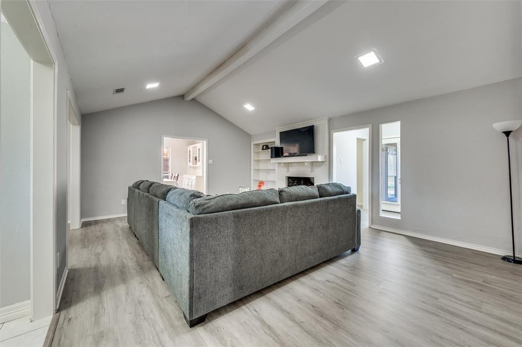 Beautifully Renovated One-story Courtyard Home Featuring Dramatic Architectural Arches, Soaring Ceilings With Steel Beam Accent, Luxury Wood-look Flooring, And A Striking Brick Fireplace.