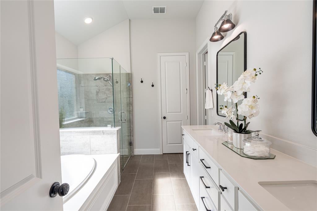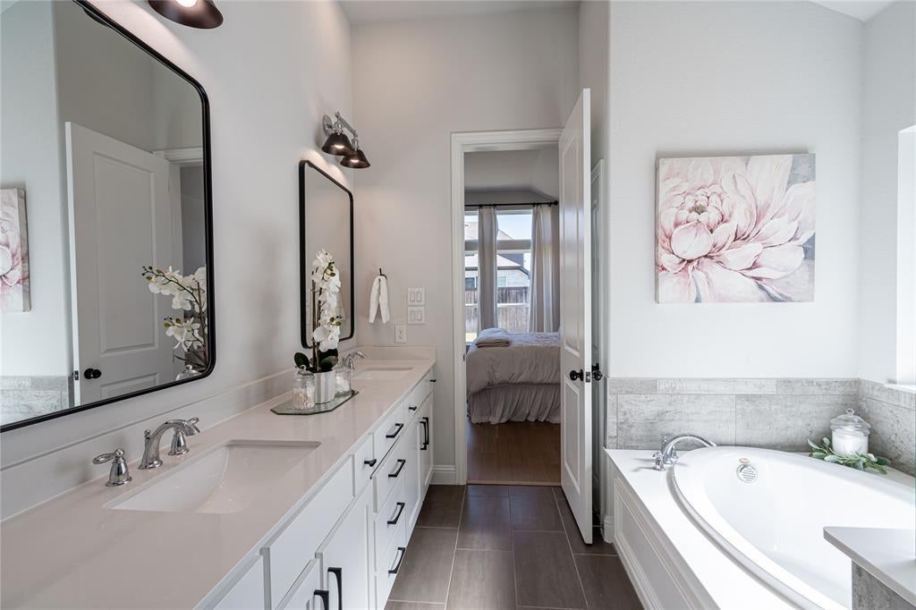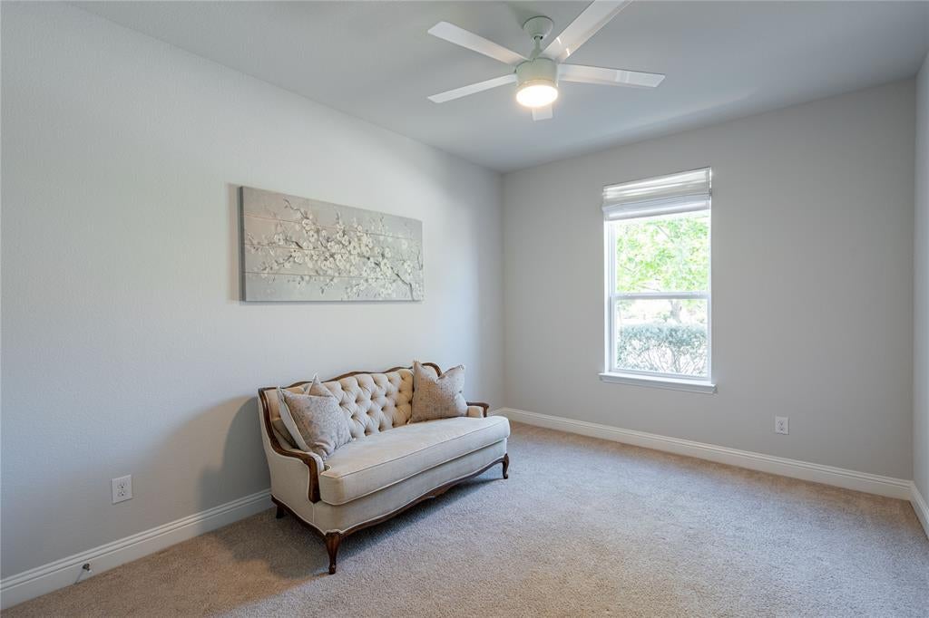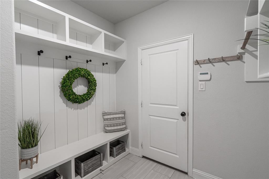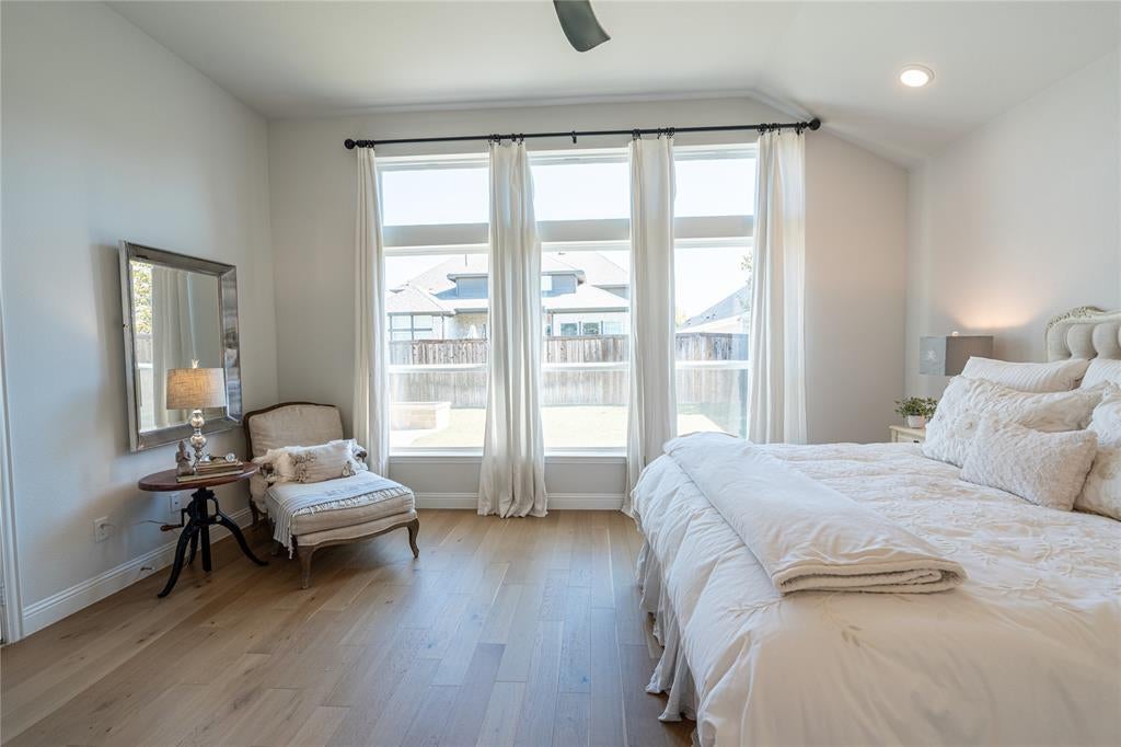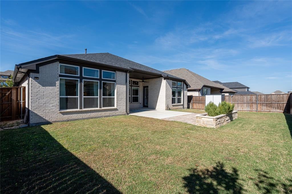 Spacious, well-appointed single-story home in Argyle ISD’s Canyon Falls neighborhood. Thoughtful design delivers an open interior with wide hallways, tray ceilings, and on-trend light wood floors throughout major spaces, creating a seamless flow ideal for everyday living. Off the foyer, a private study with French doors and custom-built-ins offers a dedicated work-from-home space or, with its access to plumbing, makes a great lounge room. The central living area features vertical shiplap above the fireplace and as part of the built-ins, adding architectural detail and a warm focal point. The adjacent kitchen is appointed with quartz countertops, stainless steel appliances, a farmhouse sink, a five-burner gas cooktop, a pot filler, and a large island with pendant lighting. It's a perfect gathering space for family and friends. Bedrooms are arranged in a three-way split configuration for privacy and flexibility. The primary suite boasts direct patio access from the bedroom, while the attached bath offers dual sinks, a frameless shower, and a soaking tub beneath a rain-glass window. Two secondary bedrooms share a full bath, while a third has its own ensuite—ideal for guests or multigenerational living. A powder bath is conveniently located near the living & media rooms for easy access when entertaining. The soundproofed media room is great for movie nights, gaming, or as a versatile flex play room. The utility room features extensive storage, with a shiplap wall including coat hooks, cubbies above and below a built-in bench, and space for an additional refrigerator. Outdoors, the extended covered patio includes ceiling fans, a stone-lined planter, and gas connections for a grill or patio heater. Canyon Falls amenities include pools, splash pad, fitness center, dog park, playgrounds, plus miles of trails. HOA covers front yard care, internet, and cable. Walk to Argyle South Elementary. An inviting blend of comfort and community in a prime location.