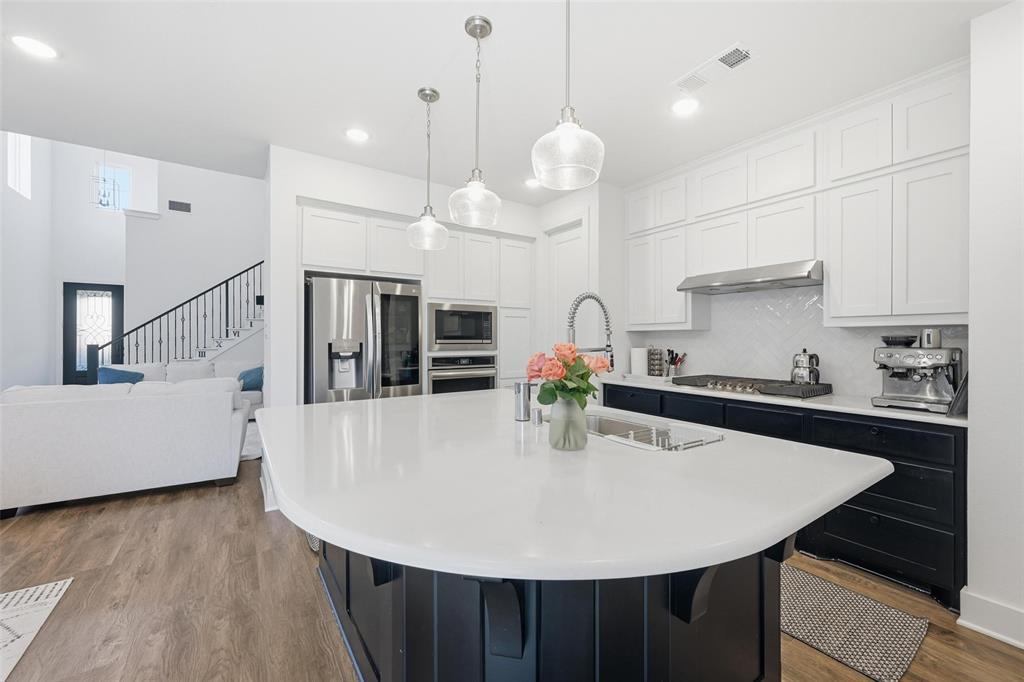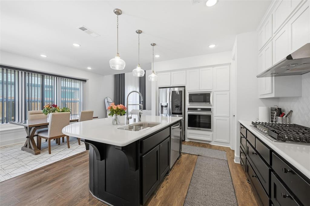 Step inside to an inviting open-concept floor plan featuring soaring ceilings, abundant natural light, and elegant finishes throughout. The gourmet kitchen is the heart of the home, complete with stainless steel appliances, a large center island, quartz countertops, and ample cabinetry—perfect for everyday living and entertaining. The spacious living area flows seamlessly to the dining space, creating an ideal layout for hosting family and friends.