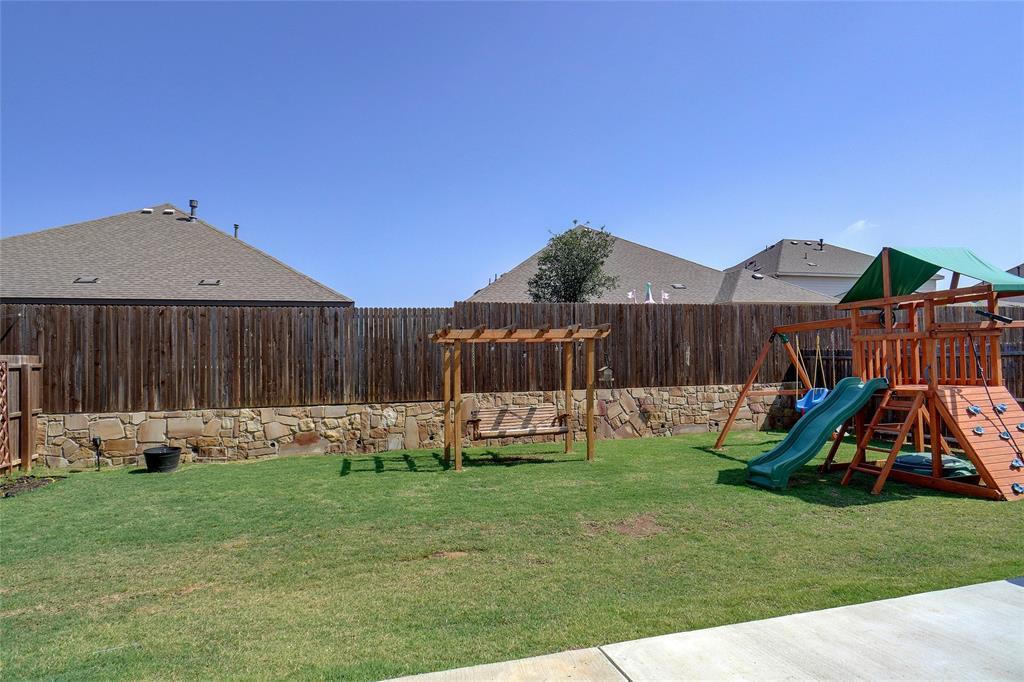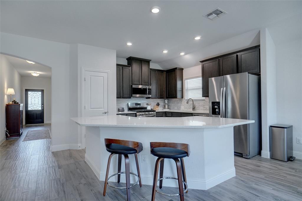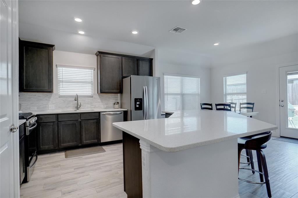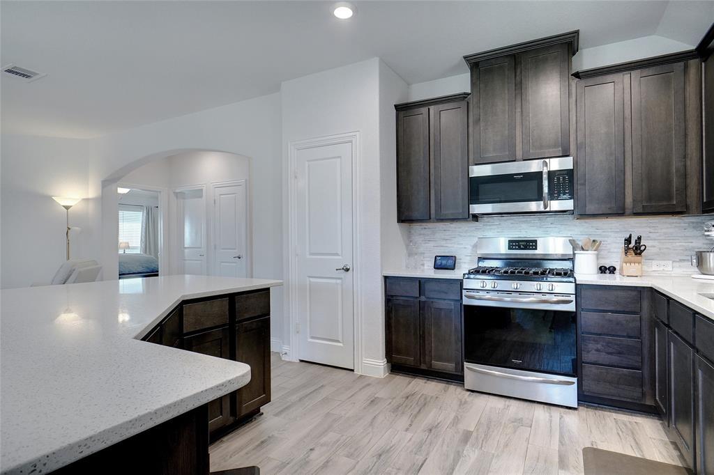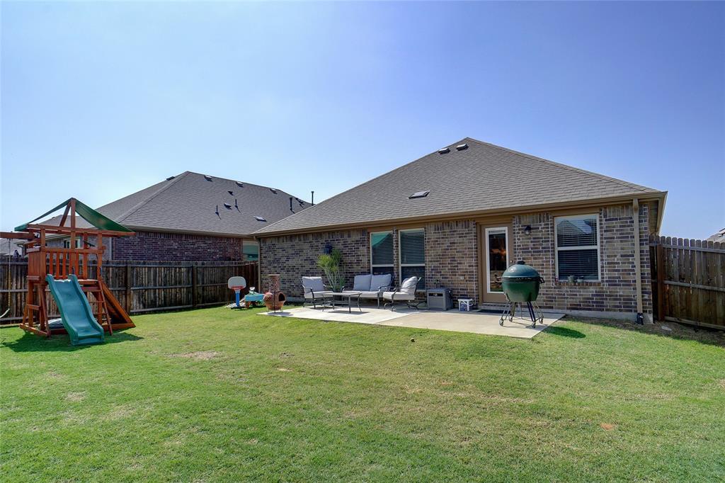 This better than new home comes with many premium features not featured in many of the new builds, such as separate tub & shower in the master bath, wood Like tile flooring and a fireplace. The property has nice curb appeal with stone accent front and attractive raised stone landscape accent bed. Light & bright full brick home located on a quiet interior street just a short walk to park and pool and school in popular Silverado community. Entertain in a totally private backyard with concrete patio extension and space for swing set and trampoline. Extensive wood look tile floors everywhere except 3 carpeted bedrooms, nice living room with accent fireplace wall, open eat in kitchen with pantry, gas range, LED can lights & attractive stained cabinets contrasting with white quartz breakfast bar and ample countertops. Split spacious master suite with WI closet, tub & separate shower, stained cabinets contrast with dual sink white vanity Secondary bedroom accommodates adult size queen bed. Small country hometown feel with welcoming neighbors and minutes away from Main street, HWY 377 and HWY 380, grocery store, restaurants & entertainment.
