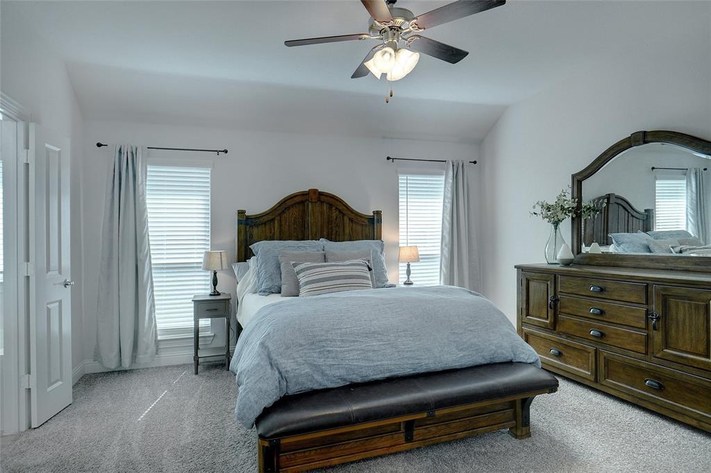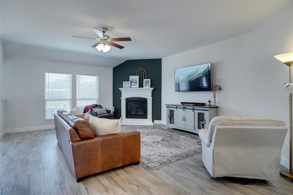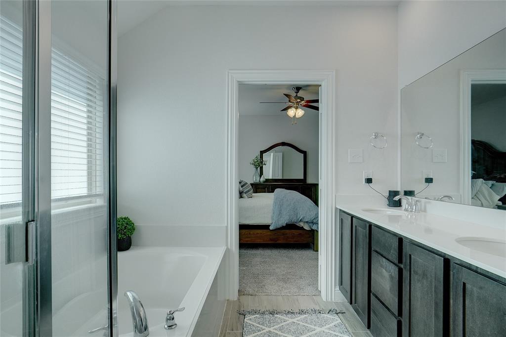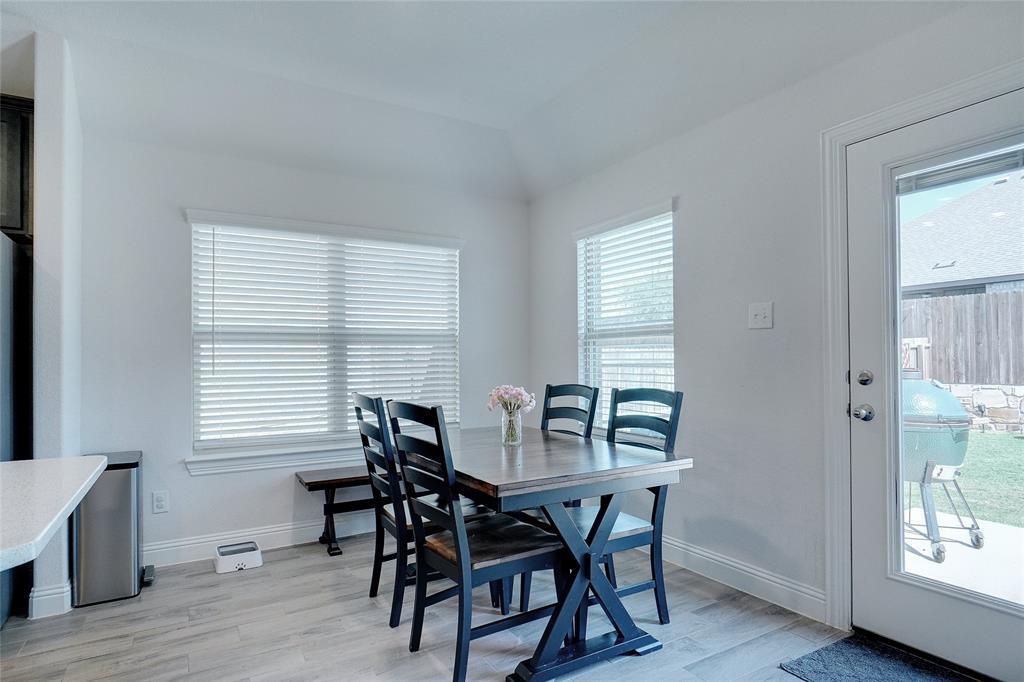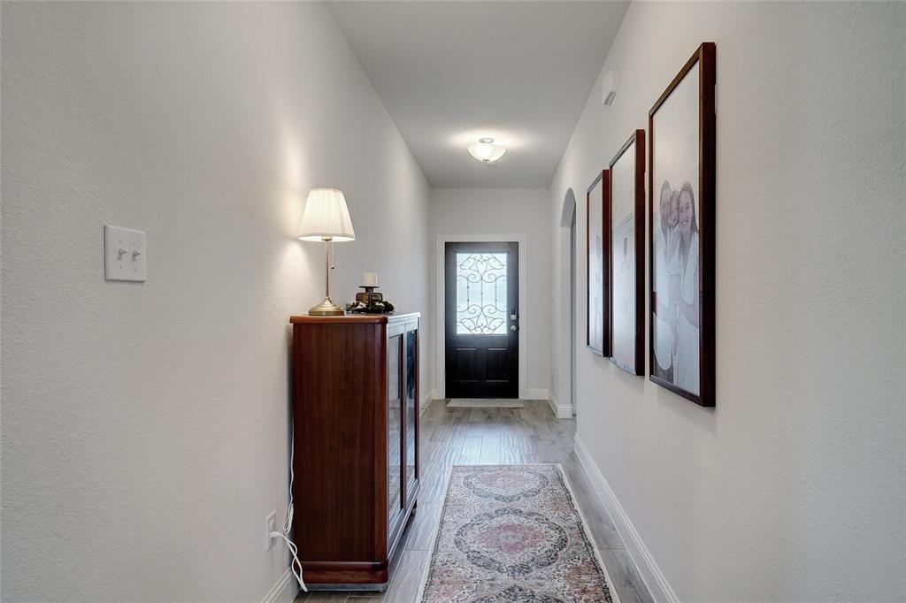 This better than new home comes with many premium features not featured in many of the new builds, such as separate tub & shower in the master bath, wood Like tile flooring and a fireplace. The property has nice curb appeal with stone accent front and attractive raised stone landscape accent bed. Light & bright full brick home located on a quiet interior street just a short walk to park and pool and school in popular Silverado community. Entertain in a totally private backyard with concrete patio extension and space for swing set and trampoline. Extensive wood look tile floors everywhere except 3 carpeted bedrooms, nice living room with accent fireplace wall, open eat in kitchen with pantry, gas range, LED can lights & attractive stained cabinets contrasting with white quartz breakfast bar and ample countertops. Split spacious master suite with WI closet, tub & separate shower, stained cabinets contrast with dual sink white vanity Secondary bedroom accommodates adult size queen bed. Small country hometown feel with welcoming neighbors and minutes away from Main street, HWY 377 and HWY 380, grocery store, restaurants & entertainment.