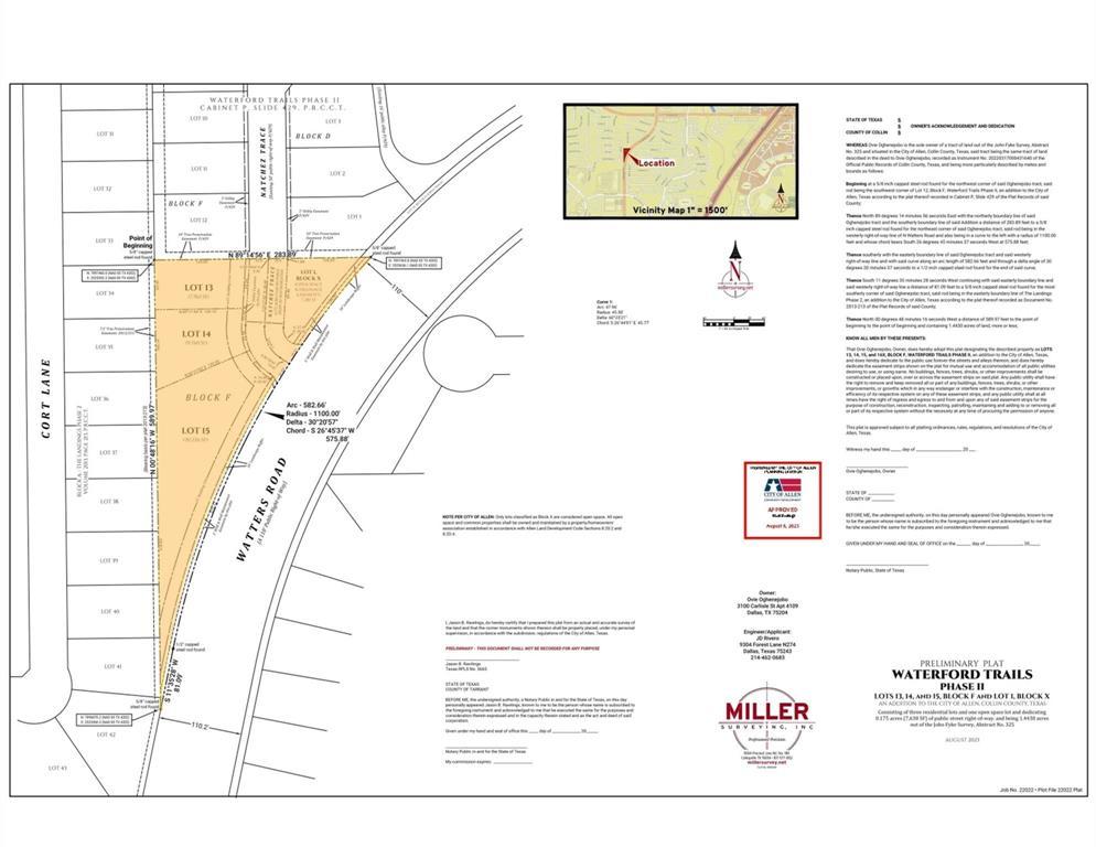 Rare opportunity to own over an acre of land on a cul-de-sac in a private community with no HOA! This spacious lot offers the potential to build up to three residential properties—perfect for a custom estate, multigenerational living, or a savvy investment. Preliminary plans were previously approved (now expired), and a buyer has the option to easily reinstate them, streamlining the development process. Ideally situated near premier shopping and dining at Watters Creek Village and Allen Premium Outlets, exciting entertainment at Allen Event Center, and abundant outdoor recreation at Celebration Park, Bethany Lakes Park, and Oak Point Park & Nature Preserve. With quick access to Highway 75 and Sam Rayburn Tollway (121), and located within the highly rated Allen ISD, this property combines privacy, convenience, and incredible potential.