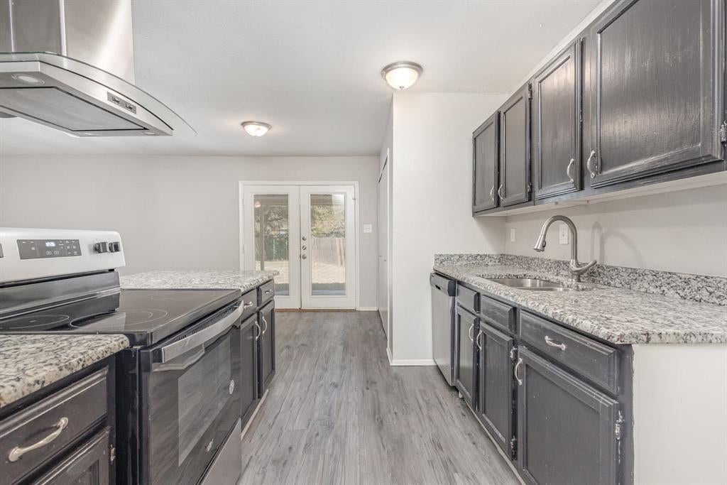 This charming single-story home offers 3 bedrooms and 2 baths, featuring granite countertops in both the kitchen and bathrooms. The kitchen is equipped with stainless steel appliances, an electric range with an updated range hood, and stylish black cabinetry for a modern touch.