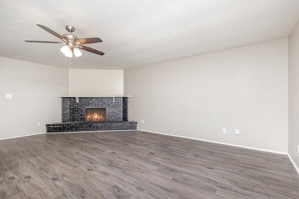 The spacious living room includes a striking brick fireplace, creating a cozy focal point. Ceiling fans are located throughout the home for added comfort. French doors in the dining area open to a covered patio and a fully fenced backyard—perfect for outdoor entertaining or relaxation.