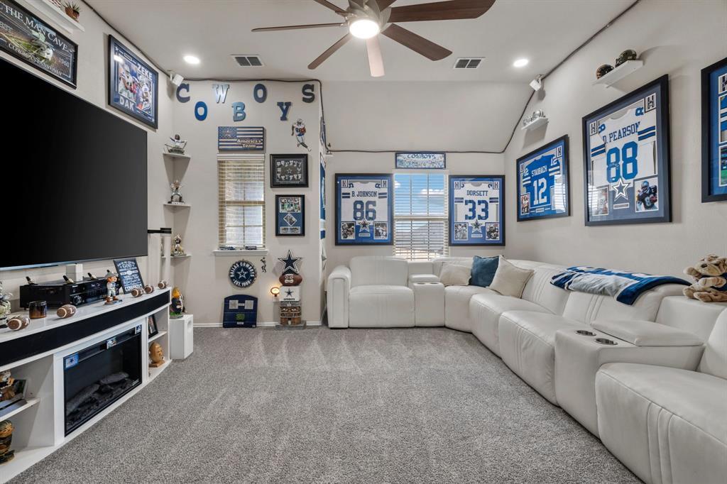 Upstairs, you’ll find a large loft, ideal for additional living space, plus three full bathrooms that ensure functionality and flexibility for the entire household. Outdoor living truly stands out here. The backyard showcases a fully decked-out smart pool complete with a waterfall, hot tub, and color-changing lighting that can all be controlled directly from your phone. Enjoy the new 2025 backyard sod, expanded deck, and working sprinkler system, all contributing to a clean, refreshed outdoor space perfect for relaxing or entertaining. Energy efficiency is a major highlight — this home includes fully paid-off solar panels that will transfer to the next owner, providing ongoing utility savings and environmental benefits. Curb appeal has also been enhanced with fresh landscaping and updated exterior details, creating a welcoming first impression the moment you arrive. This property delivers space, upgrades, efficiency, and incredible outdoor amenities — all in one move-in-ready package. Schedule your private showing today to experience everything this home has to offer. MOTIVATED SELLERS ALL APPLIANCE STAYING AND A 100 inch TV