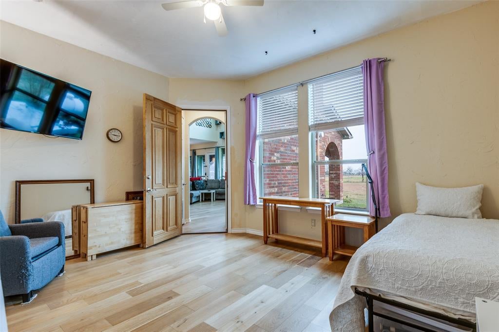 Enjoy almost 4 acres and bring your horses! Country living, yet close to the city! The gated entrance with automatic gate has a long driveway that leads to the beautiful custom home! This spacious home featuring stone and brick offers 4 - 5 bedrooms, a 3 car garage, and tons of storage! The front has a beautiful, grand entrance with gorgeous steel doors! The foyer has a stunning curved staircase, soaring ceilings and a Juliet balcony. The living area boasts a beautiful fireplace, views of the back yard and pasture, and is open to the spacious kitchen and breakfast area. The kitchen features custom cabinets, a moveable island, breakfast bar, pantry, and is plumbed for gas. The primary bedroom has a separate sitting area and a large bath with spacious shower and separate vanities. The first floor also features another bedroom with full bath. The utility room currently has a second refrigerator, stackable washer and dryer, and an upright freezer. Upstairs you will find two more bedrooms (one was formerly a media room and can be converted back), a second living area, and Juliet balcony area that could be a lovely sitting area. There is attic area upstairs that the previous owners said has an add'l 300 sf for another bed and bath. This is an amazing home that has so much to offer!