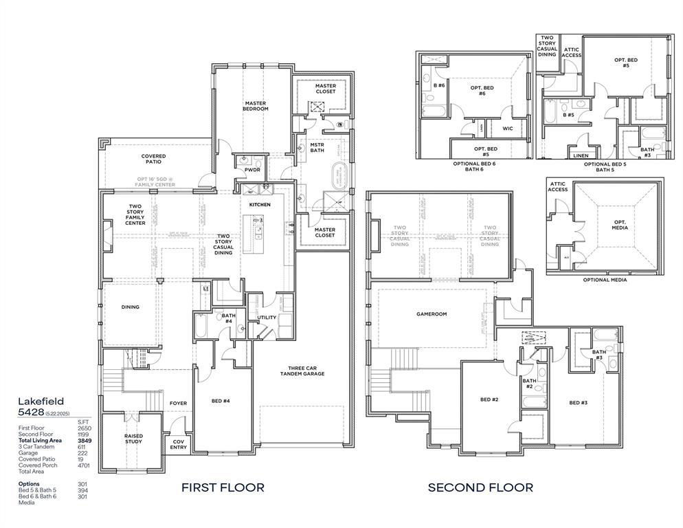 Popular Lakefield floor plan with an open-concept design featuring dramatic two-story family room ceilings and a fireplace. The beautiful gourmet kitchen offers ample cabinetry and a spacious walk-in pantry. Extra storage under the stairs provides a fantastic use of space. The spacious downstairs master retreat boasts high ceilings and a generously sized master bathroom with a separate freestanding tub, shower, and linen closet. There is also a separate downstairs en suite and a raised office study. Upstairs includes a game room, media room, and three additional bedrooms, each with its own bathroom.