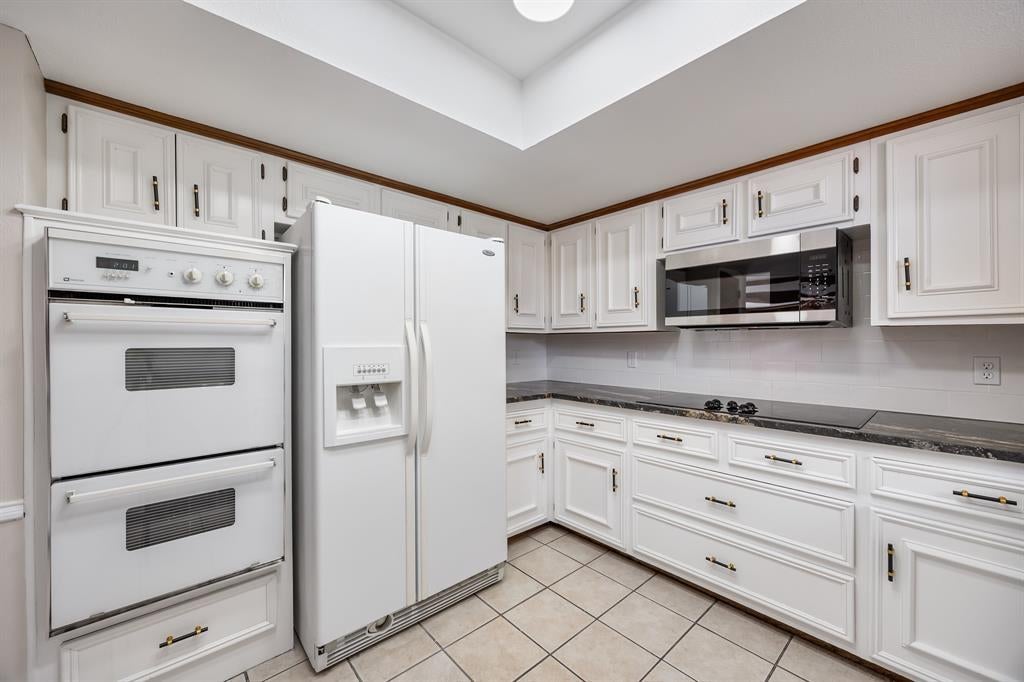 space, electric cooktop, double ovens, and refrigerator. The adjoining breakfast room is ideal for casual