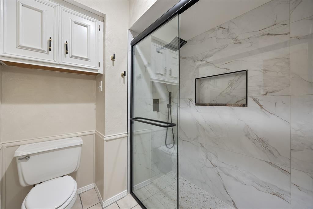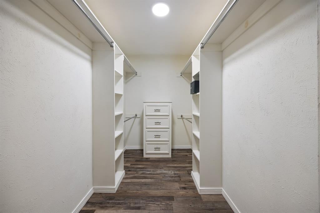large walk in shower and closet with shelving and built-in dresser. So much to offer, and